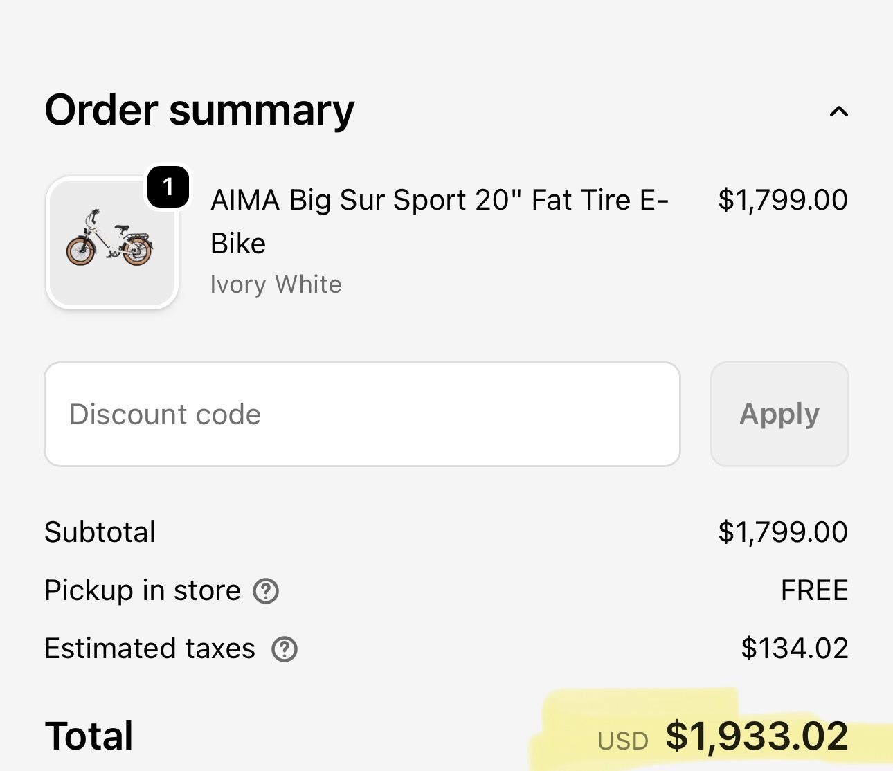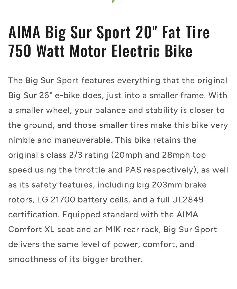 New. (2) New Aima Big Sur Ebikes. $1500 each. Color is white. These are both still in box. 710241081. Please see pictures for additional information. SUNDAY INQUIRIES WILL BE ANSWERED ON MONDAY
