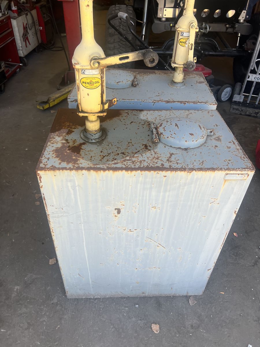 2 oil storage containers with manual pumps. No leaks, no rust on inside, and working pumps. $350 a piece or $600 for the pair