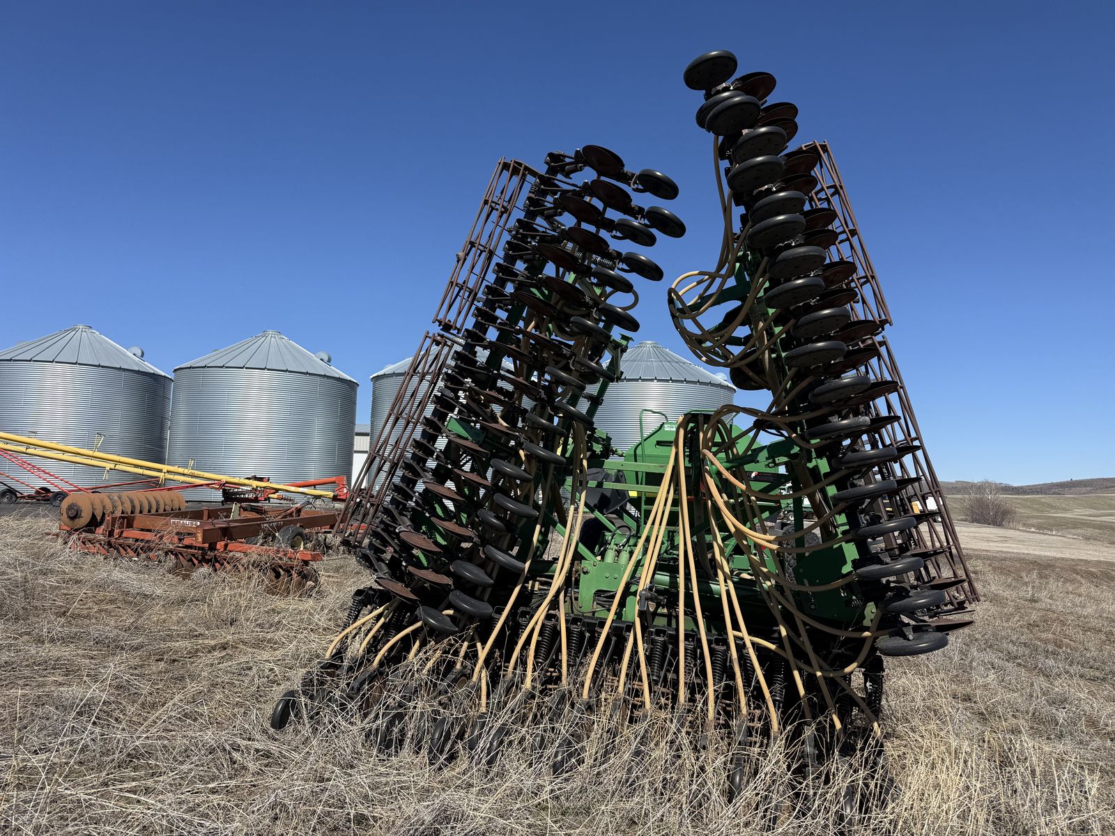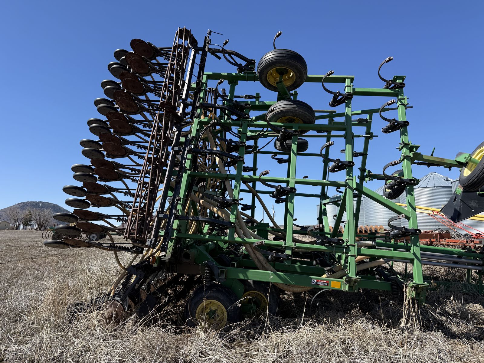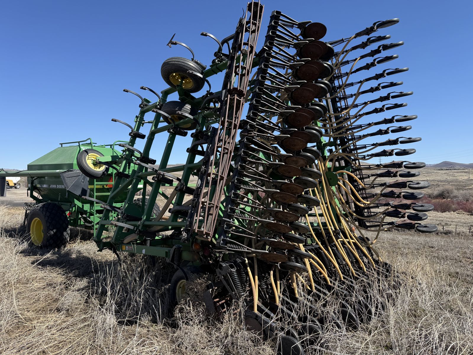 ApplePayJohn Deere 787 Air Cart with two compartments and ground drive meters paired with 36ft cultivating 730 Air Disk Drill, openers on 7.5 inch centers. One-pass tillage + seeding system (leading shanks with knock-on sweep brackets + rear double-disk openers). Comes with original John Deere monitor to view fan speed and control tank meter clutches.