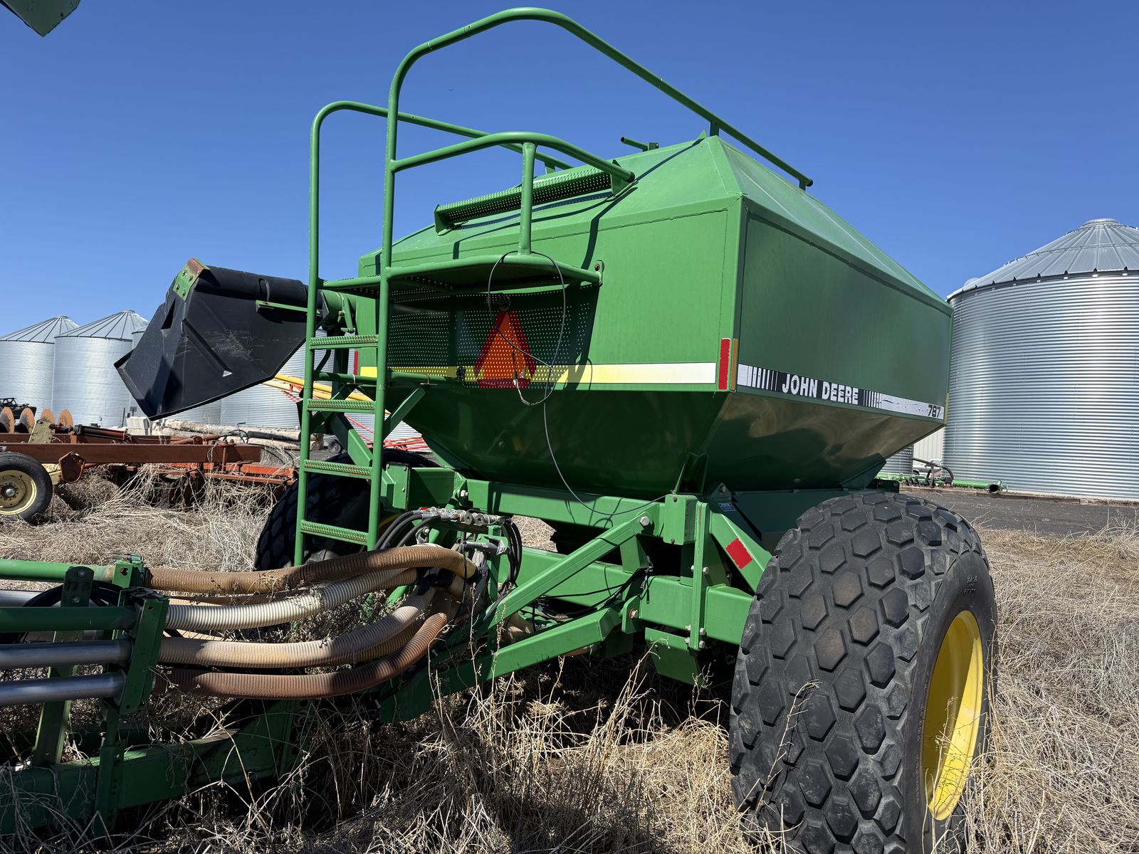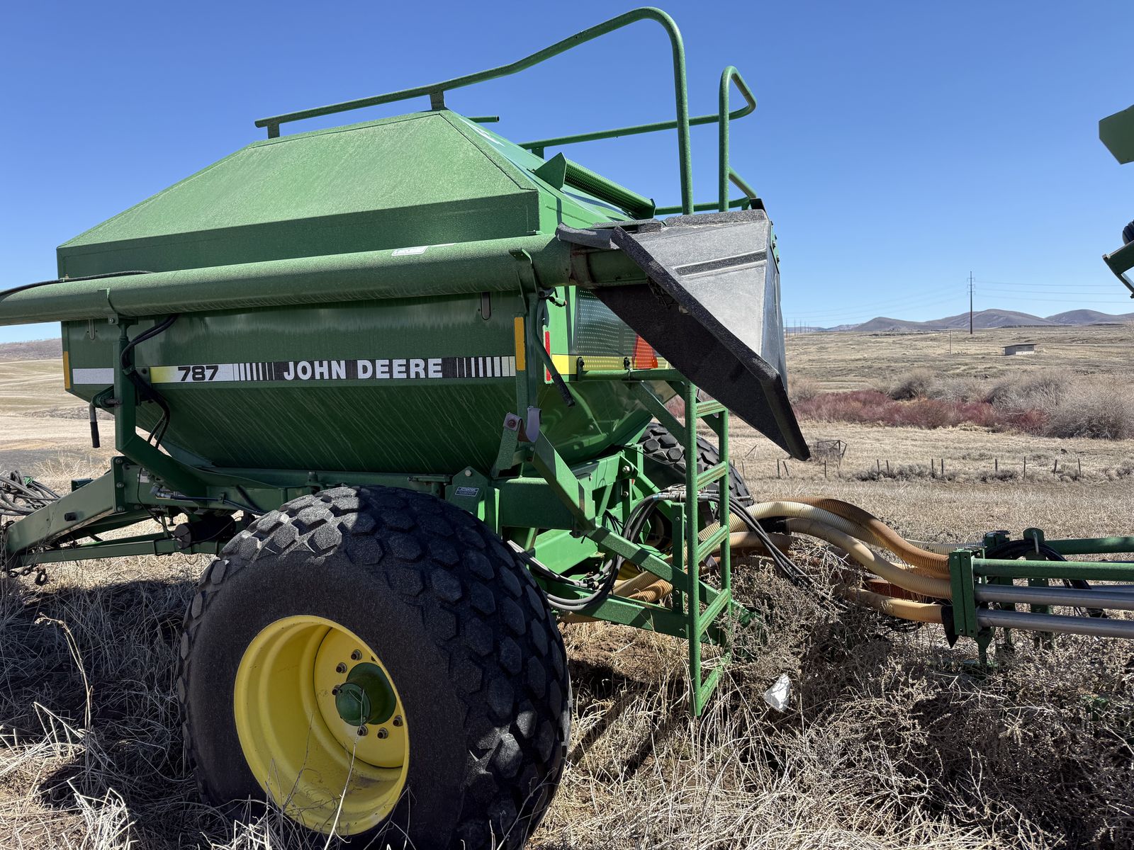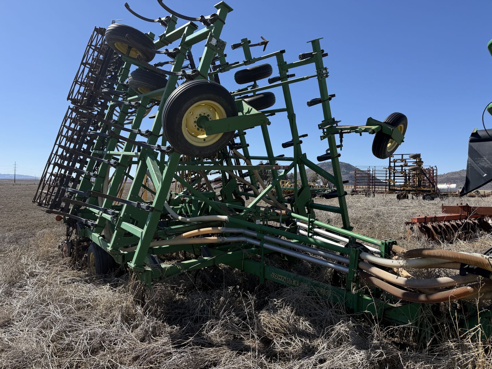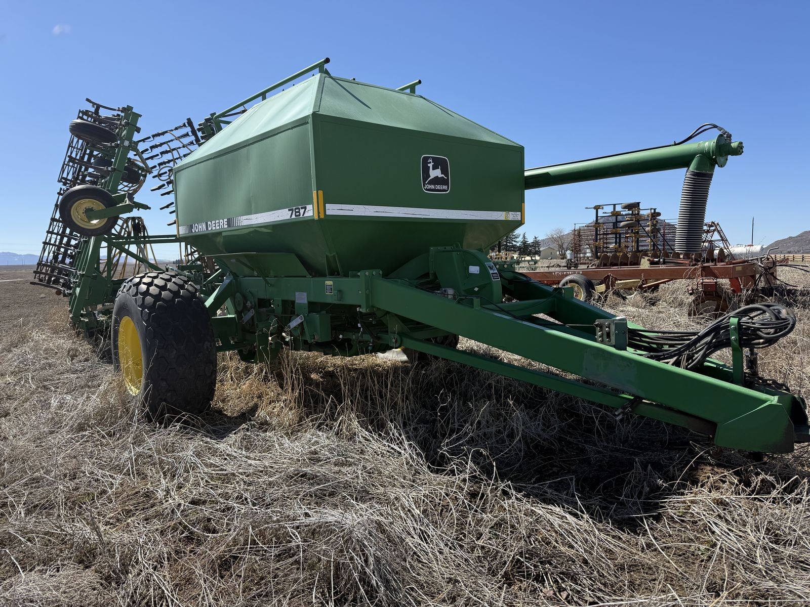 ApplePayJohn Deere 787 Air Cart with two compartments and ground drive meters paired with 36ft cultivating 730 Air Disk Drill, openers on 7.5 inch centers. One-pass tillage + seeding system (leading shanks with knock-on sweep brackets + rear double-disk openers). Comes with original John Deere monitor to view fan speed and control tank meter clutches.