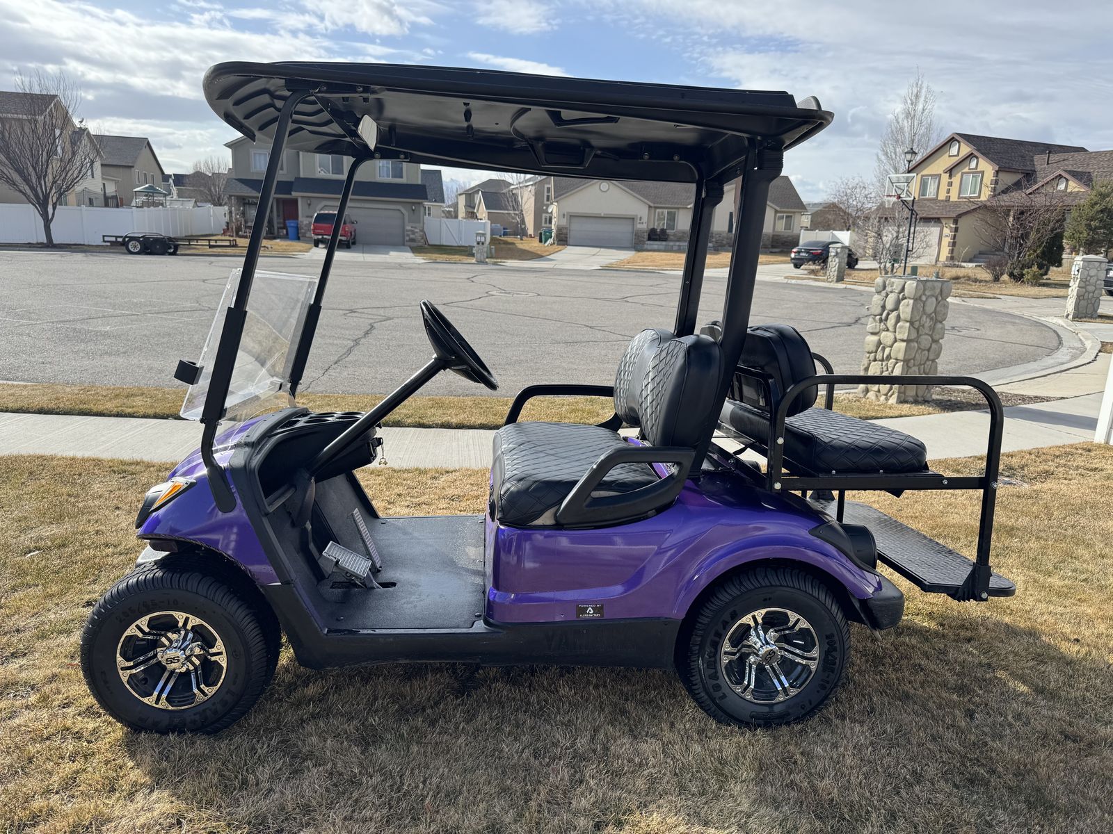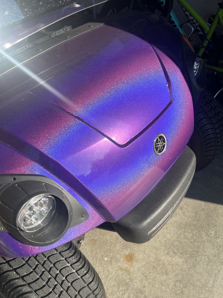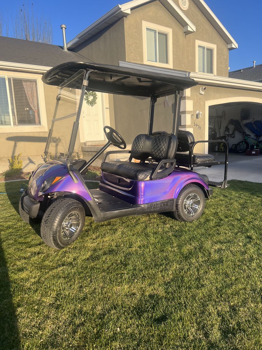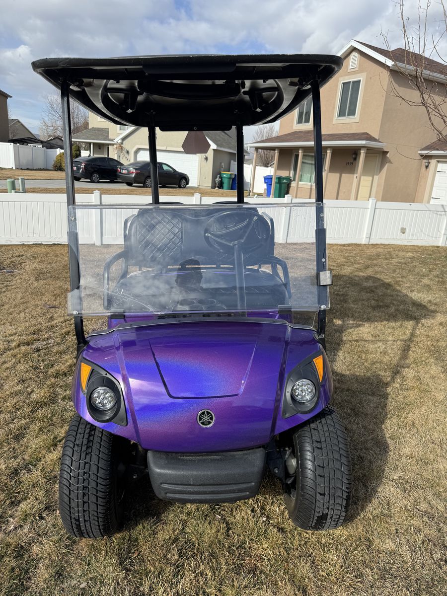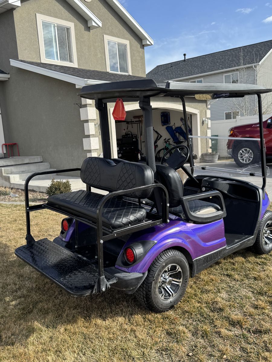 2016 Yamaha golf cart with beautiful sparkling purple wrap. Upgraded 10 inch wheels and new tires. Black seat covers. BRAND NEW Allied 48V LITHIUM 105 Ah battery. Headlights/taillights installed. Has flip-down backseat/flatbed. Yamaha speed code uploaded, so it goes 21+mph. Battery often lasts several days for us. Our family just doesn’t use it anymore.