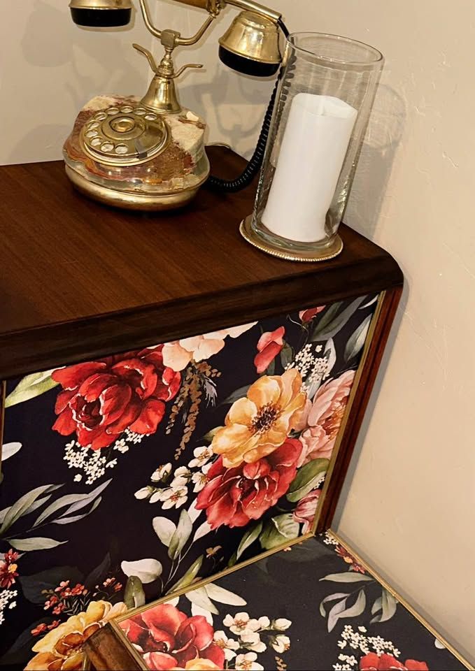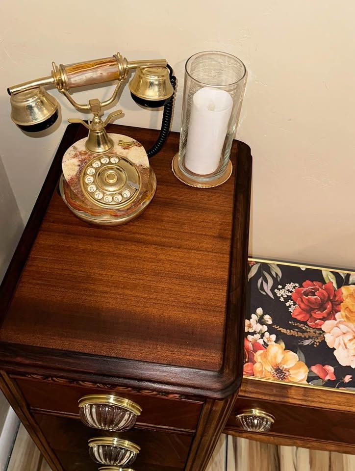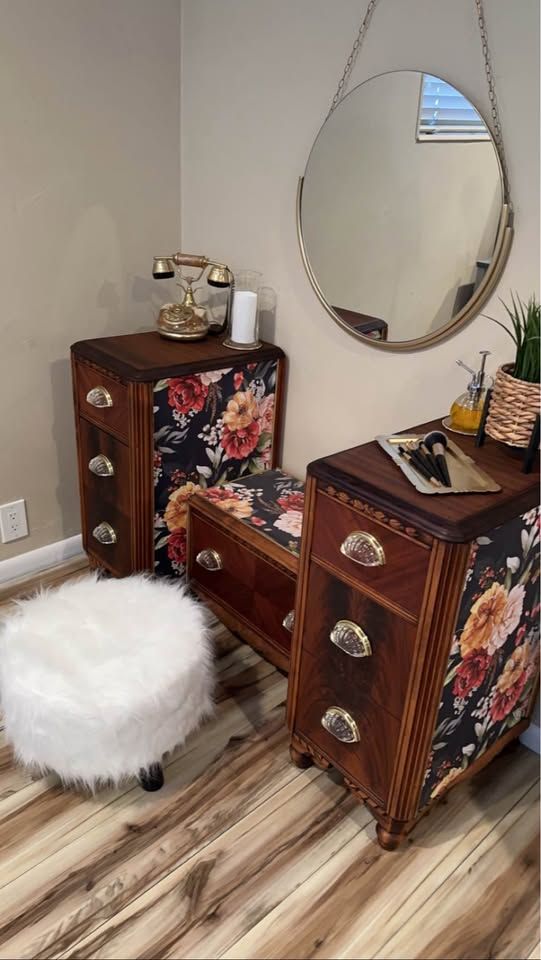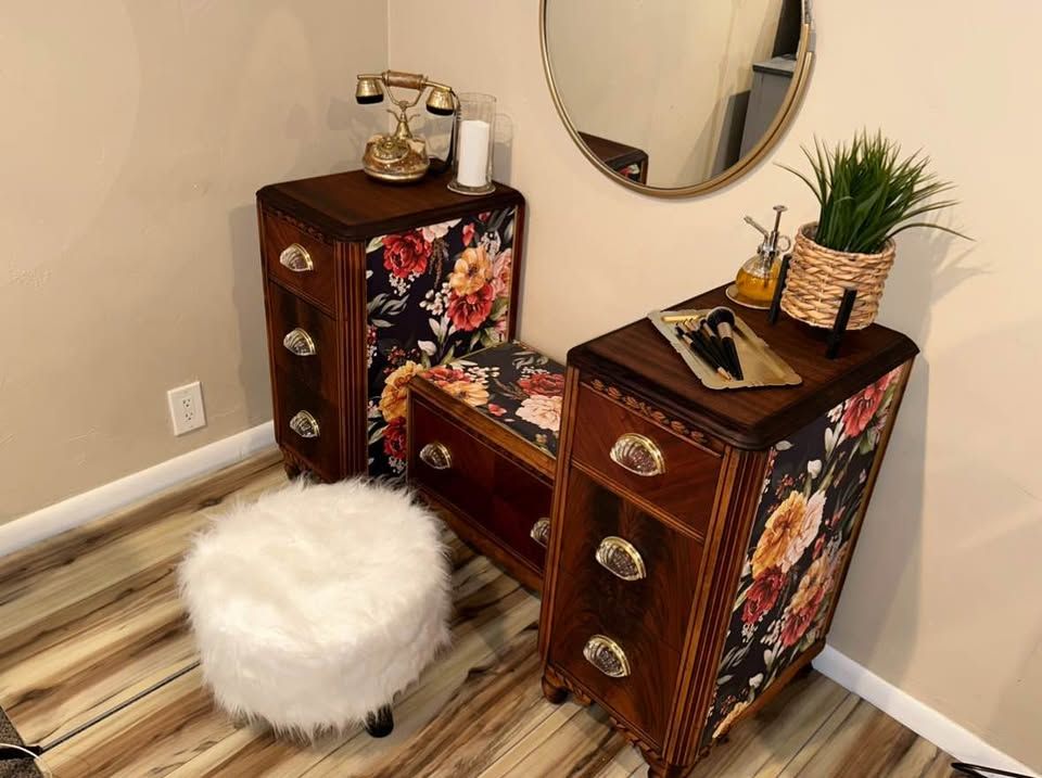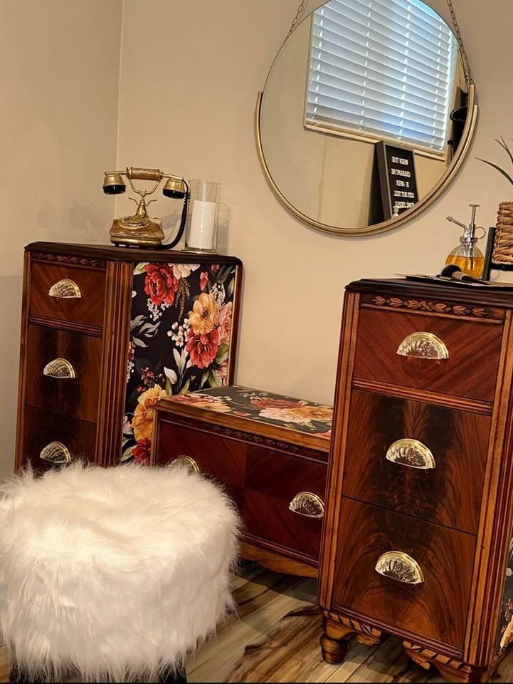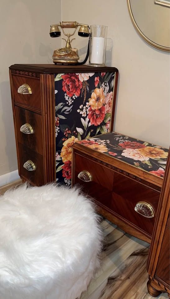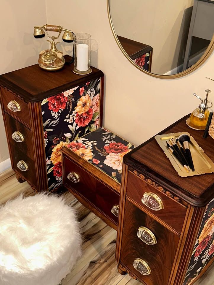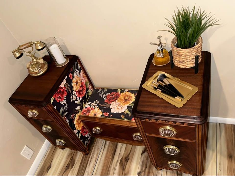 VenmoGorgeous 100 year old restored Vintage Art Deco vanity. This rare antique vanity is stunning and will complete any room. It was made in the early 1920’s by the company “Built By John Since 1891”. The vanity is walnut and the veneer on the top of each side is the restored original veneer. For being a century old it’s in phenomenal condition. The drawers slide open and close smoothly and the beautiful floral print is a high end textured wallpaper. The original hardware was missing pieces and was replaced with beautiful Glass pull handles and a gold base.