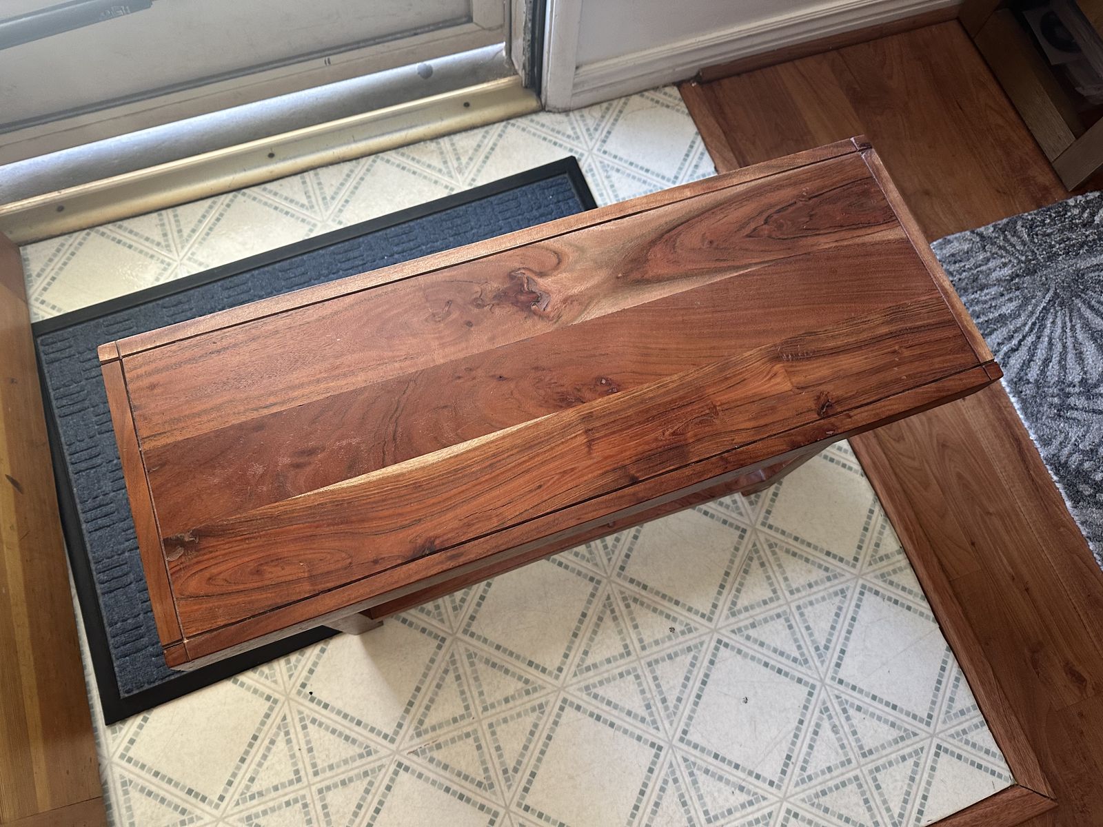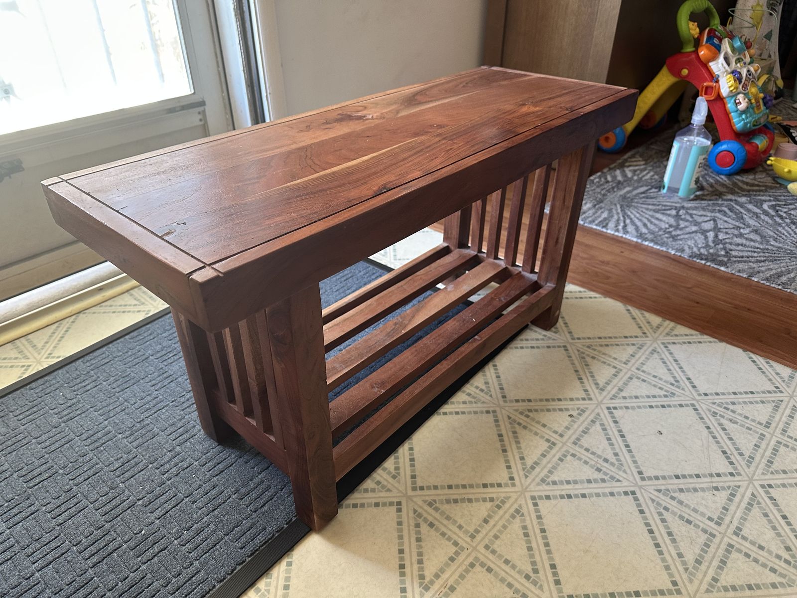 VenmoWooden bench with a reddish brown stain and shelf for storage Dimensions: 32” length across 12” depth 17” height