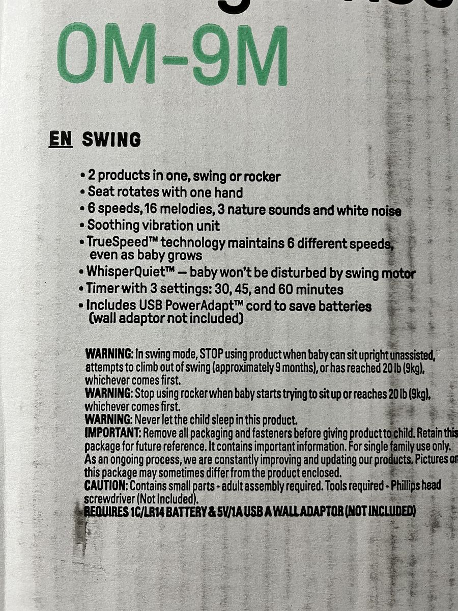 New swing works great. Runs on AC adapter, not batteries. Bouncer can be removed from swing and be used as a separate rocker. For questions, send a message. More pics of assembled swing coming soon.