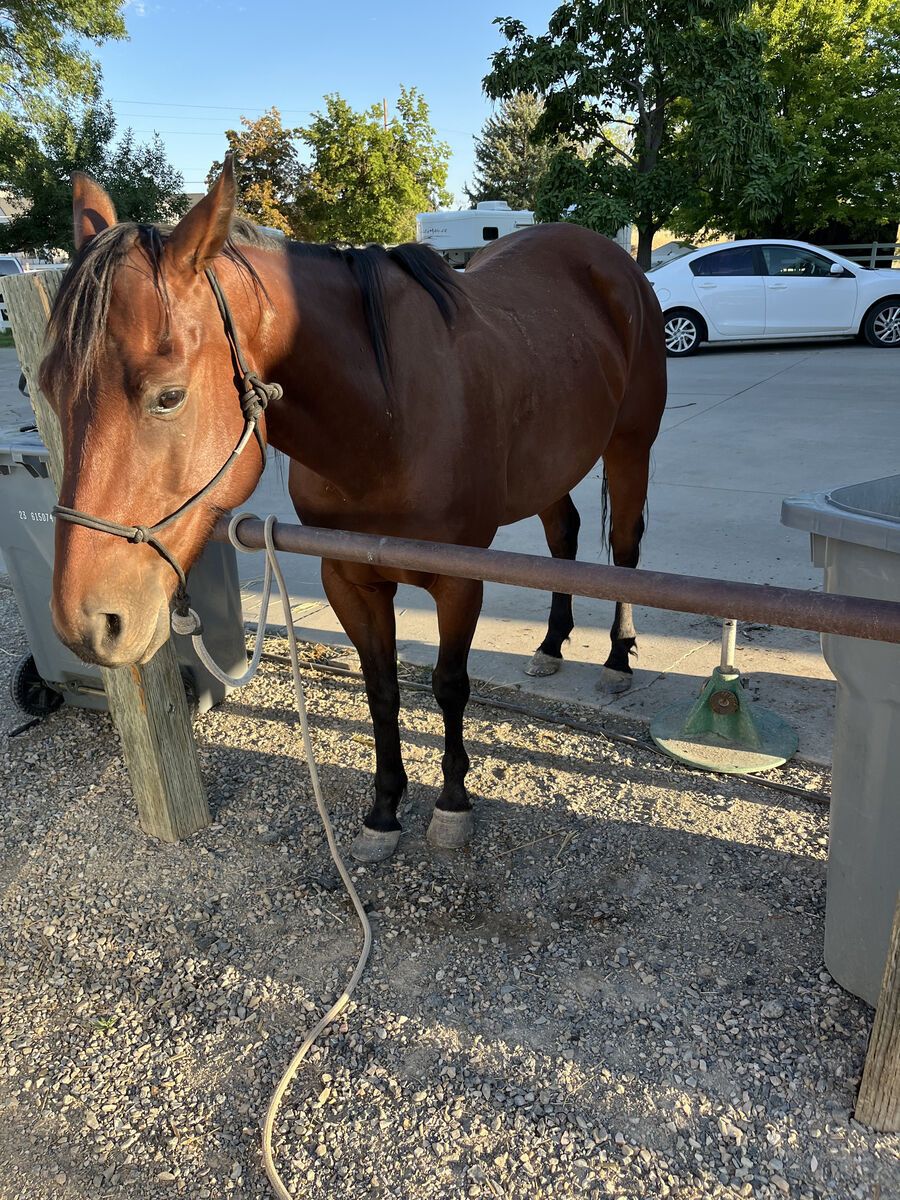 He jumps in the trailer, is great with his feet, ropes, tarps, obstacles, cattle, etc. He is the top of the pecking order with the herd and gentle with people.
