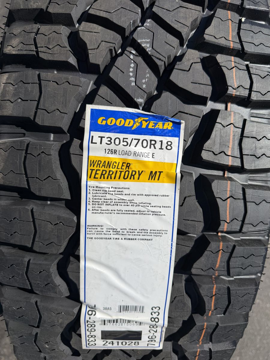 Tires are Goodyear Wrangler Territory 305/70R18 which is roughly 35x12x18 10 ply Load Range E 126 load rating 80 psi rated