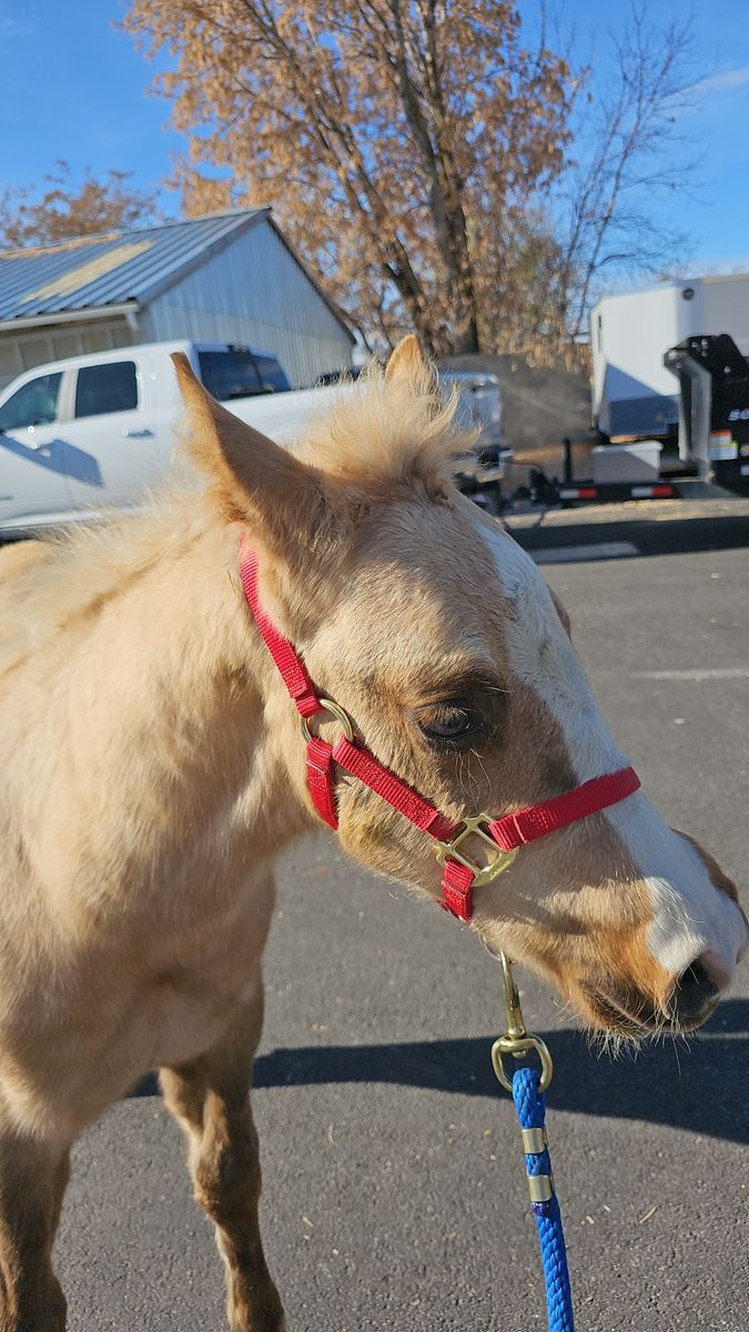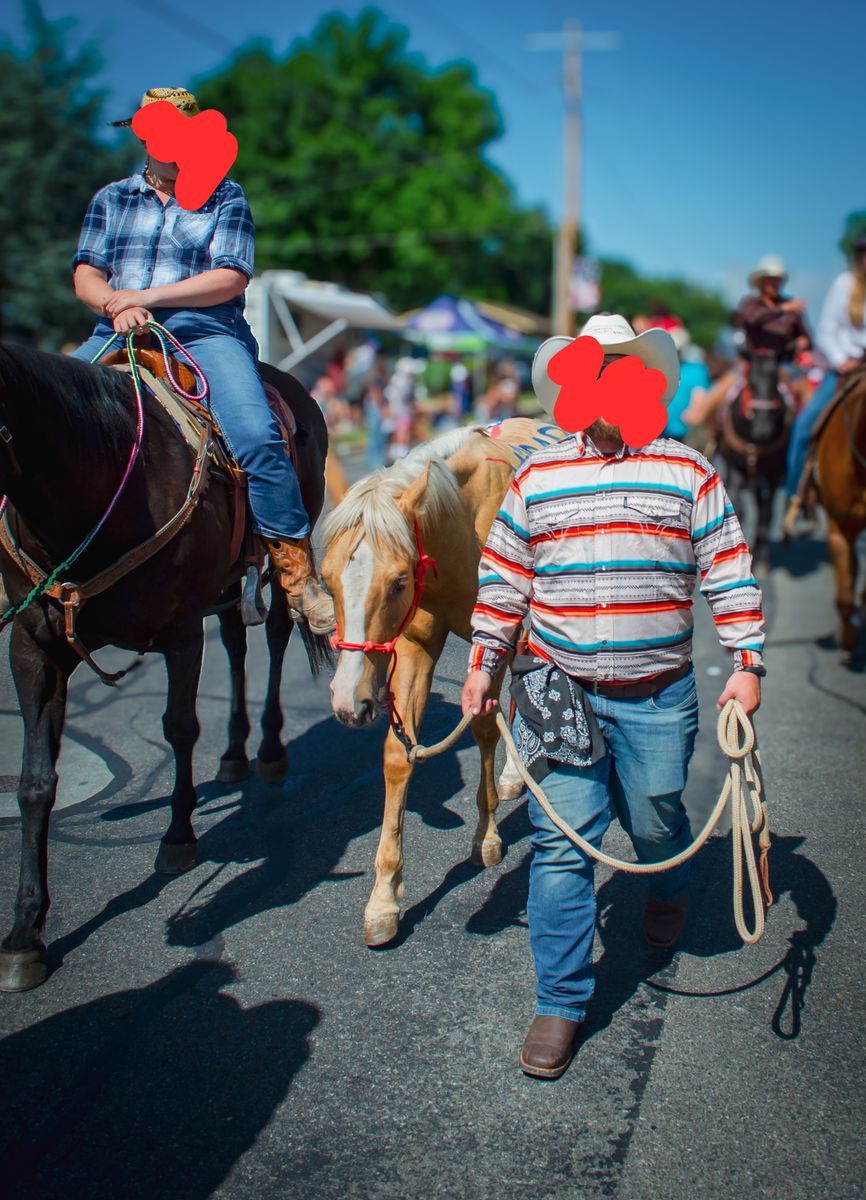 Finn will be 2 years old in August; he's a grade gelding. We have handled him since the day he was born. He roundpens, leads, lunges on a lead line, backs, yields his hindquarters, and has had the saddle on him several times. He will load in the trailer and has been walked in parades last summer. He has been in our lesson program with studnets learning to train several times a week over the last 4 months.
