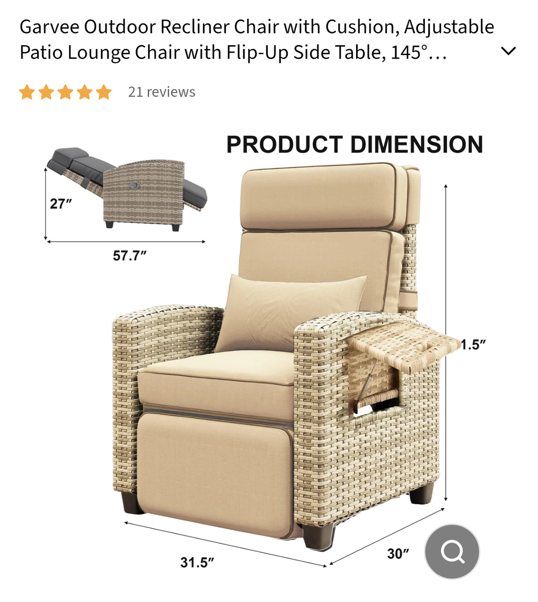 Garvee Outdoor Recliner Chair with Cushion, Adjustable Patio Lounge Chair with Flip-Up Side Table, 145° Reclining Backrest & Footrest, All-Weather PE Wicker, for Deck, Balcony, Poolside, Porch. Brand new and still in the box. Text preferred 3854367246