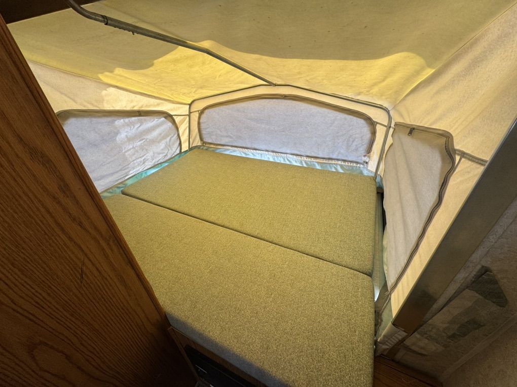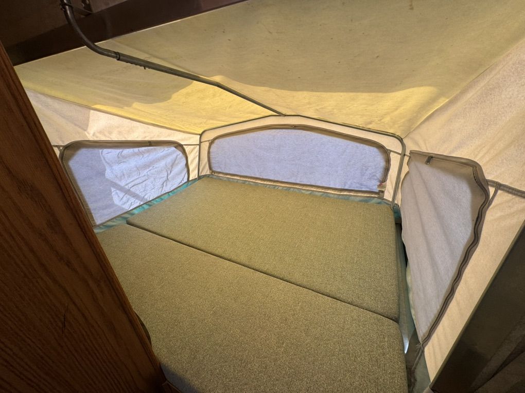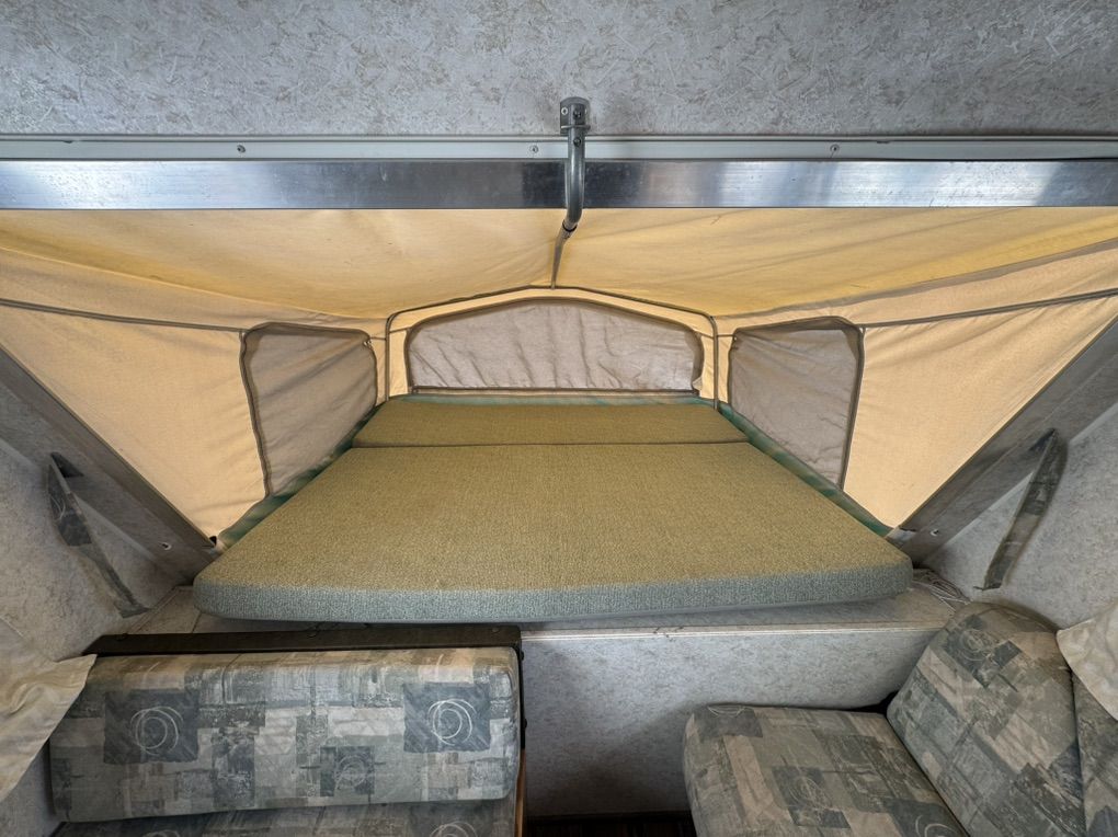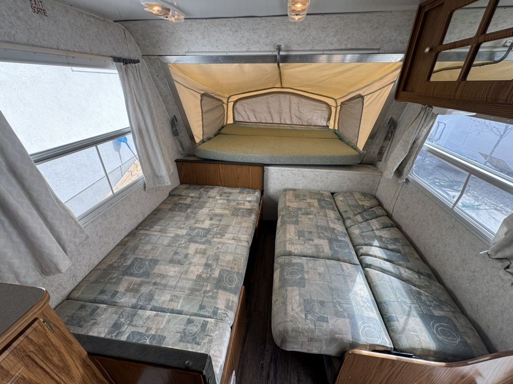Queen expandable Bed up front, double in Rear Expandable, double side expandable, couch that folds to a twin bed, table that makes into a twin bed Rated to Sleeps 8-10 comfortably Full size Refrigerator/freezer- works amazing Microwave & Oven works Full Bathroom, vanity, Toilet separate from shower Outside Shower Fully self contained. fresh 35g black 30g grey 30g Tons of storage 6 gallon hot water heater w/DSI automatic with flip of switch Outside barbeque grill CD stereo/speakers works great New laminate installed Summerized - All plumbing works great come test everything! thick upholstery and bed cushions are in like new condition throughout Canvas/screens in amazing condition Never any leaks Outside decals fiberglass Excellent condition