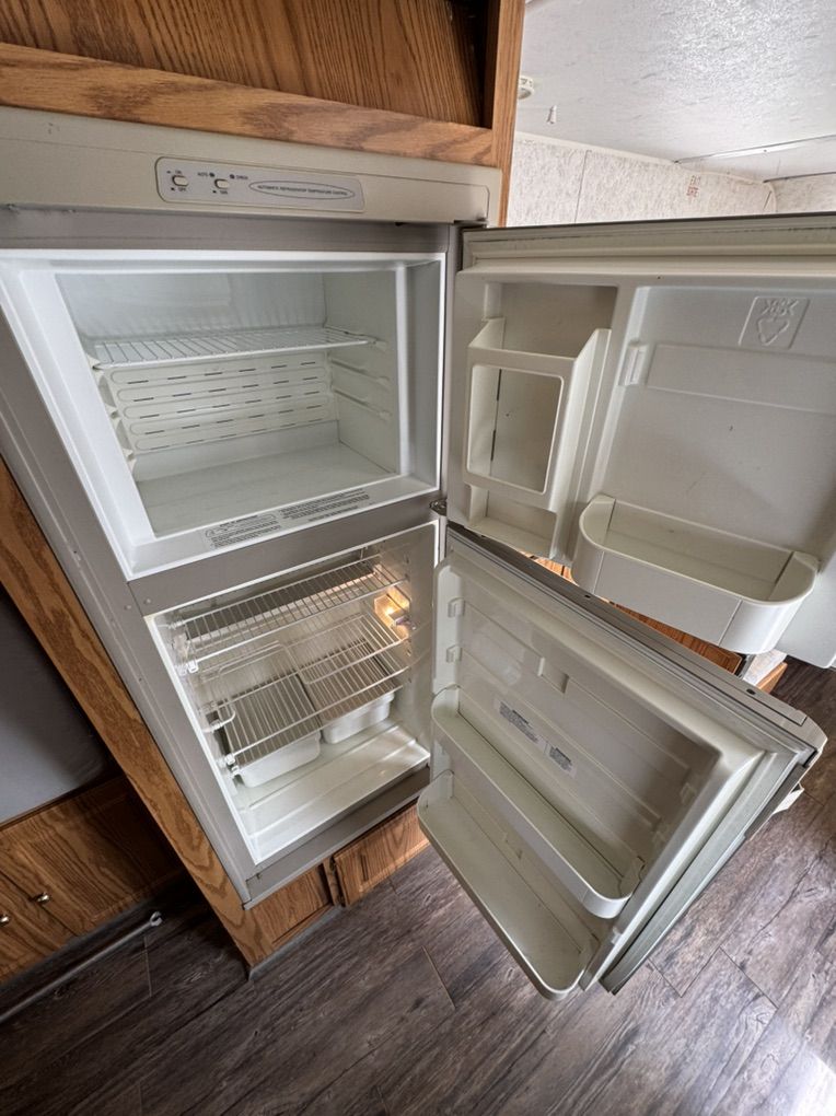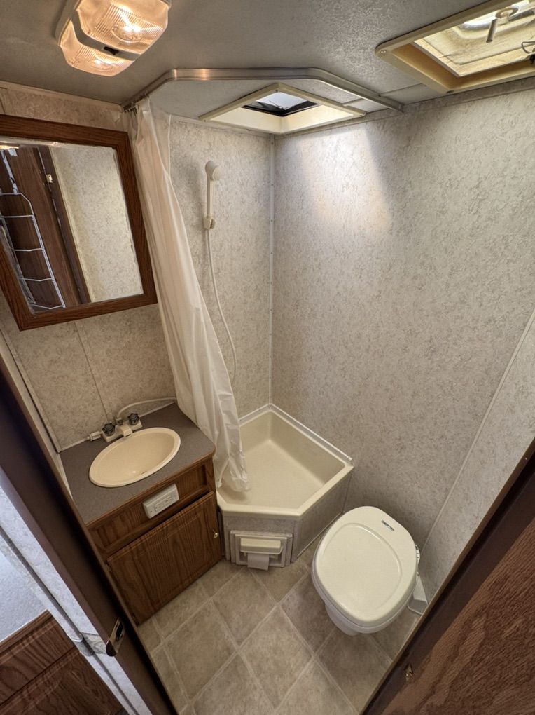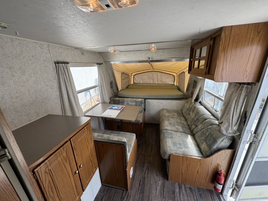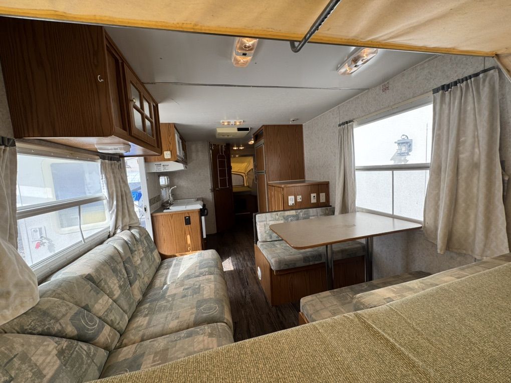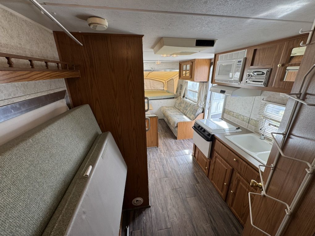 Queen expandable Bed up front, double in Rear Expandable, double side expandable, couch that folds to a twin bed, table that makes into a twin bed Rated to Sleeps 8-10 comfortably Full size Refrigerator/freezer- works amazing Microwave & Oven works Full Bathroom, vanity, Toilet separate from shower Outside Shower Fully self contained. fresh 35g black 30g grey 30g Tons of storage 6 gallon hot water heater w/DSI automatic with flip of switch Outside barbeque grill CD stereo/speakers works great New laminate installed Summerized - All plumbing works great come test everything! thick upholstery and bed cushions are in like new condition throughout Canvas/screens in amazing condition Never any leaks Outside decals fiberglass Excellent condition