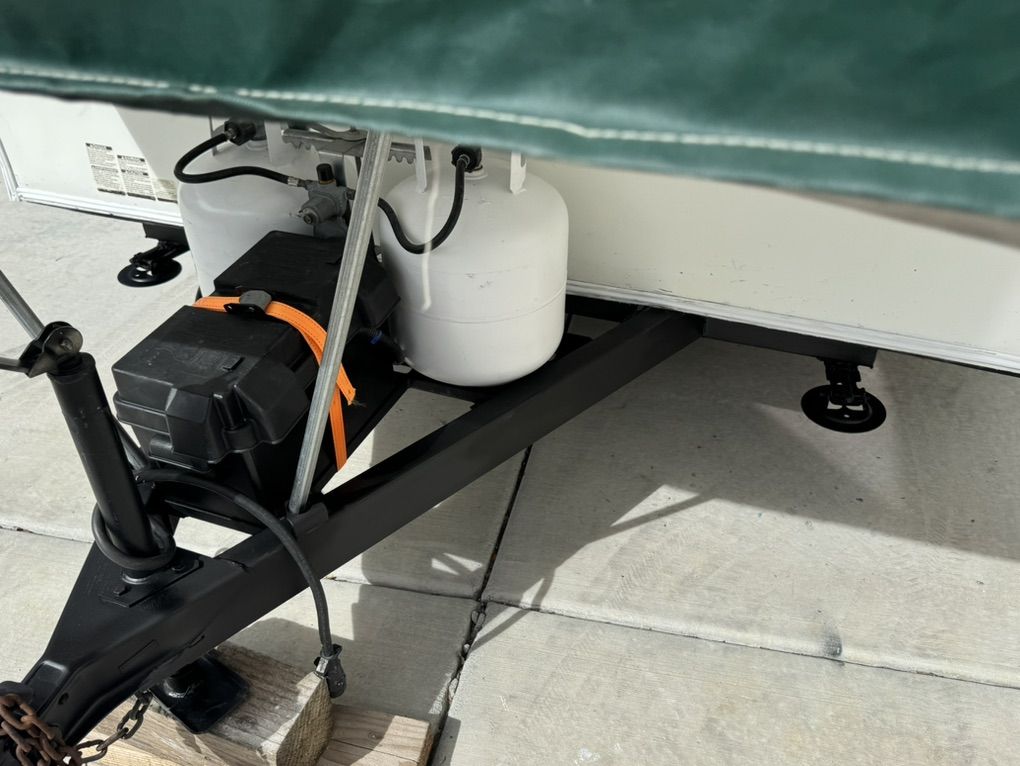 4 new tires and spare, bearings just fully serviced. EZ lube bearings installed to make servicing a breeze Two full 5g propane tanks Brand new interstate deep cycle battery just purchased Open Length: over 28F Closed Length: Approx 22F