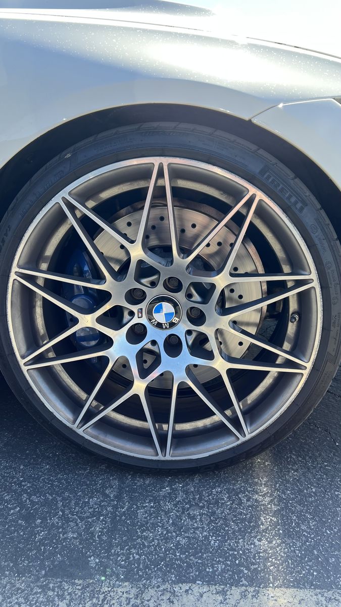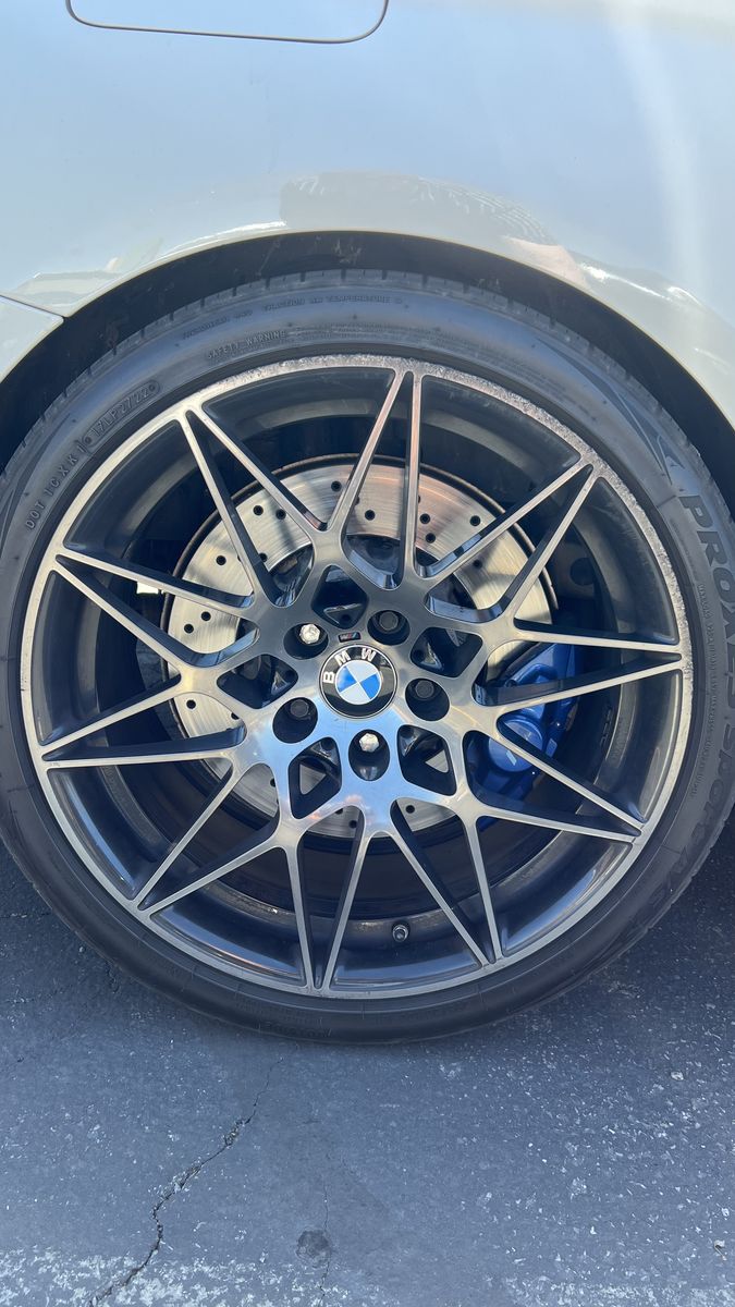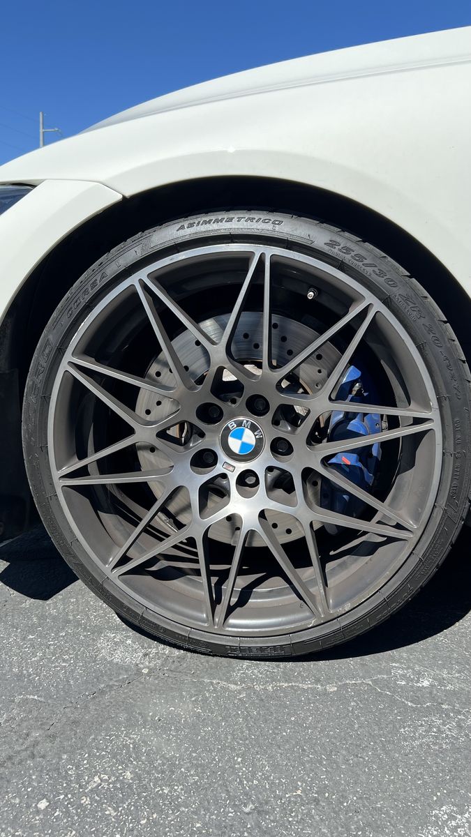 ApplePayOEM M4 M3 competition wheels. They all have a little rash. One of them is a full silver one, the rest are shadow line, but it’s not noticeable because the faces are all silver. Tires are all in decent shape with some tread left. 295 rear, 255 front.