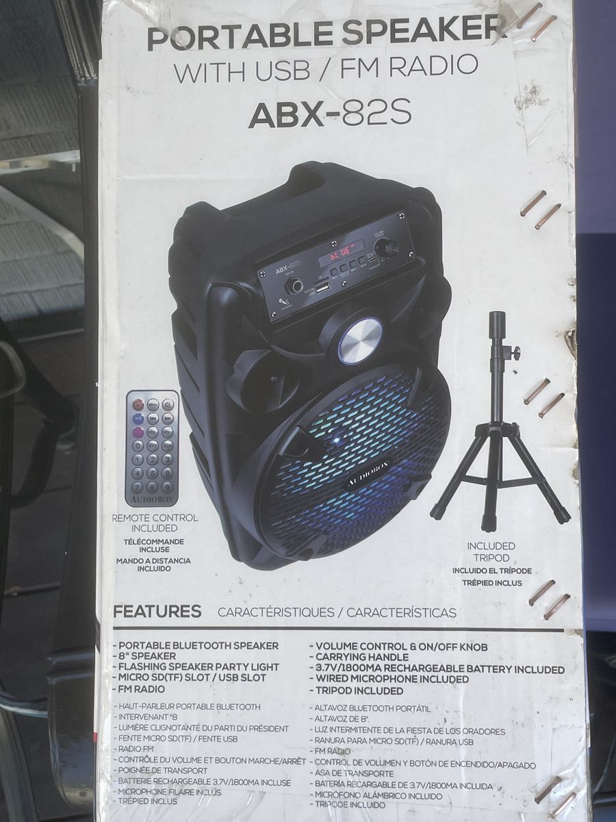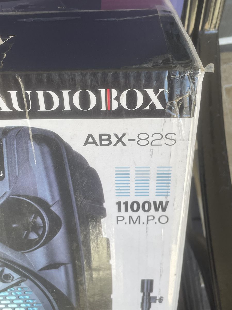 ApplePayBrand new AUDIOBOX portable, bluetooth speaker with microophone. Model number ABX-82S. (1100 Watts P.M.P.O). Sound is amazing for such a small portable speaker. Perfect for Karaoke! Has all the connections for musical instuments, your phone, etc..It even has adjustable lights that go to the beat of the music.