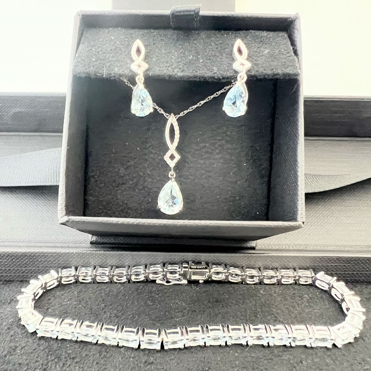 PayPal$130 OBO. Never worn 925 sterling silver jewelry set with blue topaz gemstones. Purchased from Fred Meyer Jewelers. Name on the box.