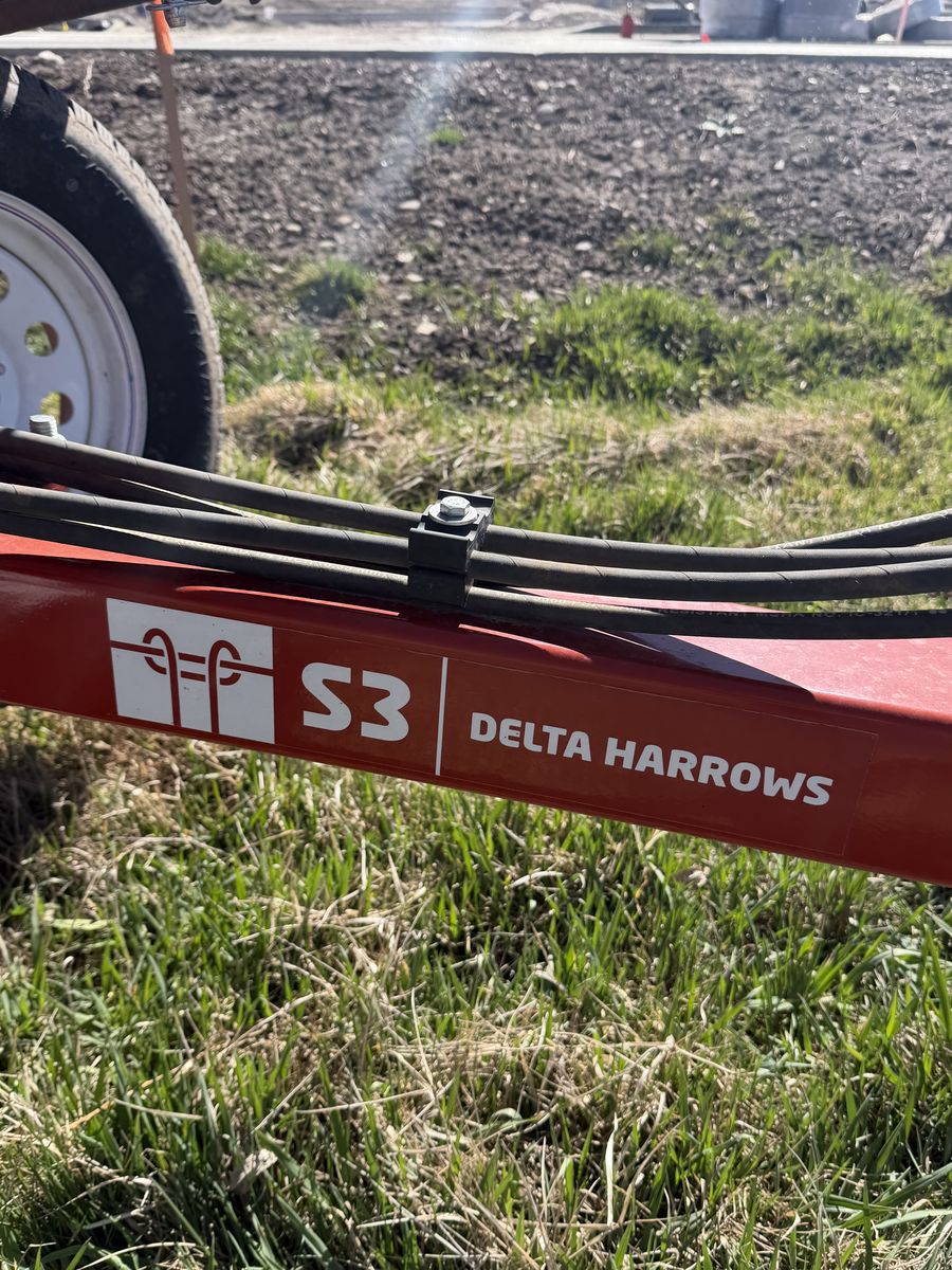 Venmo2023 Delta 28’ harrow cart, hydraulic lift and fold on the cart. Has (2) 10’ x 5’ Delta Tooth harrow wings w/extra row for cart and (1) 8’ x 5’ Delta Tooth harrow center w/extra row for cart.