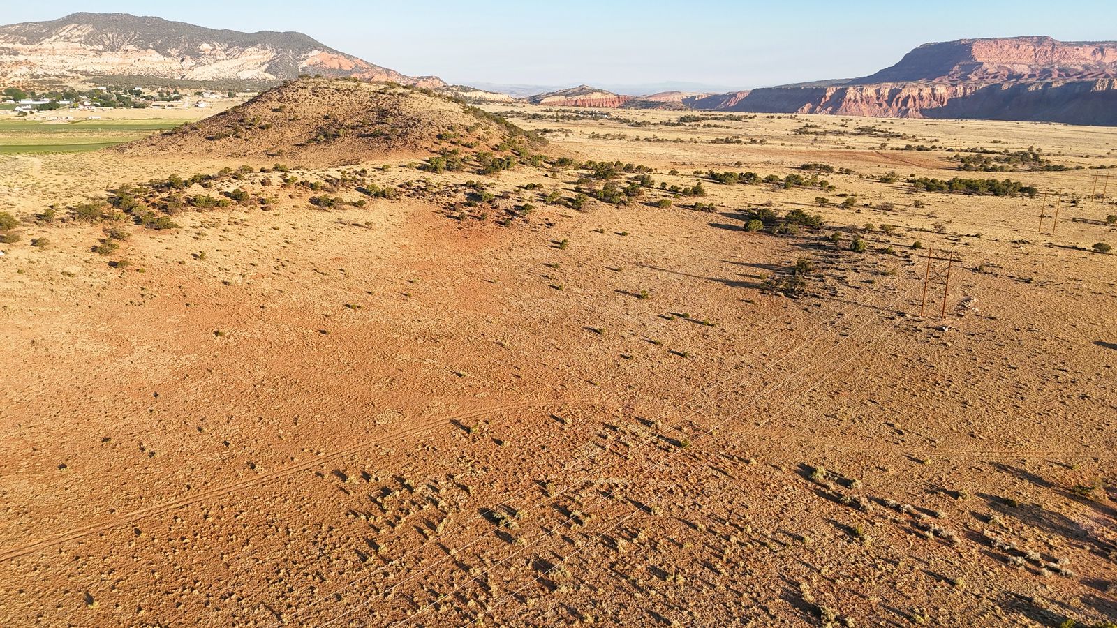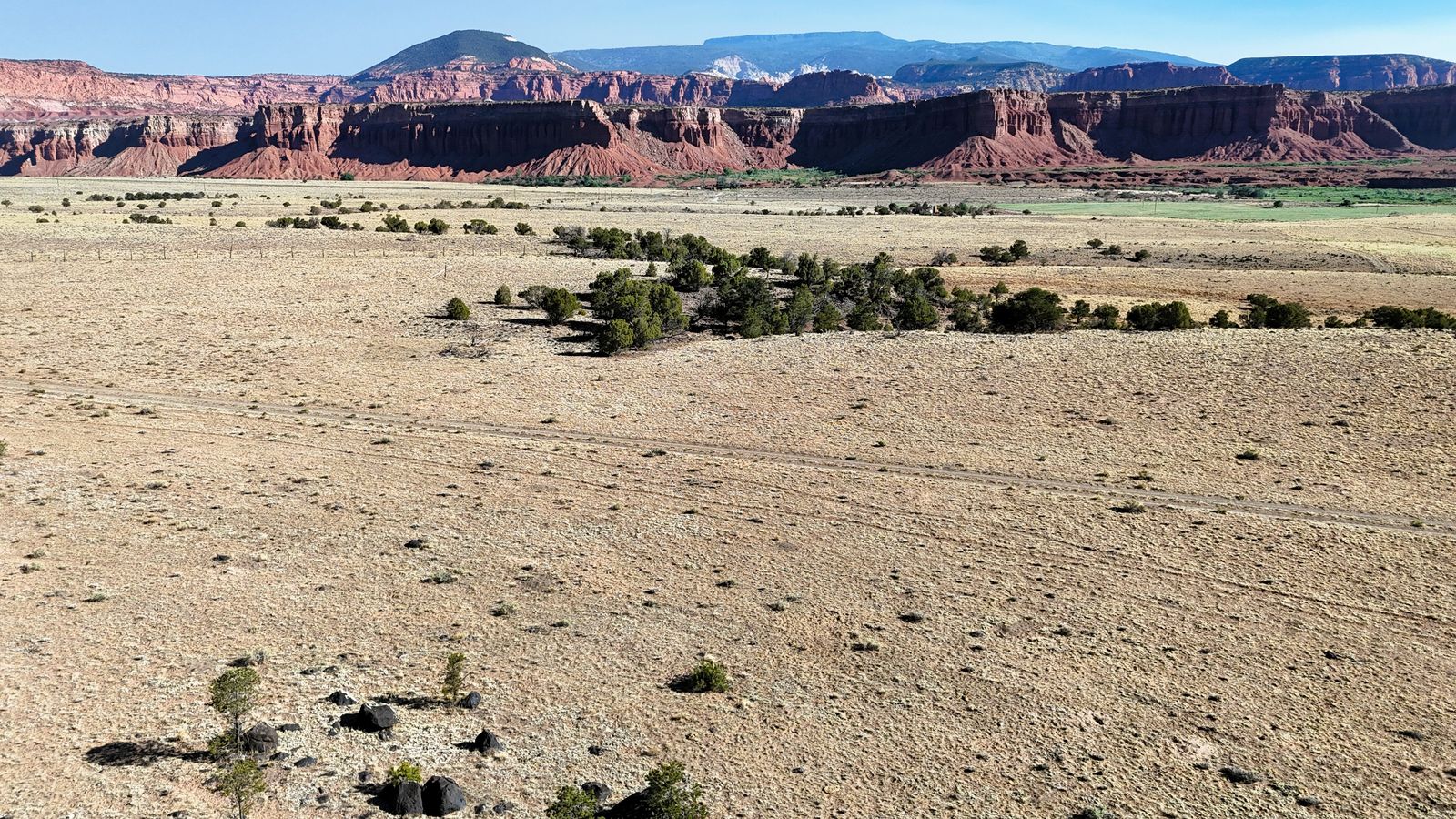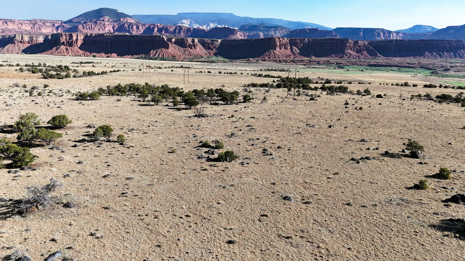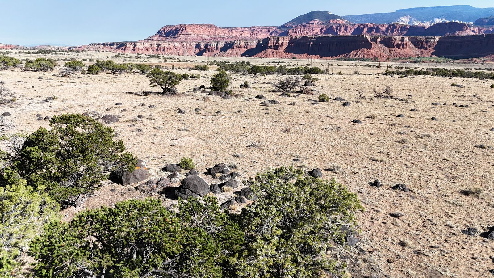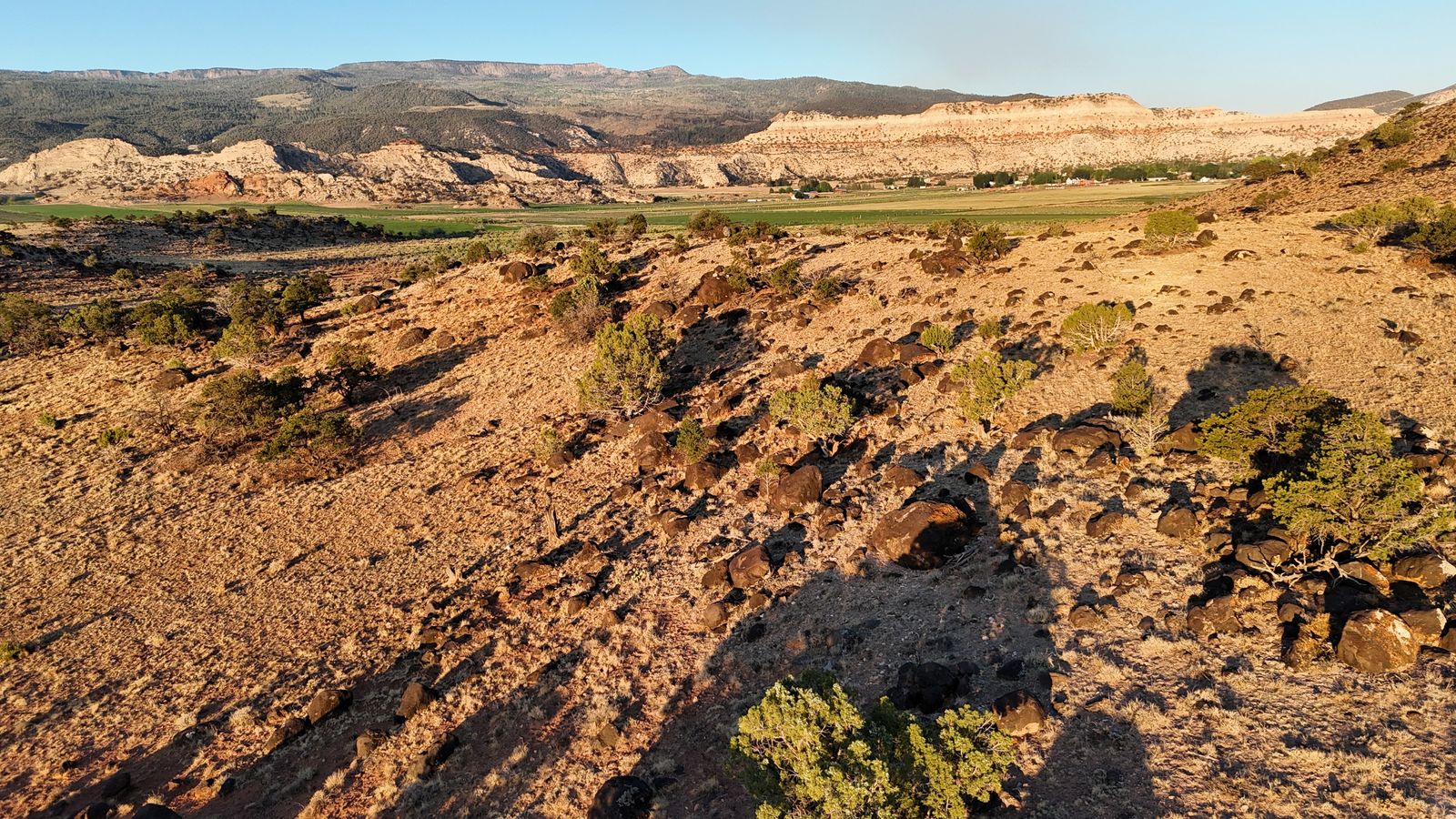 From multiple vantage points across the parcel, there are clear views of surrounding natural landmarks, including the Boulder Mountains to the south and the distinctive red rock formations and bluffs that characterize the region. The northern portion of the property drops approximately 100 feet, creating a natural edge where the Fremont River can be seen below. Along the southeastern boundary, views extend toward Cottonwood Creek, an area that supports local wildlife activity.