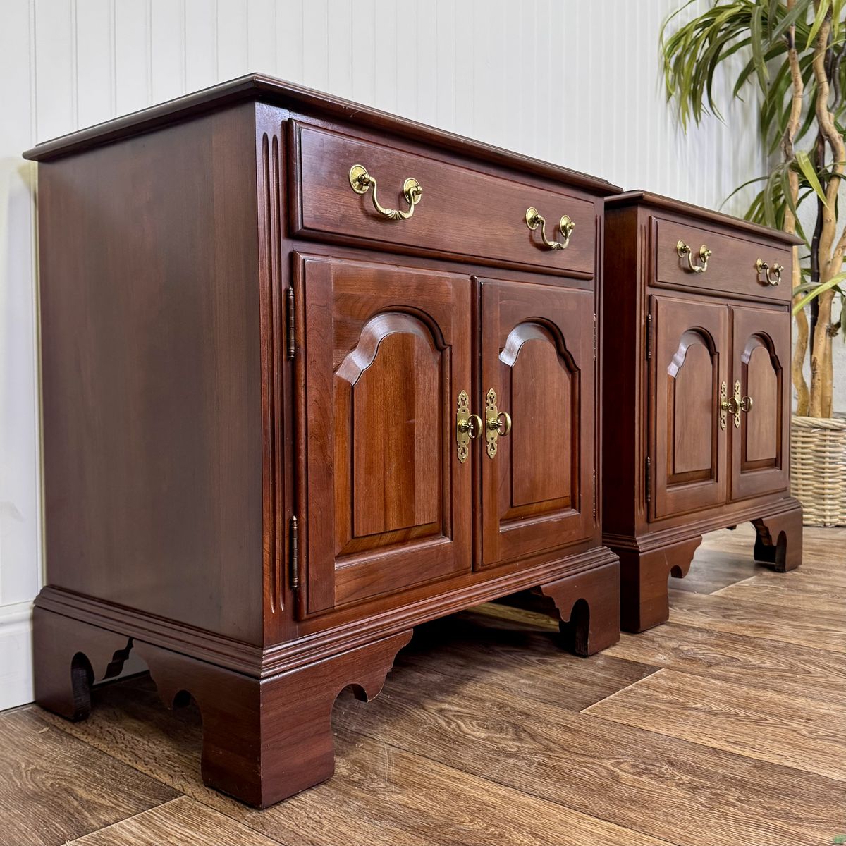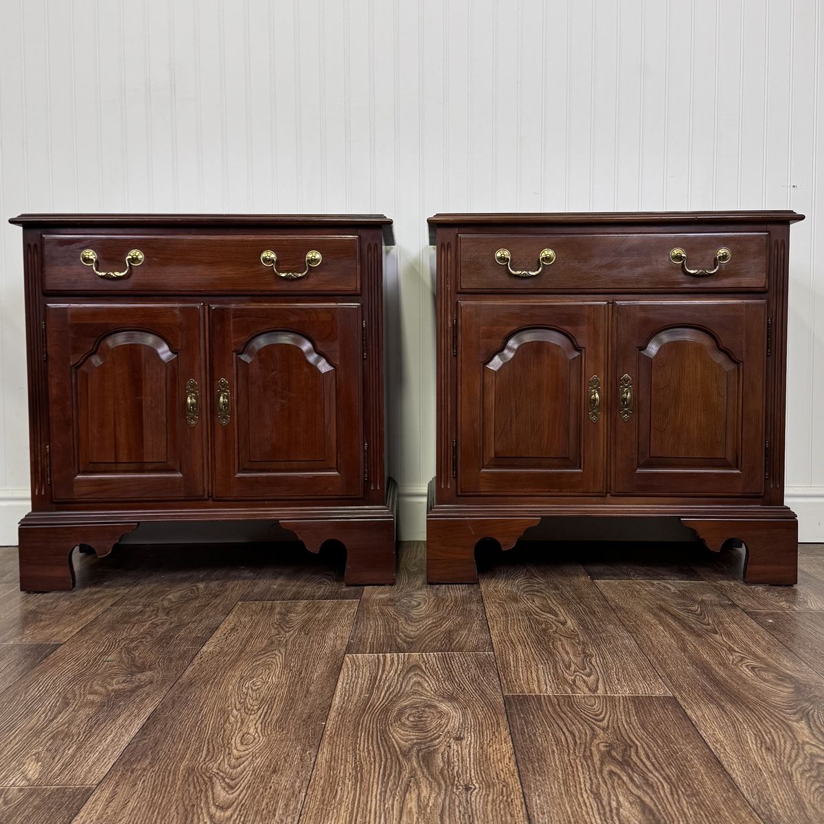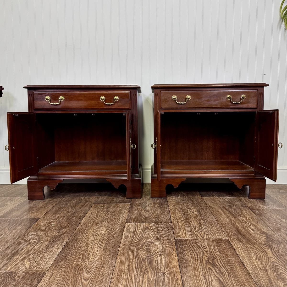 VenmoVintage pair of Ethan Allen nightstands from the Georgian Court Collection. These nightstands feature a Chippendale style, dovetailed drawers, original brass pulls, fluted carvings, and a rich cherry finish that beautifully highlights the natural grain of the wood.