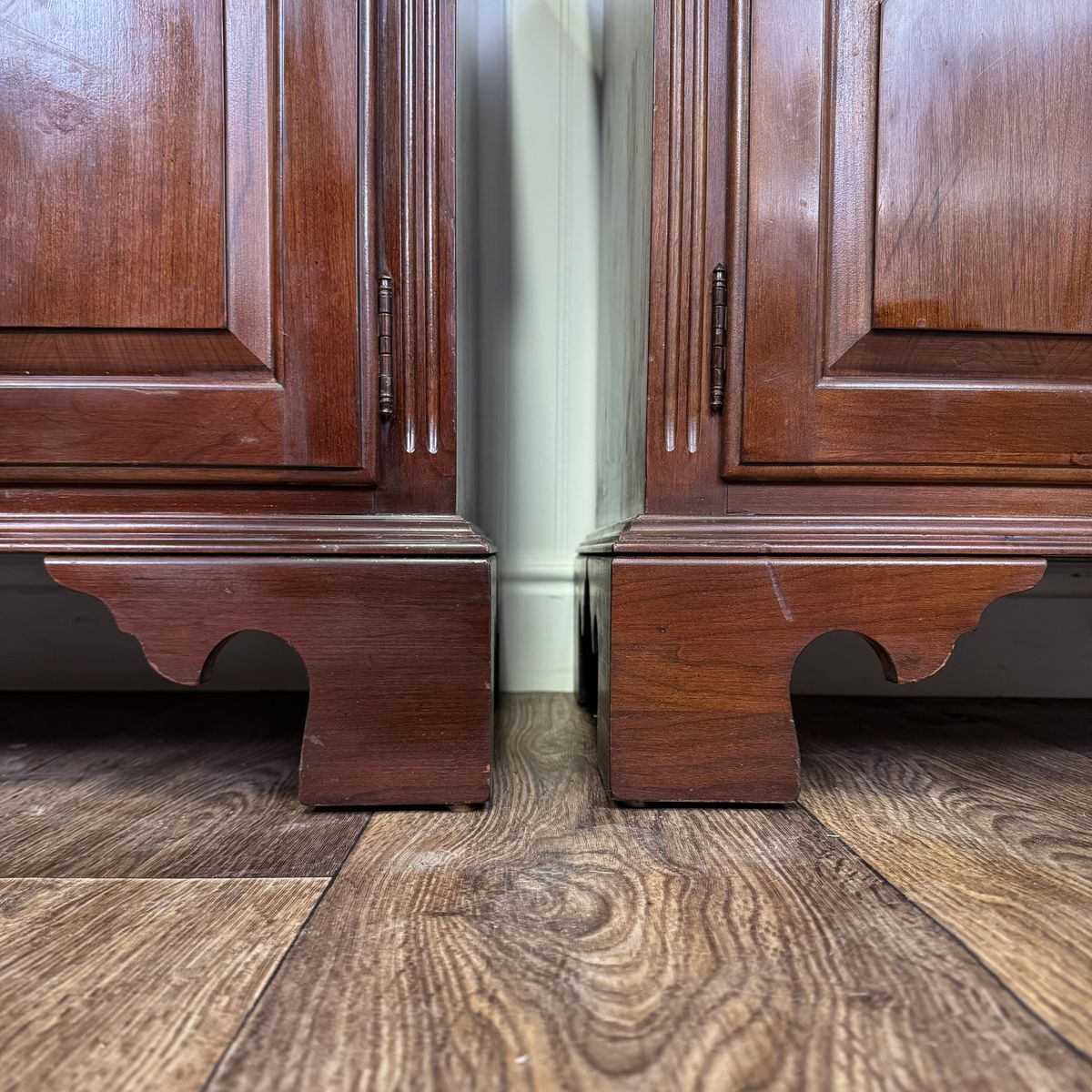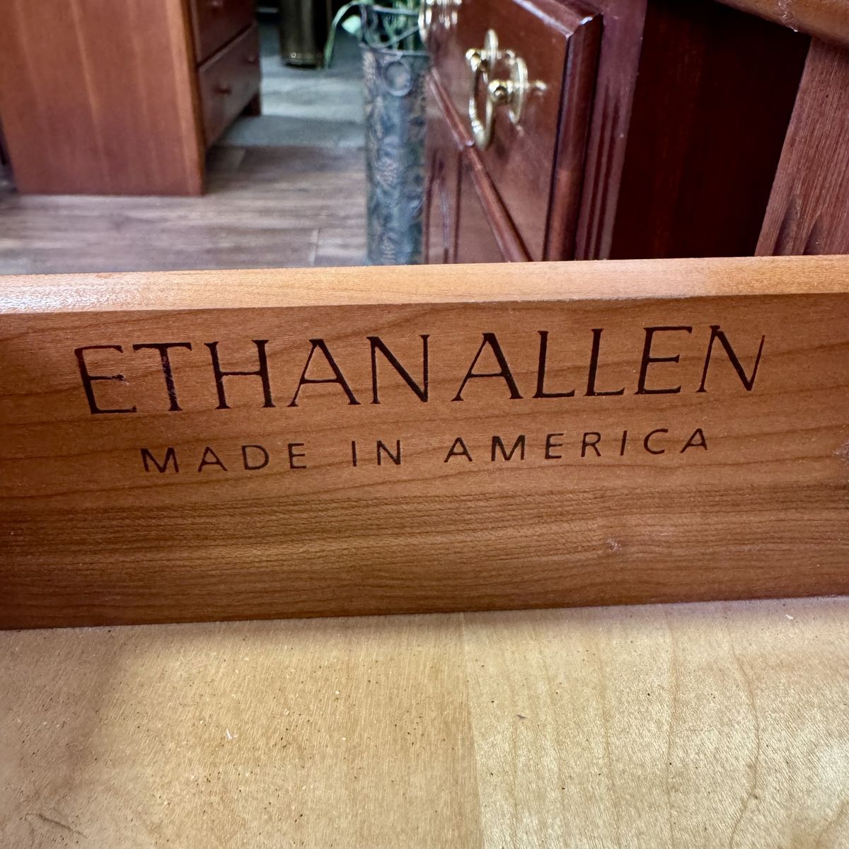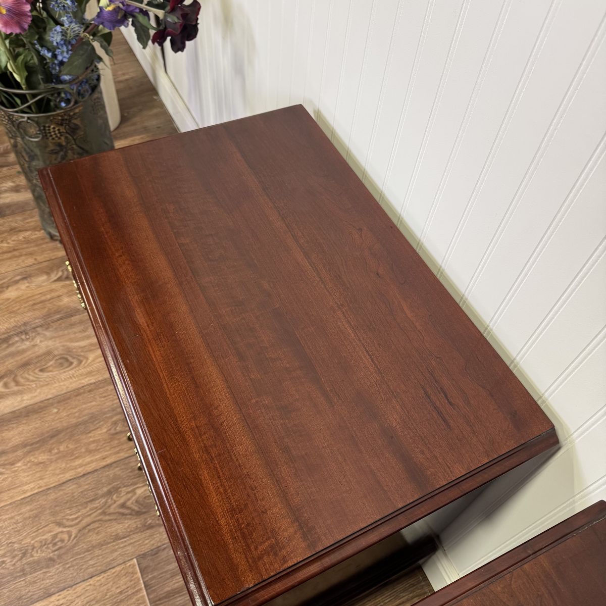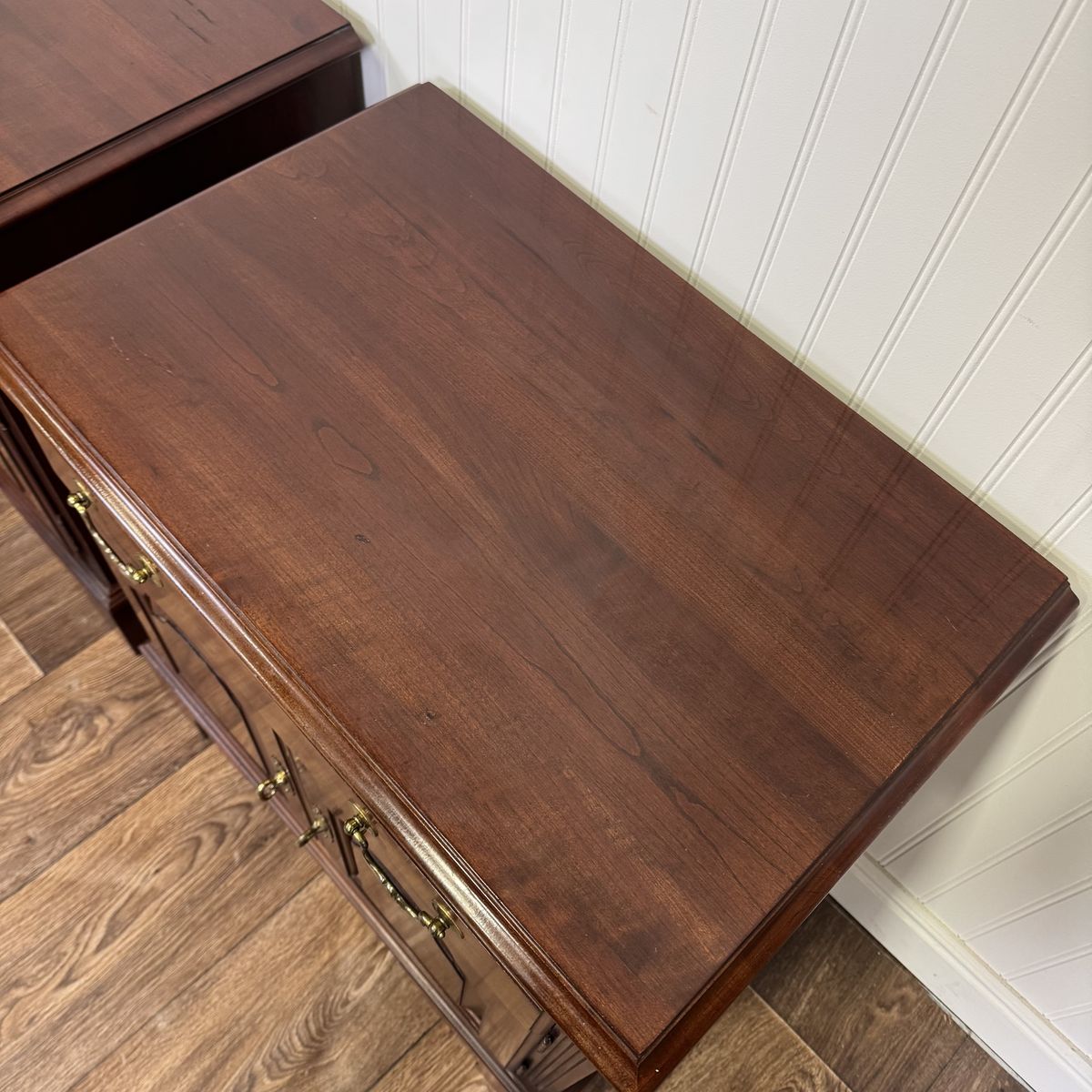 VenmoVintage pair of Ethan Allen nightstands from the Georgian Court Collection. These nightstands feature a Chippendale style, dovetailed drawers, original brass pulls, fluted carvings, and a rich cherry finish that beautifully highlights the natural grain of the wood.