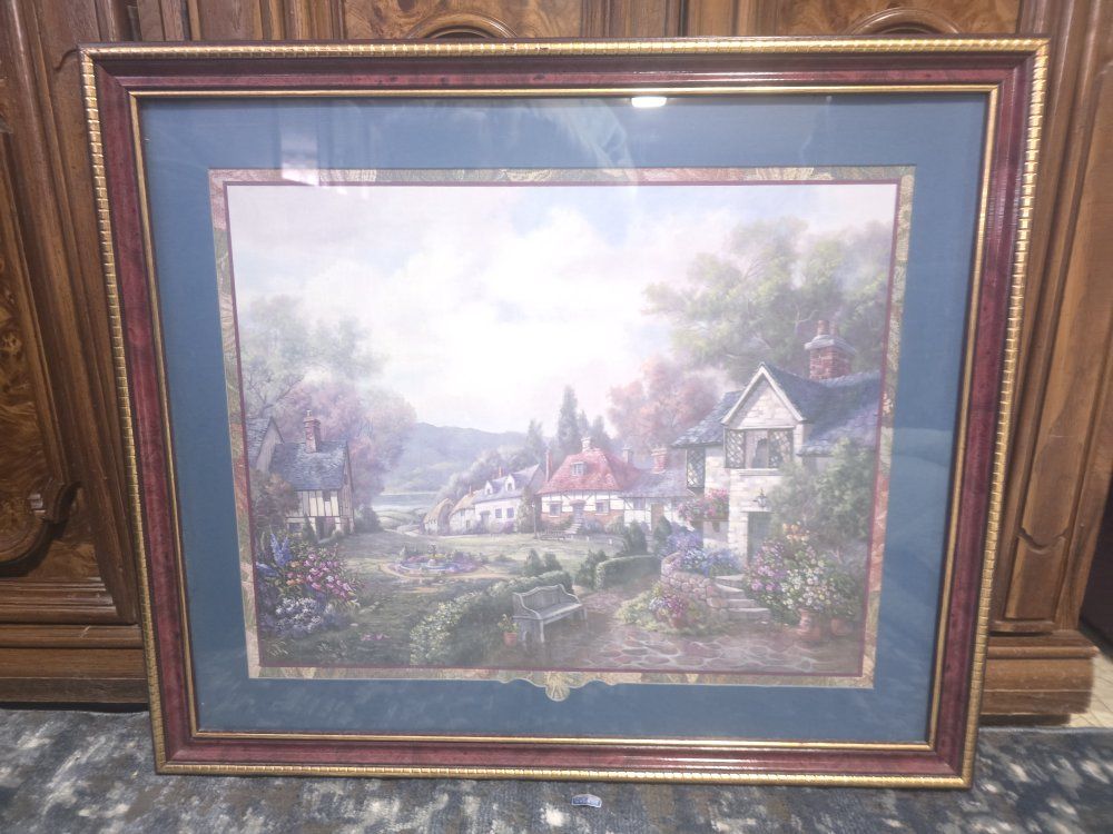 VenmoArtist unknown. Thomas Kinkade style cottage print. Gorgeous wood frame, with gold, gallery matting in dusky blue, burgundy colors under glass. Measures: 26.5 x 22.5 in Excellent condition Smoke-free home