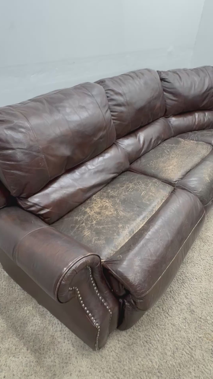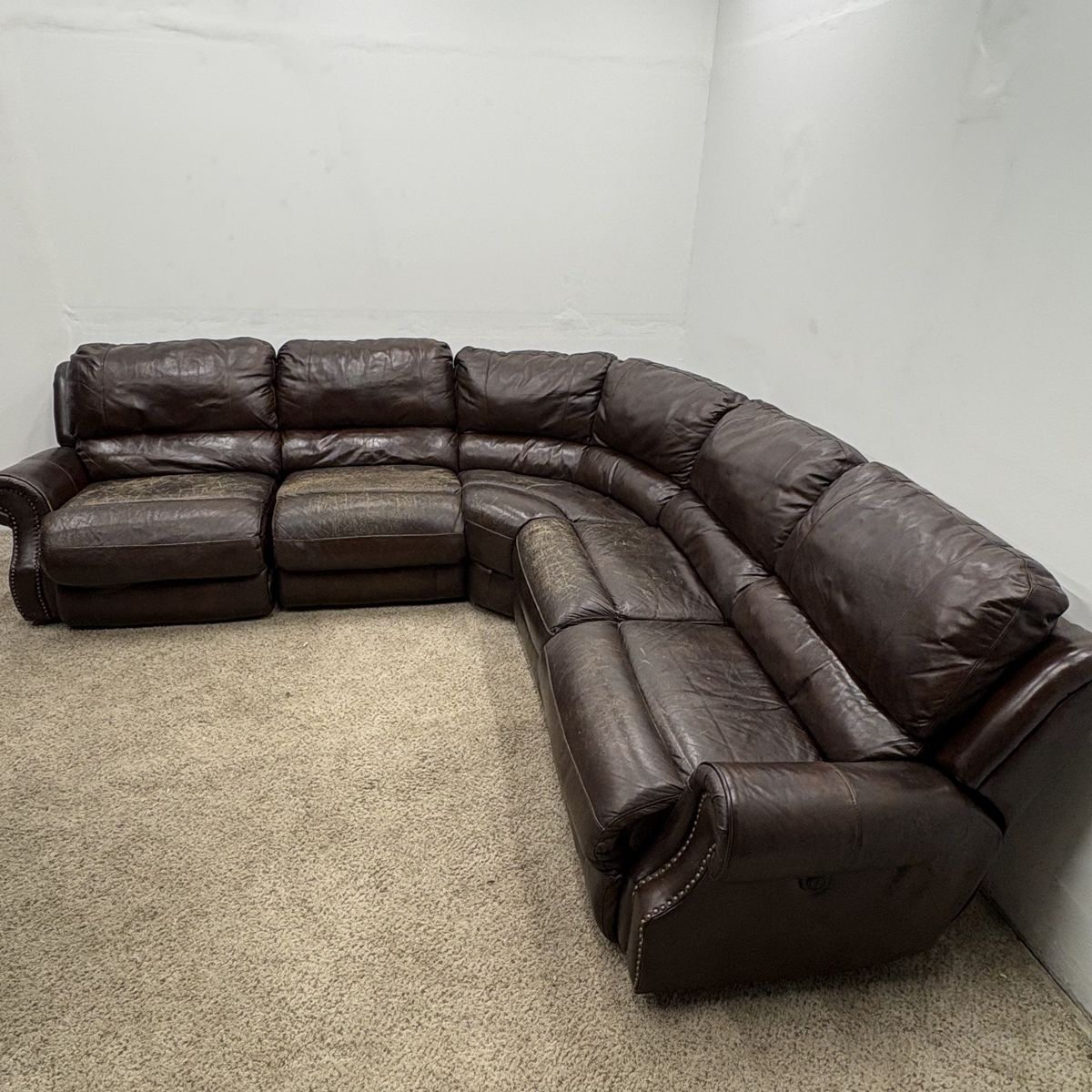brown leather sectional sofa. Has multiple reclining seats. Dark brown color. Great for a large living room or den.