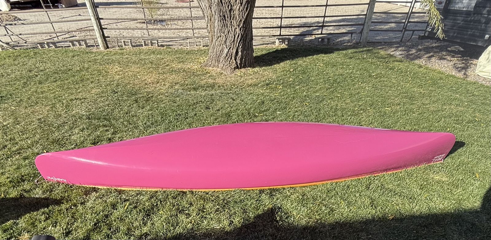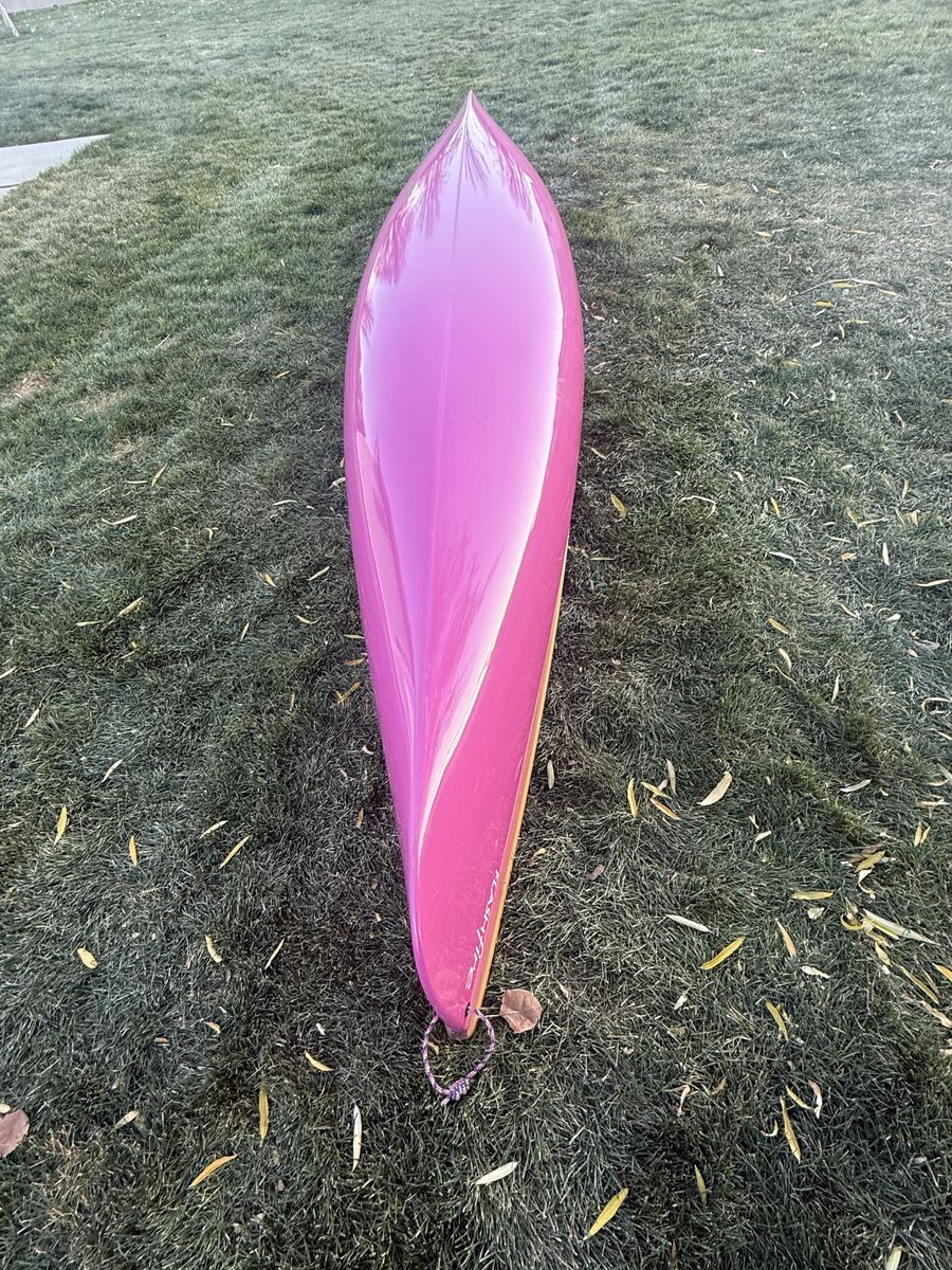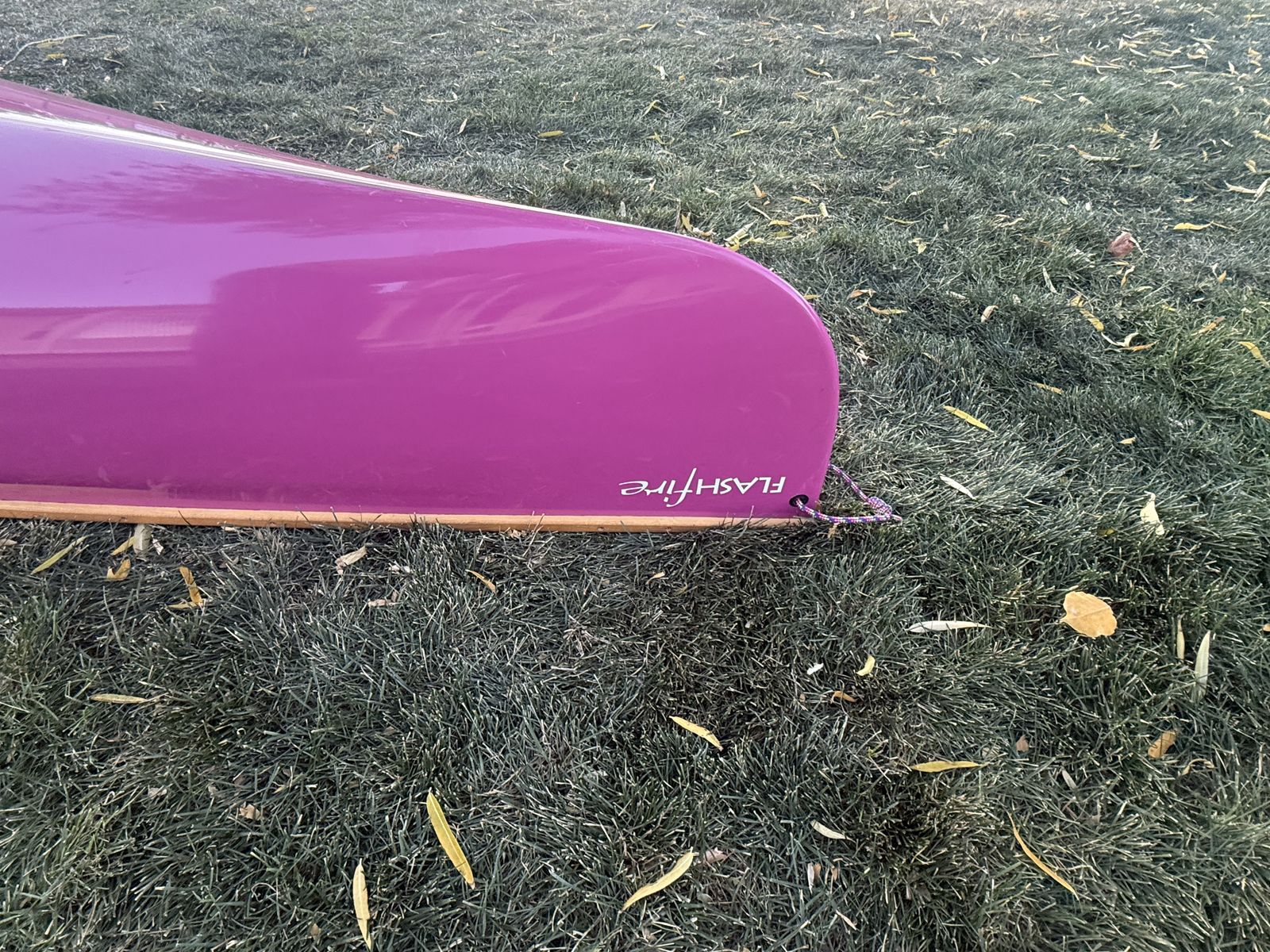 Immaculate Kevlar Flashfire solo canoe! No longer manufactured, weighs about 35 pounds. Hand written inscription and signature of designer Dave Yost. Located in Riverton.