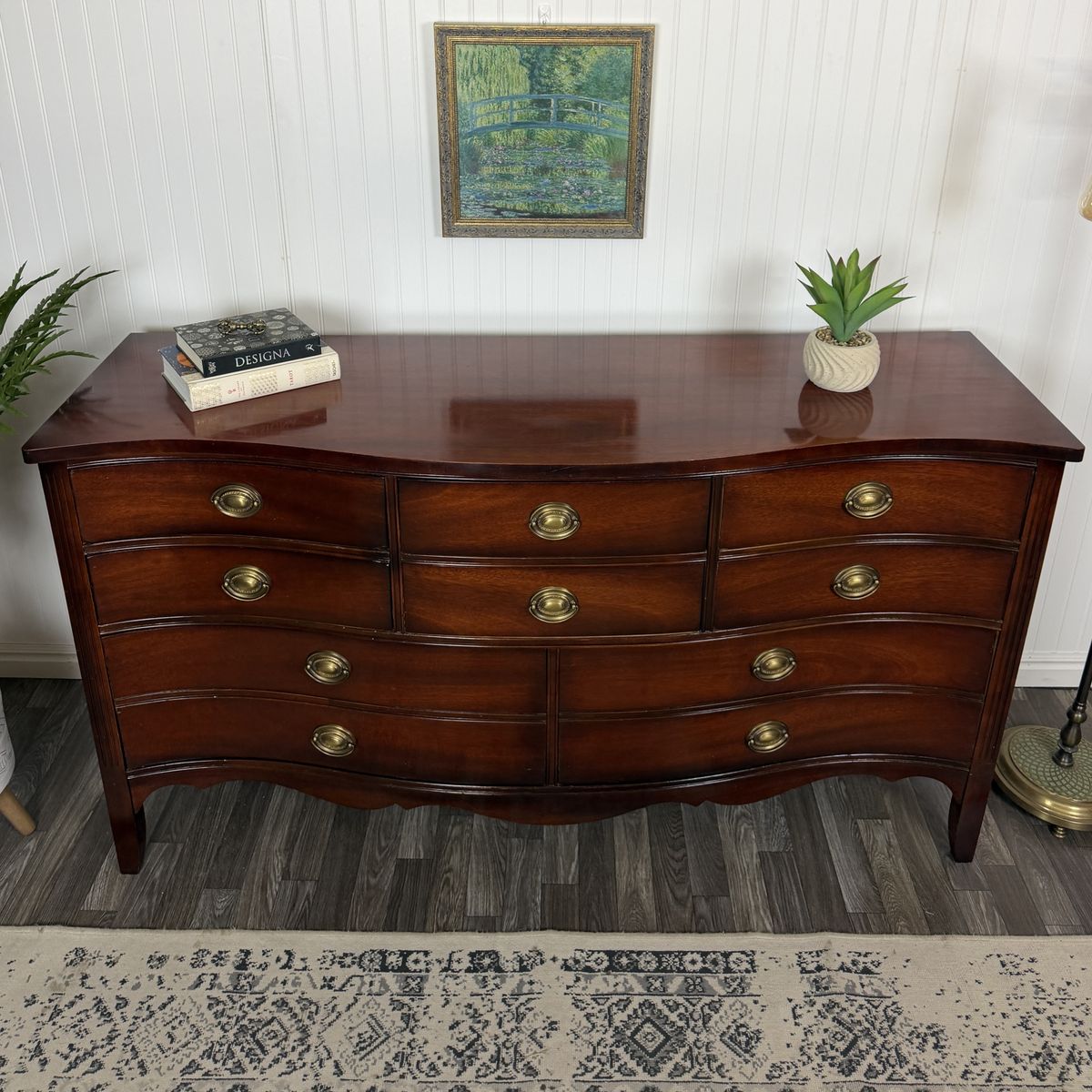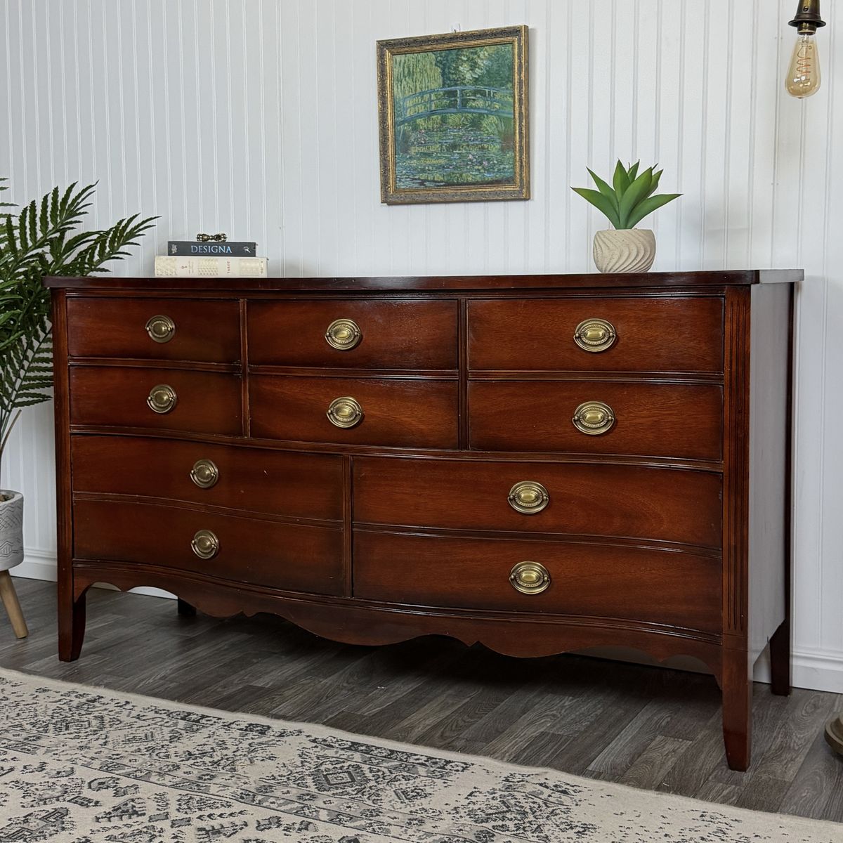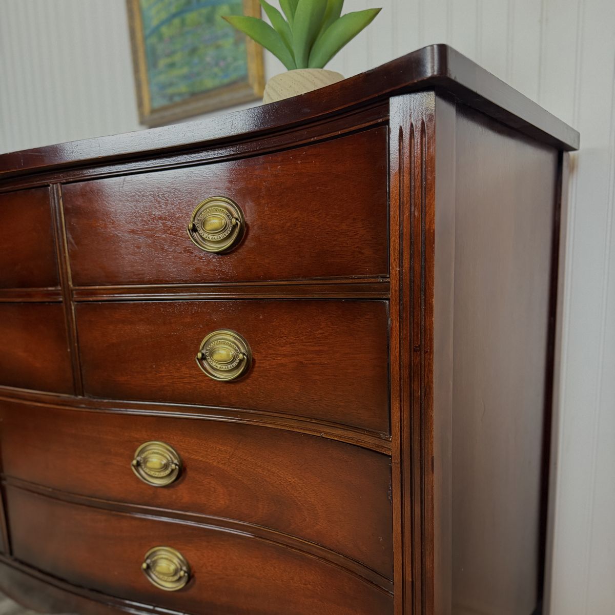 VenmoThis exquisite vintage bow front dresser by Dixie showcases the craftsmanship of a premium furniture maker. Constructed with rich mahogany wood, it features eight spacious dovetail drawers that operate smoothly and retain their original hardware. It’s been well cared for and in great shape.