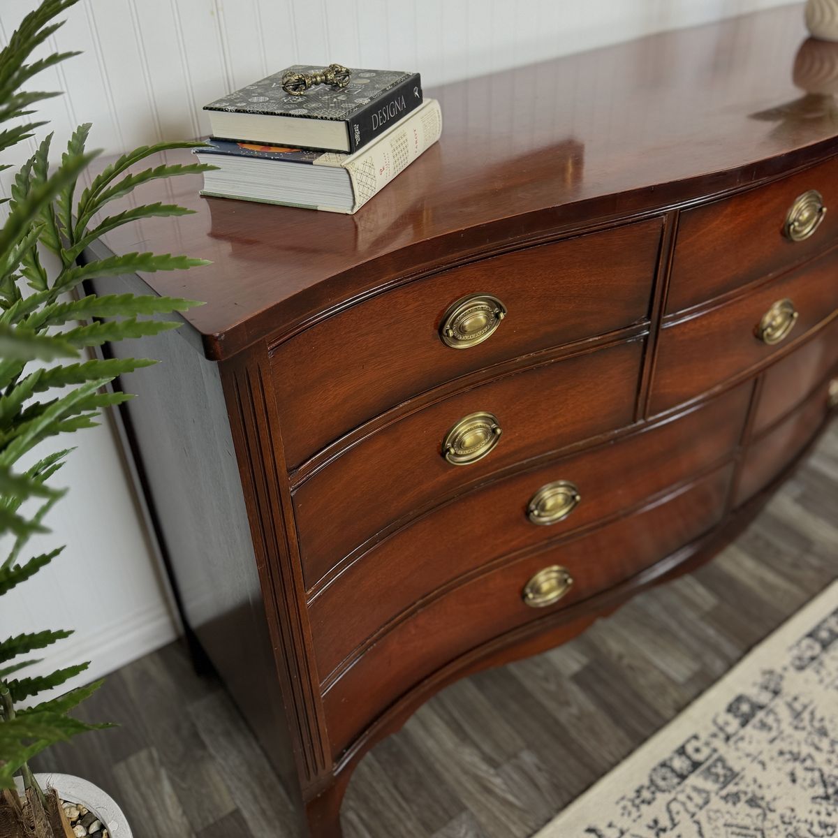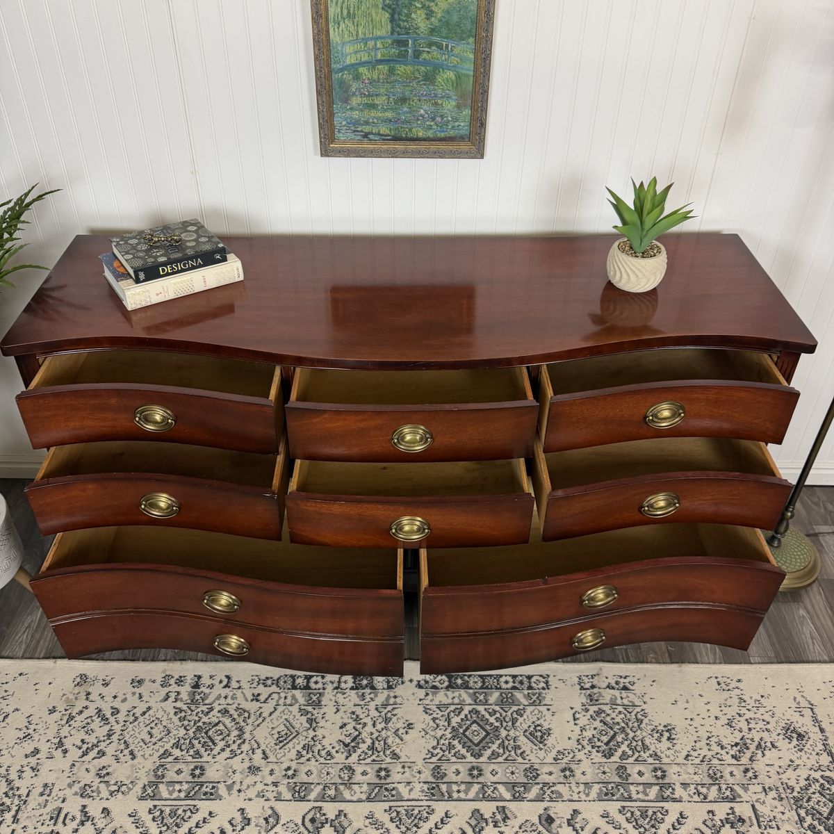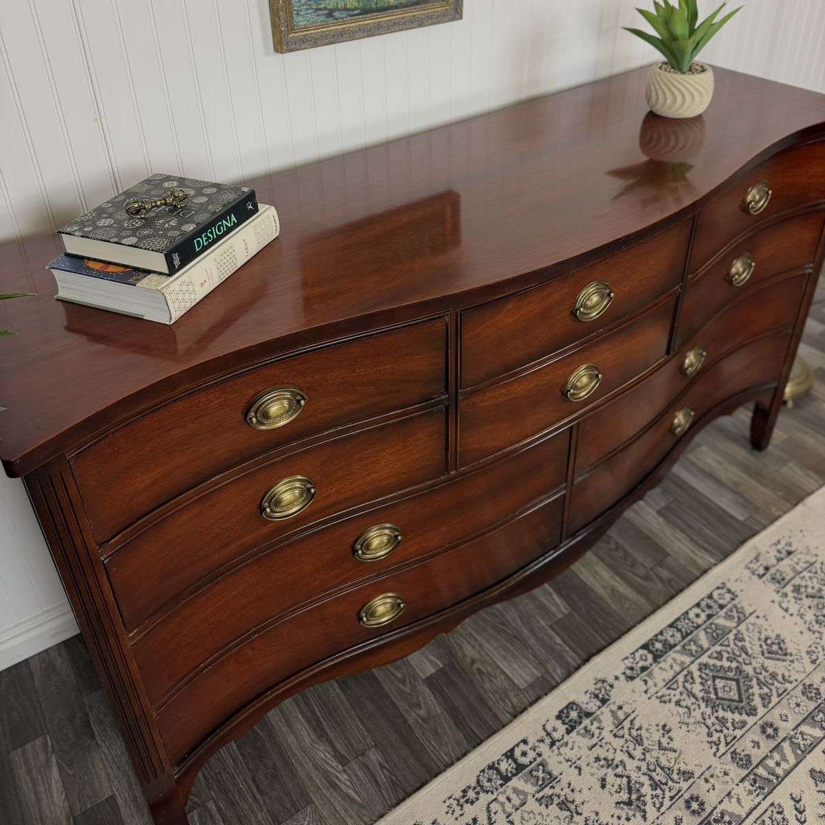 VenmoThis exquisite vintage bow front dresser by Dixie showcases the craftsmanship of a premium furniture maker. Constructed with rich mahogany wood, it features eight spacious dovetail drawers that operate smoothly and retain their original hardware. It’s been well cared for and in great shape.