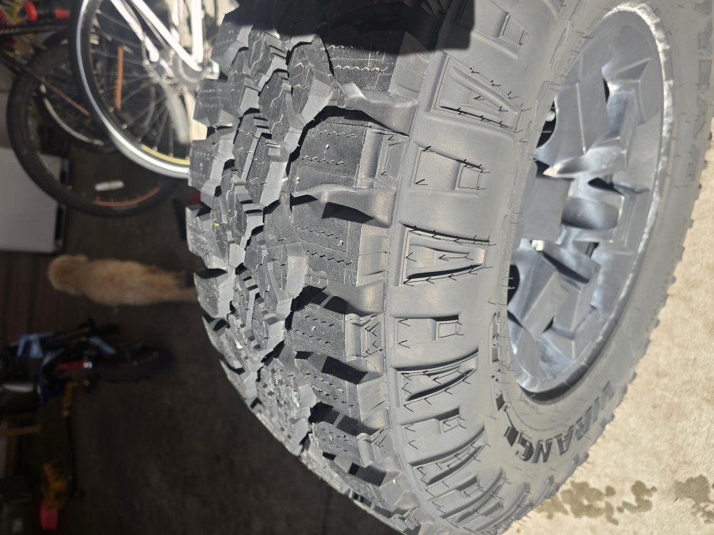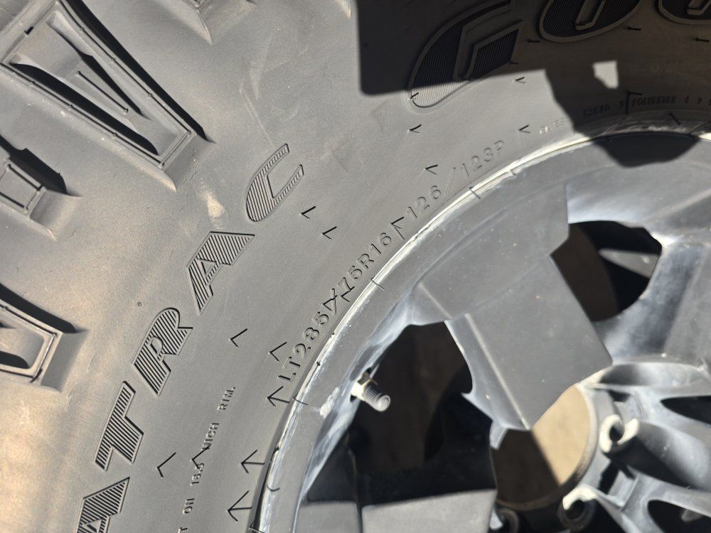 Brand/Model: Goodyear Wrangler DuraTrac Size: LT285/75R16 (Load Range E) Condition: 100% Tread. Still has the factory "nubs" and color lines on the tread face. This is the perfect replacement for a damaged Trail Teams wheel or to finally get a matching 5th wheel for a 5-tire rotation on your FJ, Tacoma, or 4Runner.