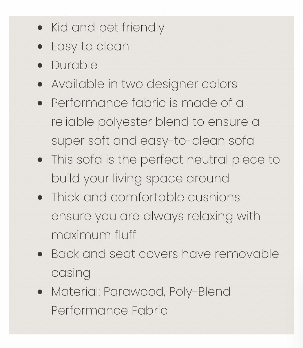 Why You’ll Love It • Kid & pet friendly performance fabric • Easy to clean • Durable polyester blend – built to last • Removable cushion covers for easy maintenance • Neutral designer color that fits any space