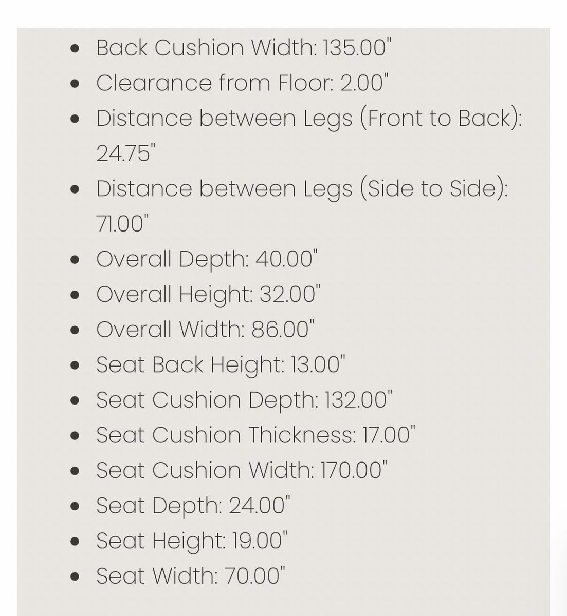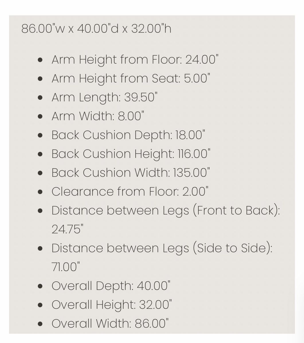 Dimensions • Width: 86” • Depth: 40” • Height: 32” • Seat Height: listed as 19”(actually 18”) • Seat Depth: 24”