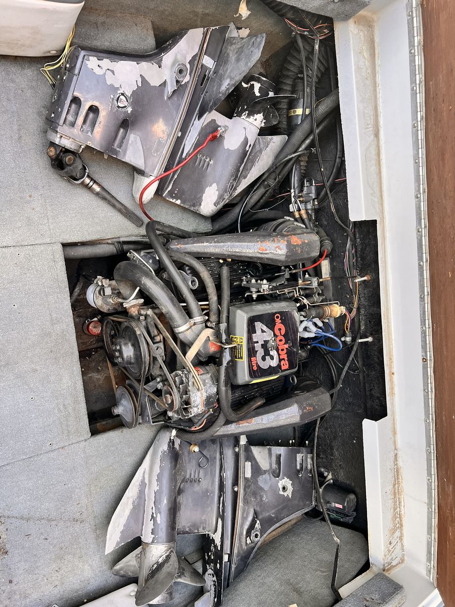 Just bought this boat and after trying to get it to start it looks like there is water in the oil. I don’t have the tools to fix it. It does turn over and all the electronics seem to be working. Comes with 2 stern out drives. I don’t know much about them but one looks on decent shape and the other is probably just for parts. Comes with a wakeboard, knee board and ski. Will need a new bench seat. $400 obo