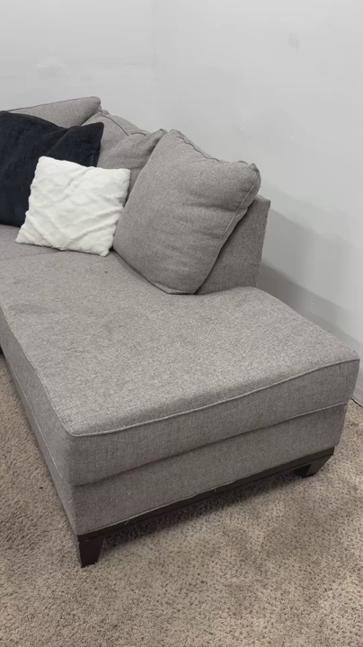 Comfy gray sectional sofa. Has chaise lounge, great for lounging. Dark feet. Good for living room or den. Previous owners had cats and cushions could use machine wash