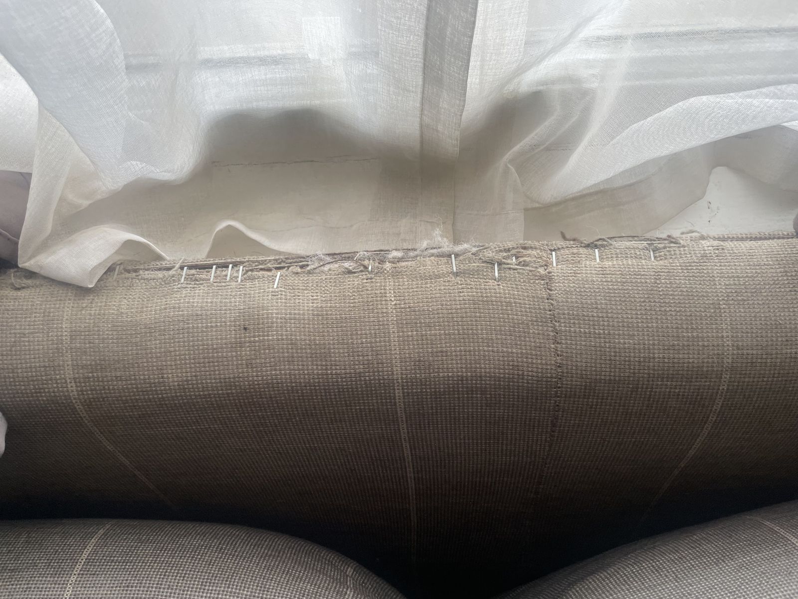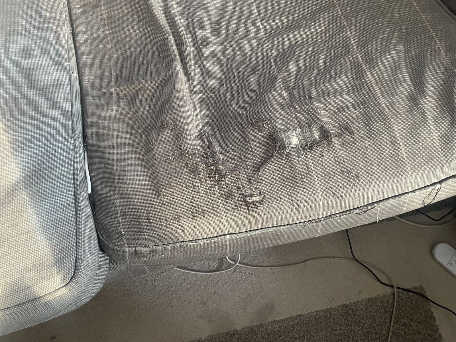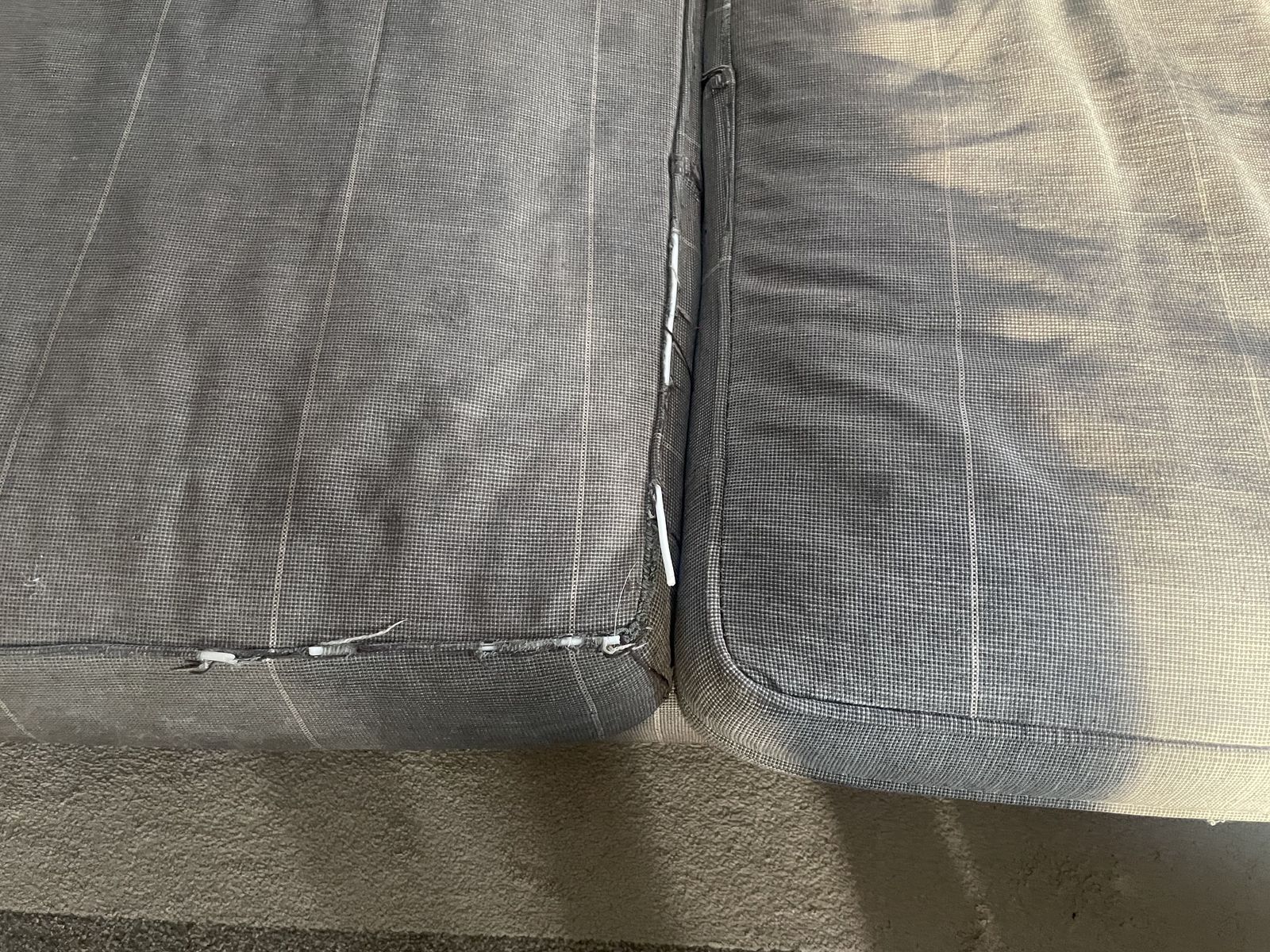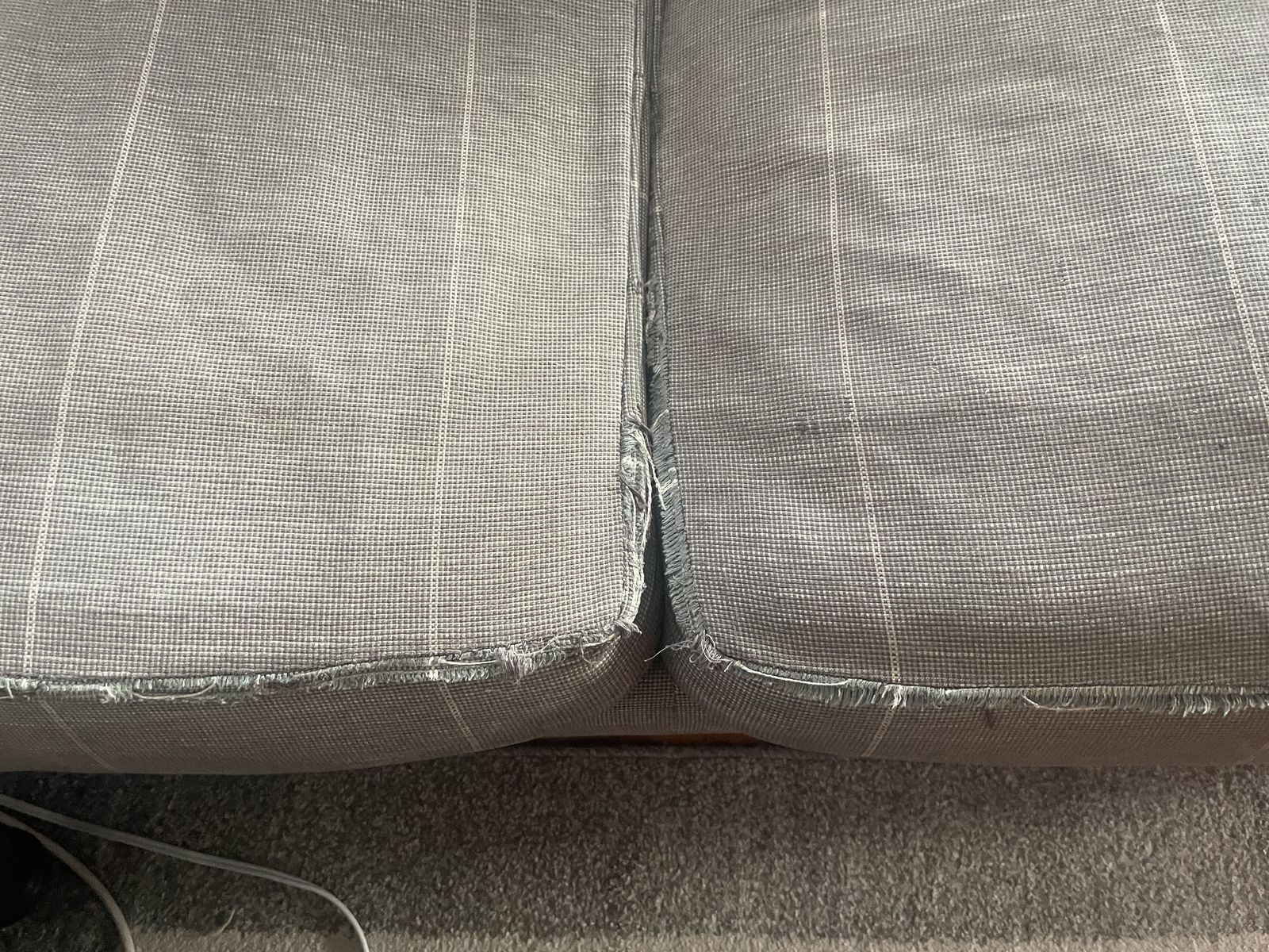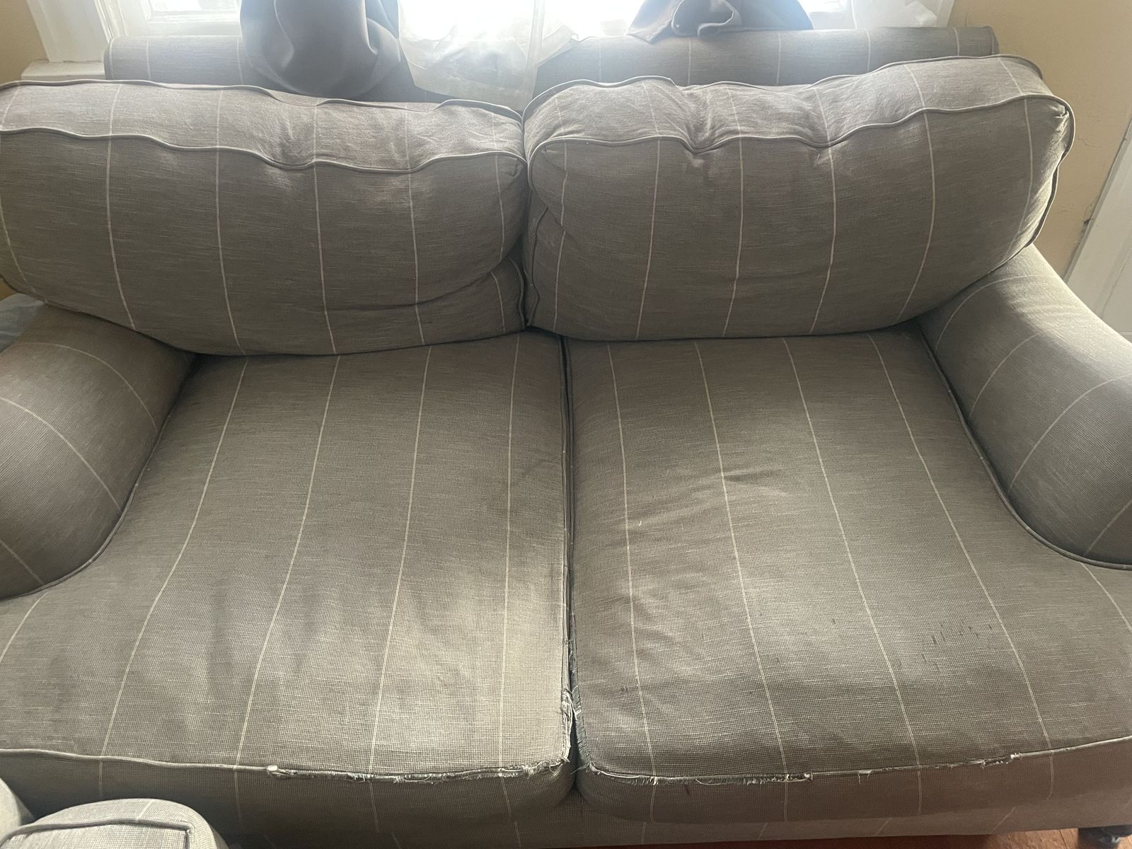 Free! This sofa and loveseat are heavily used and need to be recovered. The cusions on bottom and back are fully removable and the stuffing is still very dense. This is a deep seat 32 inches. The sofa is about 95x44 inches wide, the loveseat is about 66x44 inches.