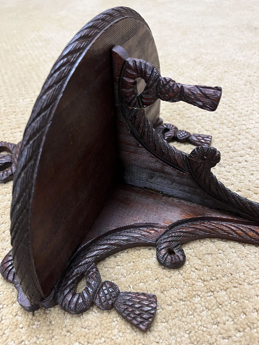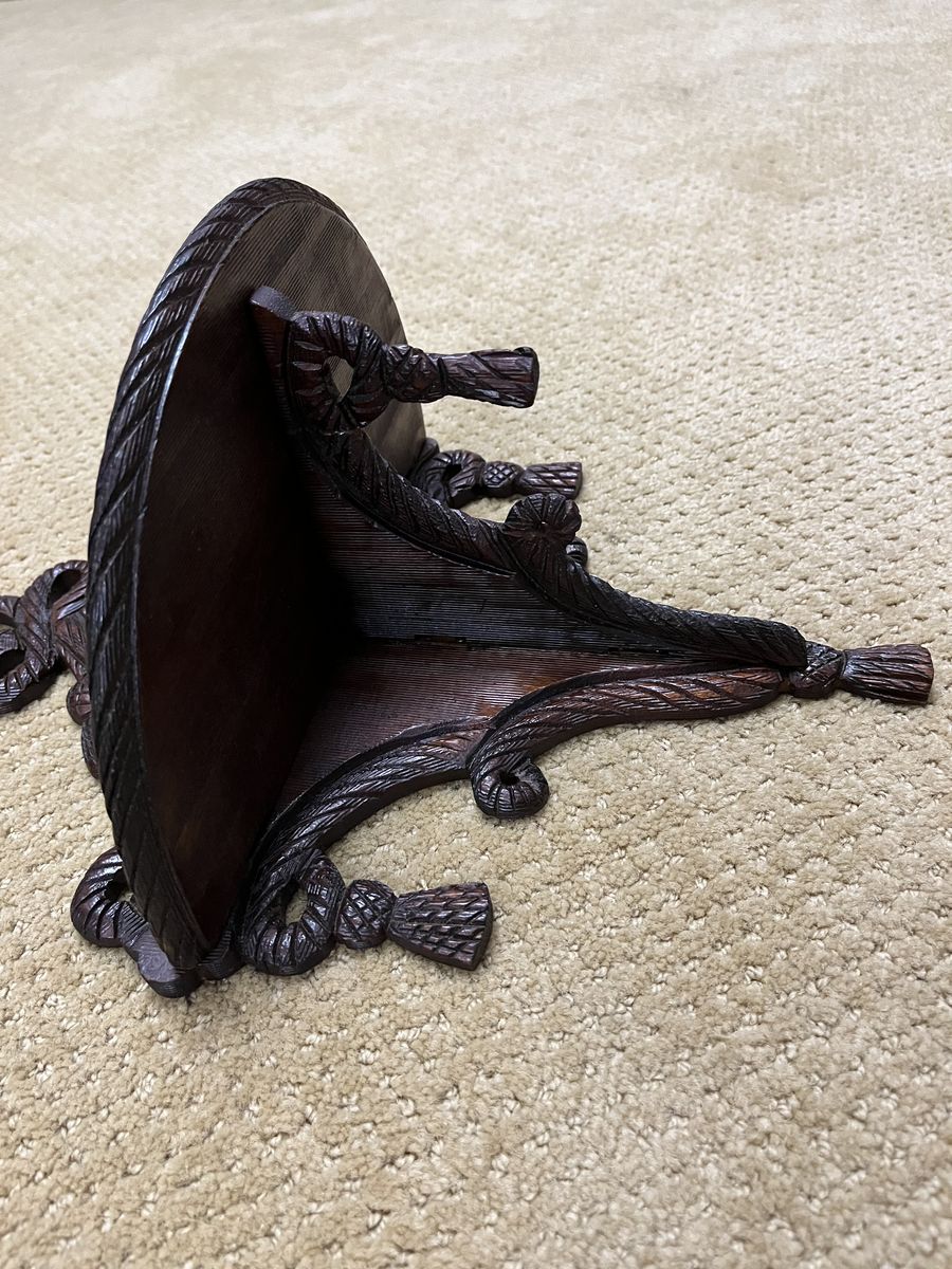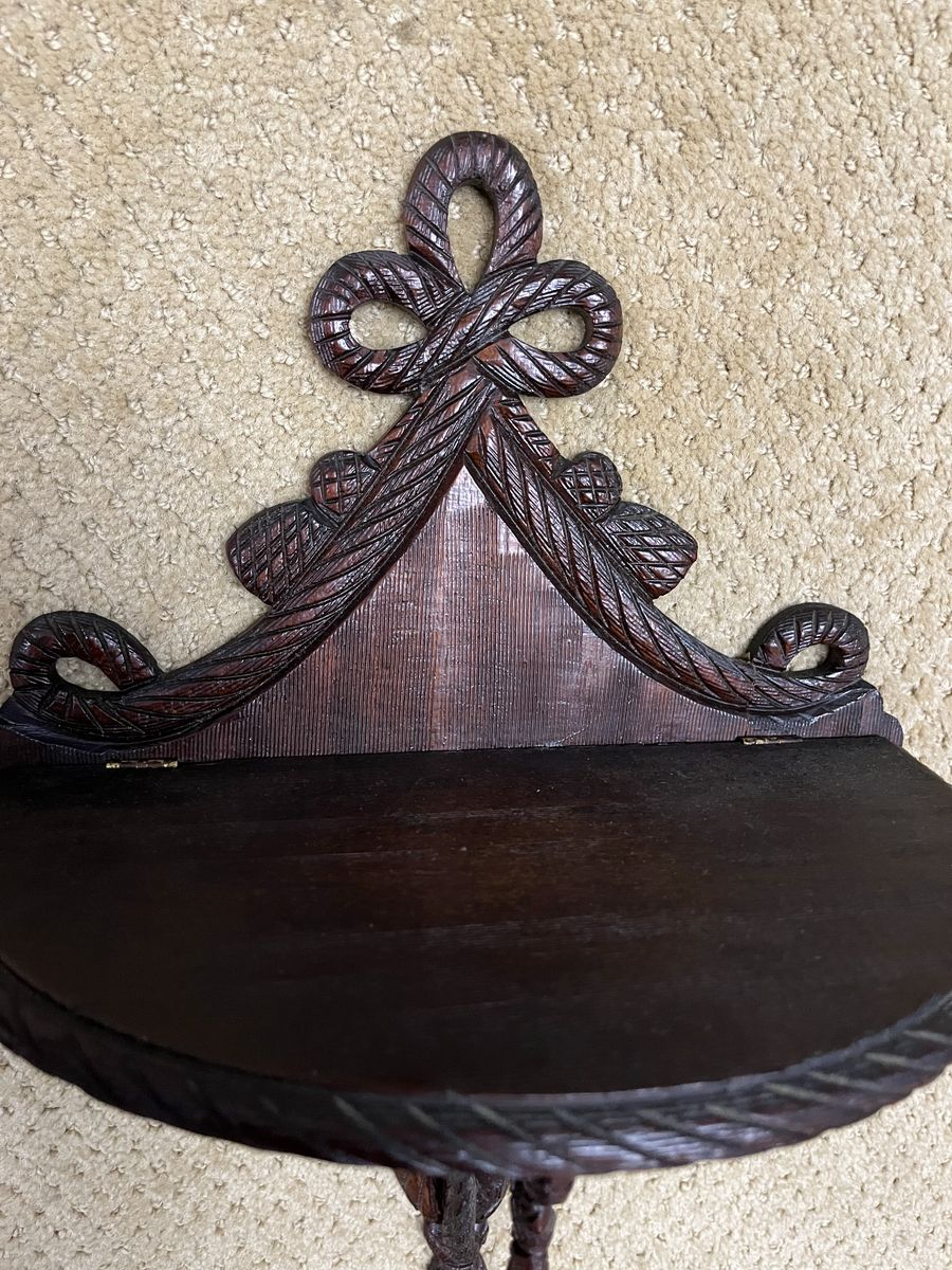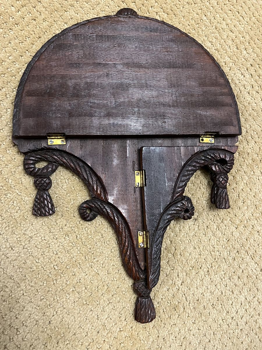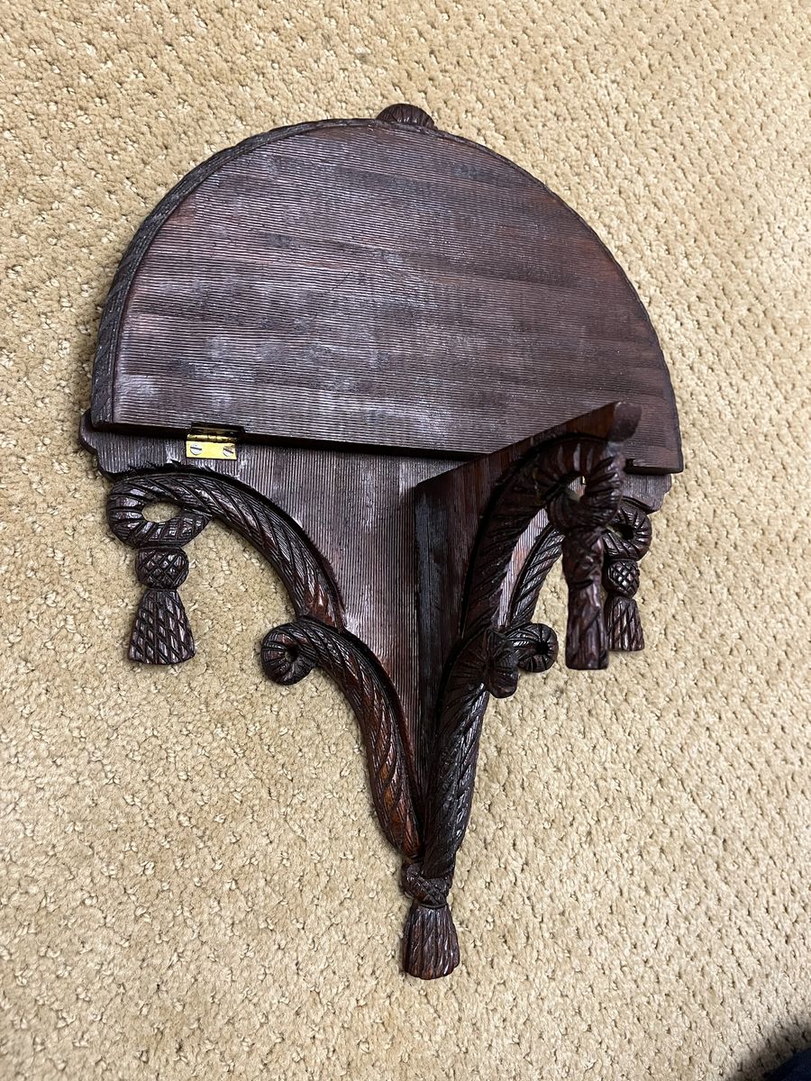 VenmoThis darling shelf is 15 inches tall x 11 inches wide. It is made from walnut wood. The curved shelf is 6 inches deep. It is decorated with six tassels and a bow pattern at the top. This is unique because the shelf has hinges and it will fold up. This is a beautiful and decorative shelf. It will add richness to your wall. Selling to help a parent. Price is firm.