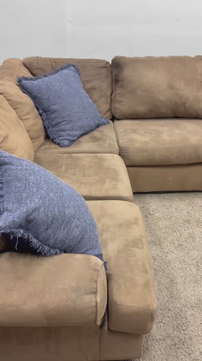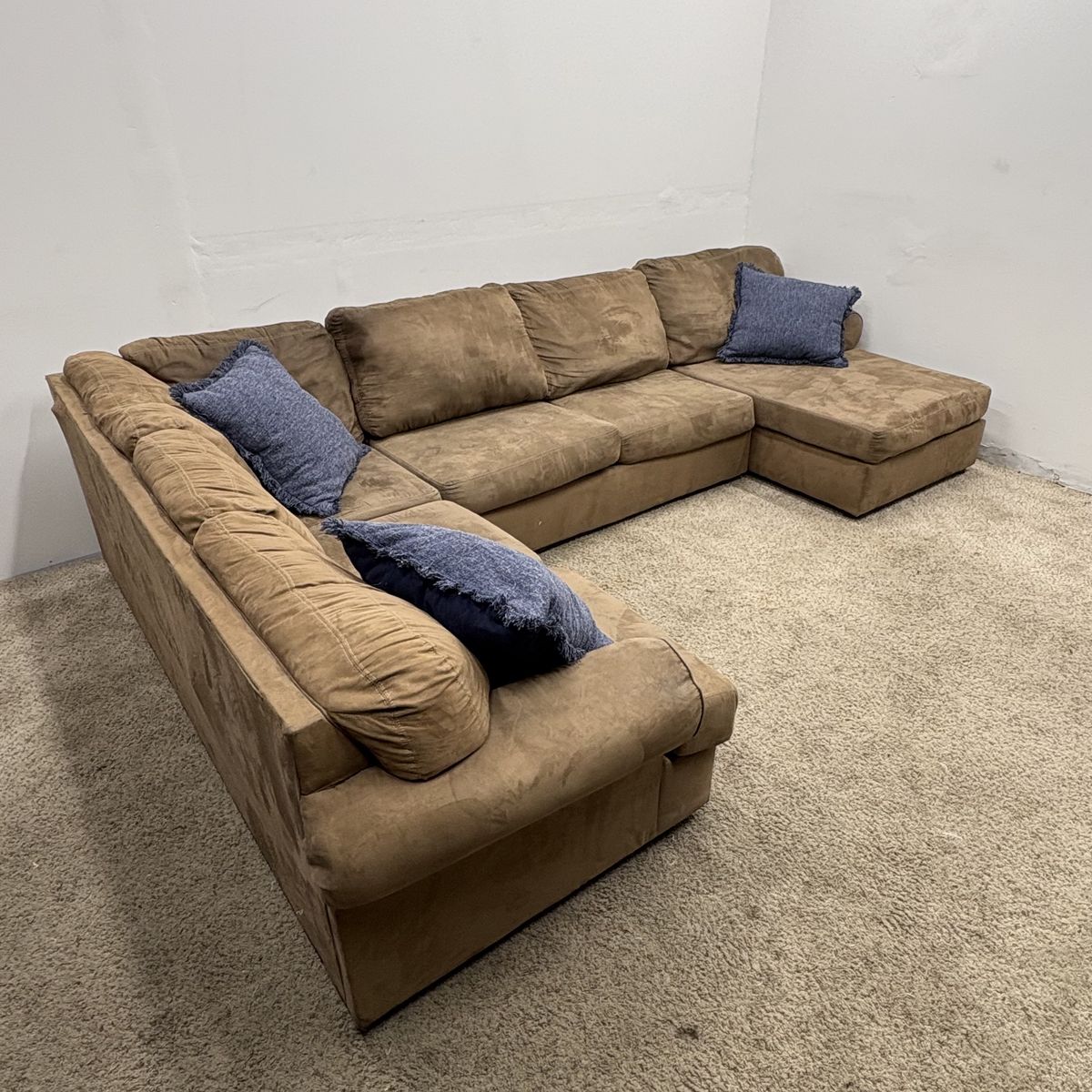 Spacious brown U-shaped sectional sofa. Comfy suede-like fabric. Chaise lounge on one end. Good for big living rooms. Watch video for more details