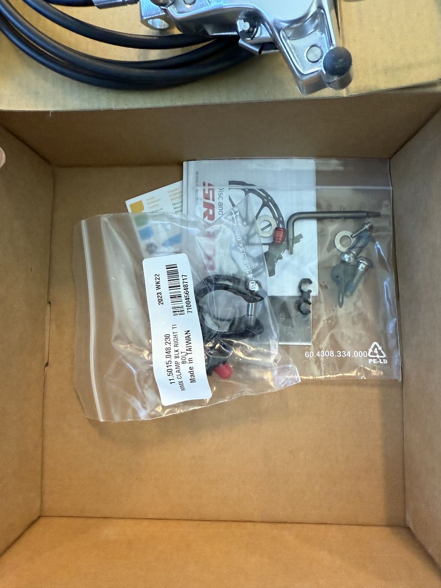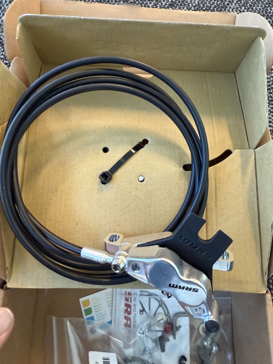 Selling a complete SRAM Level Silver Stealth 4-piston hydraulic disc brake set — both front and rear levers, calipers, and hoses — still brand new in the original box. Never installed, never used. Manufactured 2023 (Week 22).
