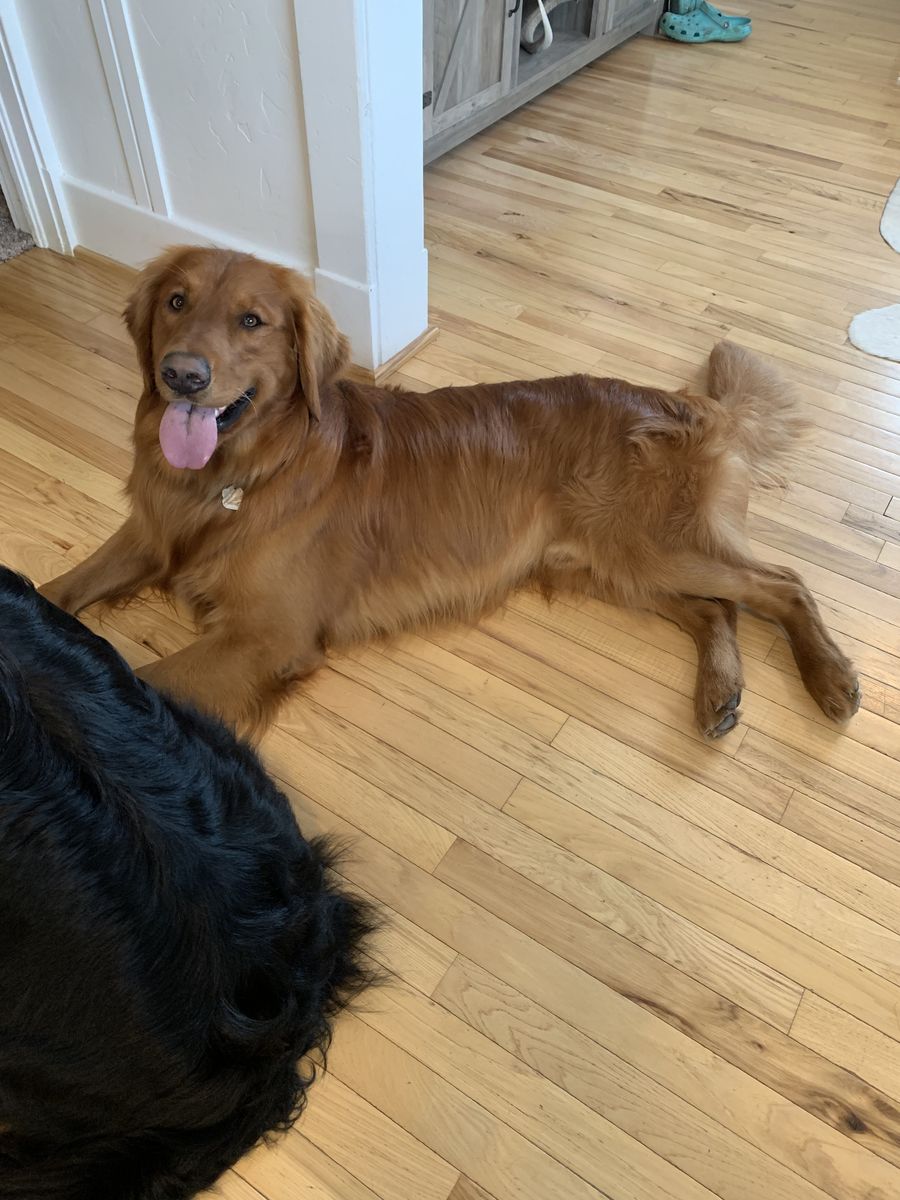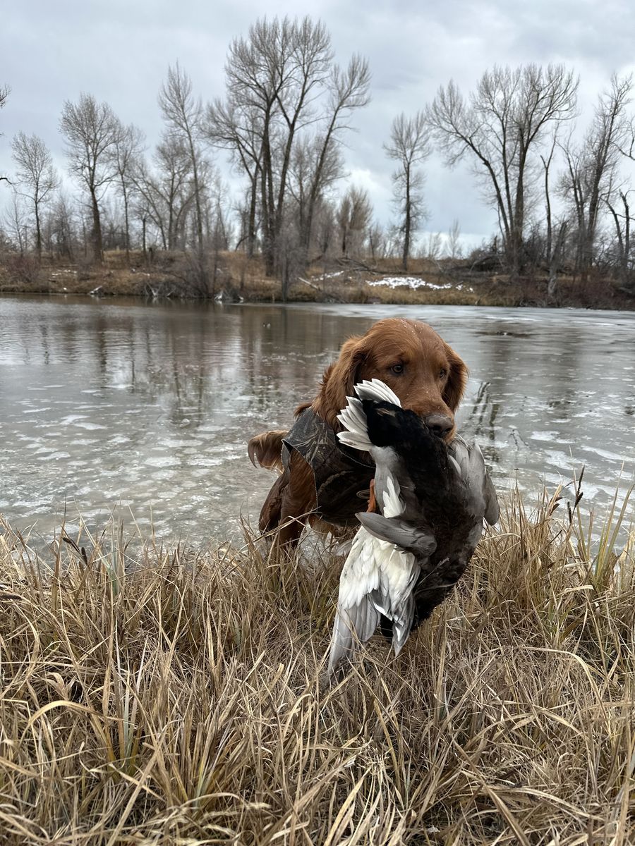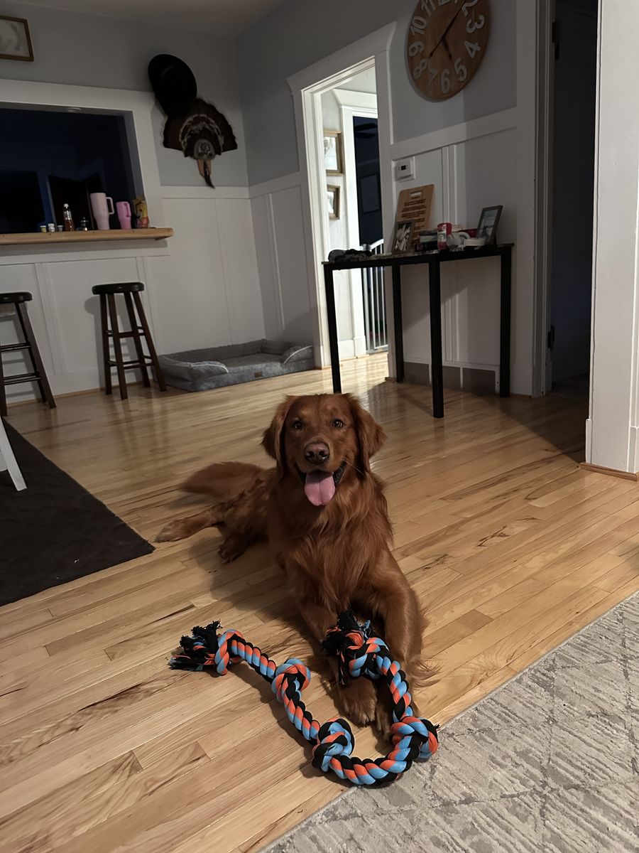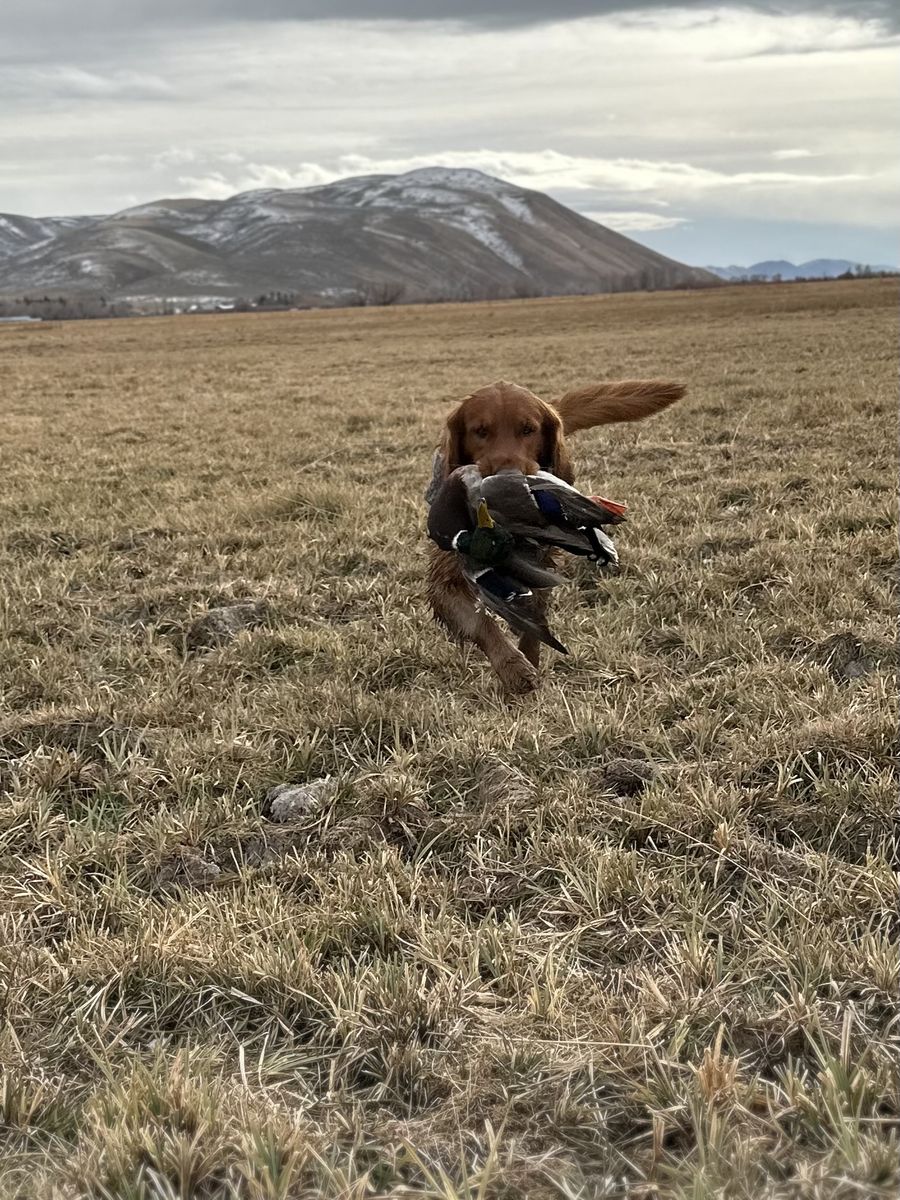 Wrangler is a 95 lb retriever with a red coat and muscular build. He is a great all around dog, house trained, family friendly, and retrieves waterfowl.