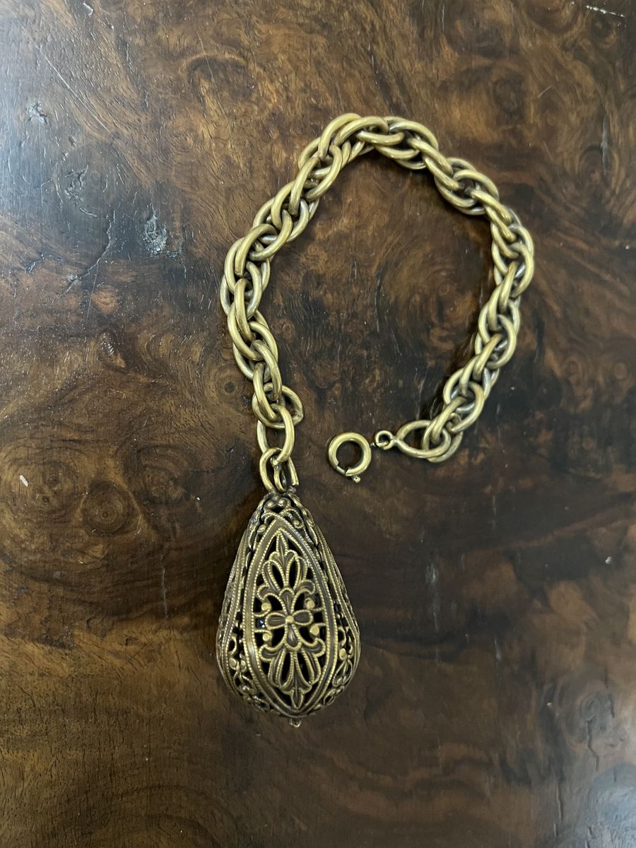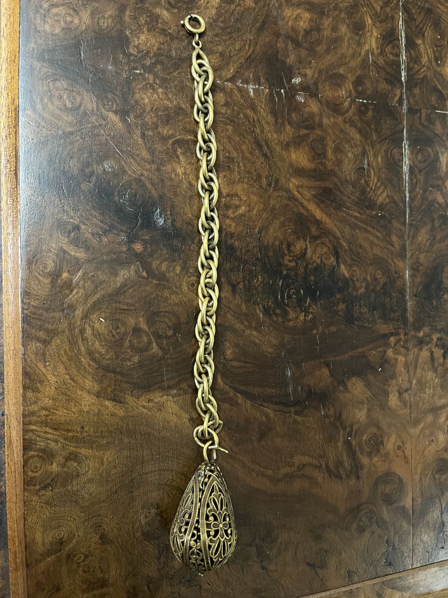 VenmoThis is a really interesting and fun bracelet. I believe it is from the 1950's-1960's. I was told you could dip the lovely detailed dangle part of the bracelet in perfume. Then every time you move your hand/arm you get a tiny scent. The chain measures 7 1/2 inches. The decorative dangle is 1 1/2 inches tall x 1 inch wide. This is a one of a kind bracelet. Selling for a parent. Price is firm.