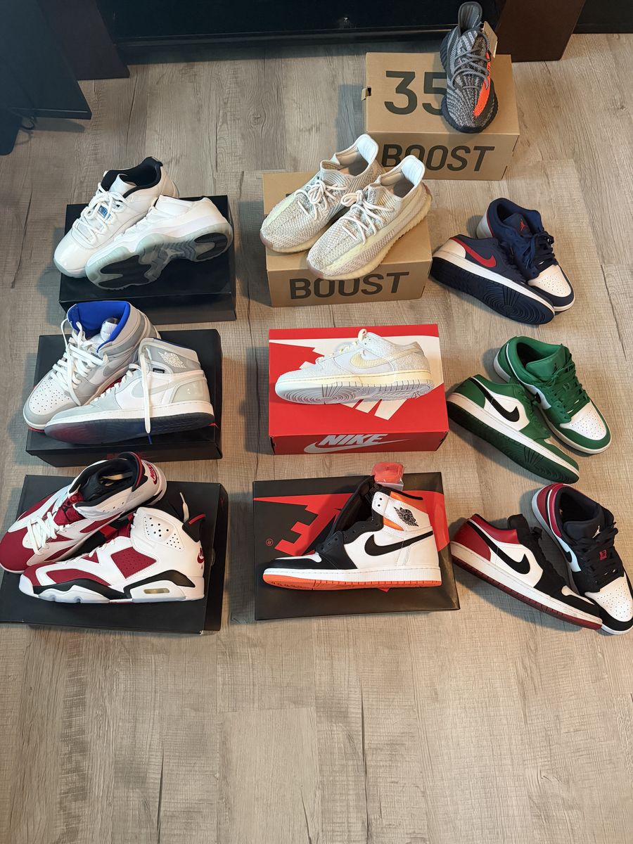 Size 10 Jordan 1 low pine green 9/10(no box) $200 Size 10 Jordan 1 low black toe 9/10(no box) $200 Size 10 Jordan 1 low USA 9/10 (no box) $180 Size 10 Nike dunk low chinook salmon (new) $100 Size 10 Jordan 1 High retro orange(new) $100 Size 10 Jordan 1 High racer blue 9/10 $220 Size 10 Jordan 6 Carmine(new) $200 Size 10 Jordan 11 low Legend blue 9/10 $220