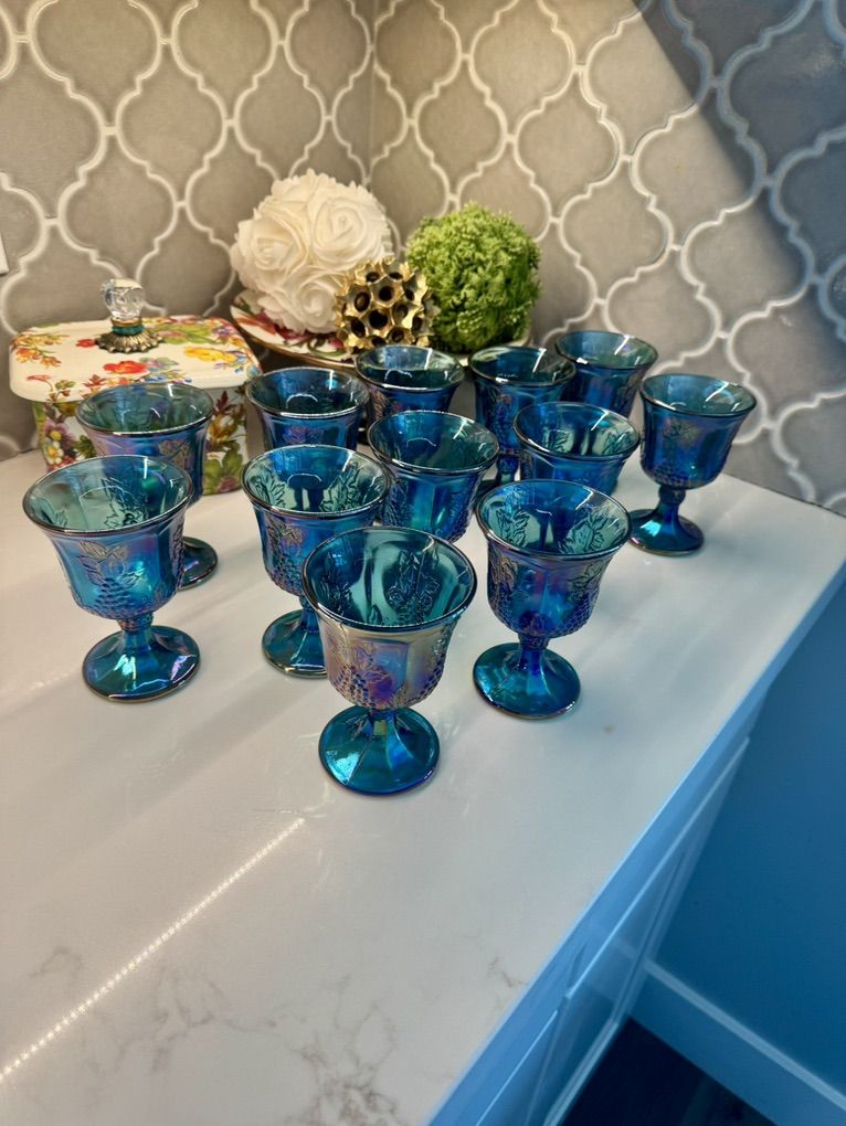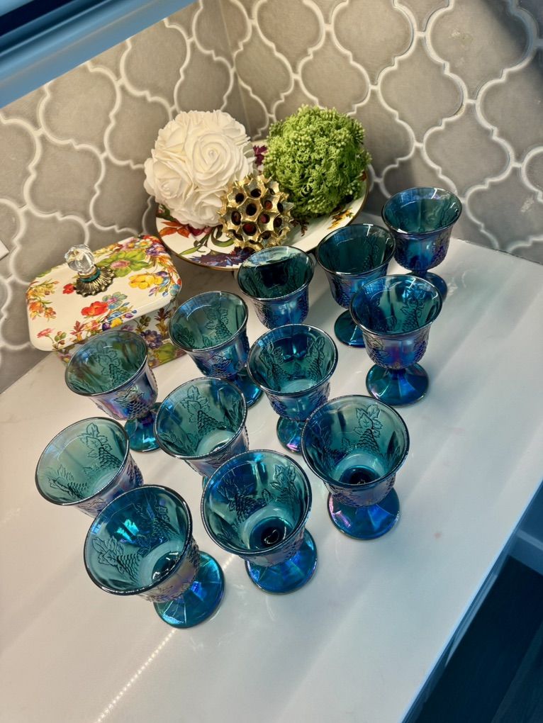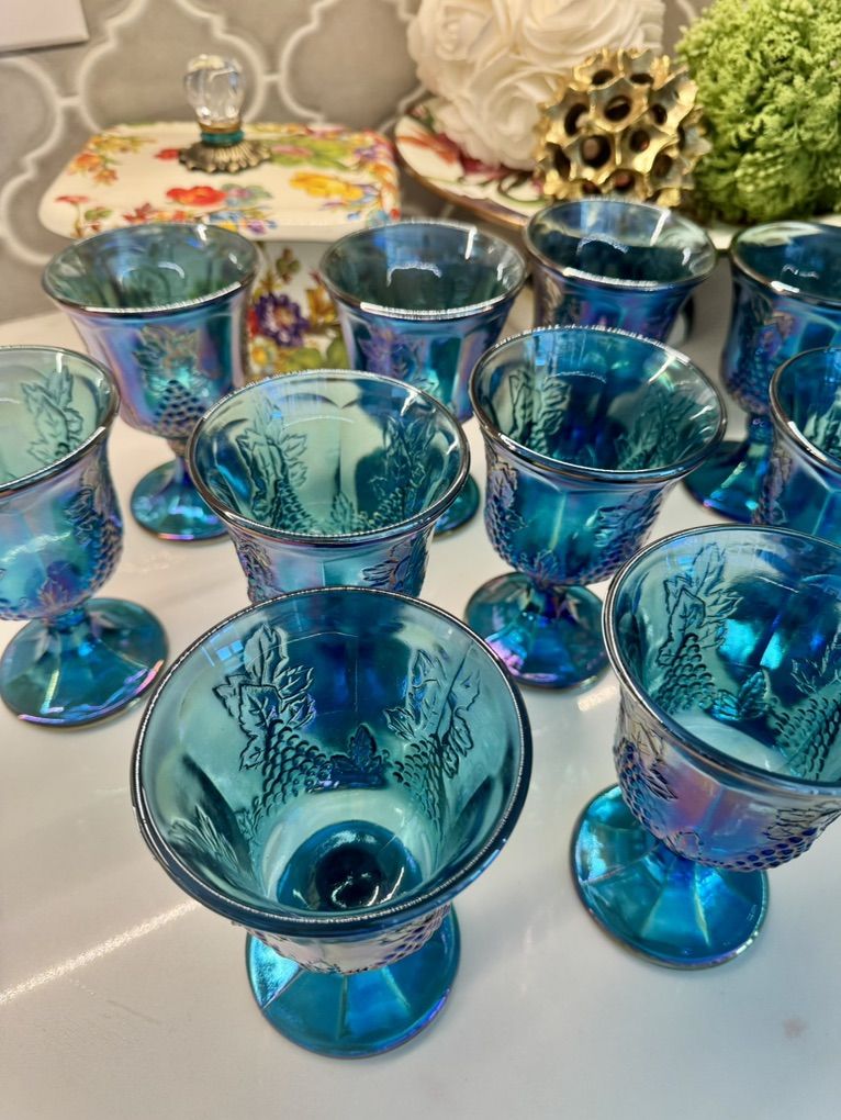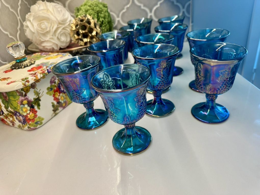 ApplePayBeautiful set of 12 iridescent blue carnival glass goblets featuring a grape pattern design. These have a stunning teal/blue finish with a rainbow-like sheen that shifts in the light-perfect for display, entertaining, or adding a vintage-inspired touch to your home. Details: • Set of 12 matching goblets • Grape and vine pattern • Iridescent carnival glass finish • Rich blue/teal coloring Condition: Pre-owned in great condition. No major chips or cracks observed. Light signs of normal use may be present. Perfect for: • Holiday tablescapes • Vintage decor lovers • Entertaining or display