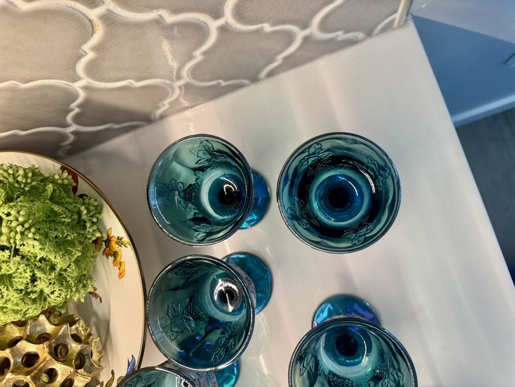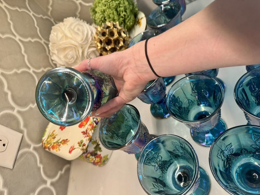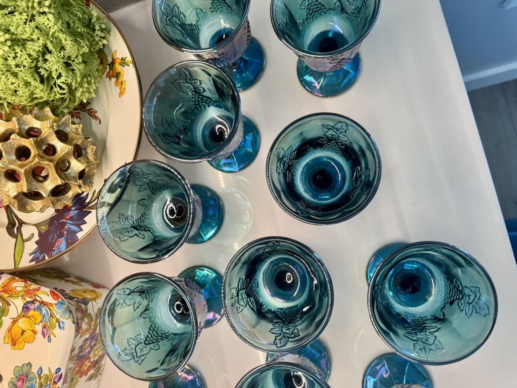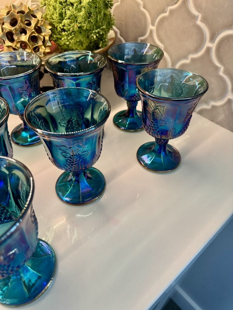 ApplePayBeautiful set of 12 iridescent blue carnival glass goblets featuring a grape pattern design. These have a stunning teal/blue finish with a rainbow-like sheen that shifts in the light-perfect for display, entertaining, or adding a vintage-inspired touch to your home. Details: • Set of 12 matching goblets • Grape and vine pattern • Iridescent carnival glass finish • Rich blue/teal coloring Condition: Pre-owned in great condition. No major chips or cracks observed. Light signs of normal use may be present. Perfect for: • Holiday tablescapes • Vintage decor lovers • Entertaining or display