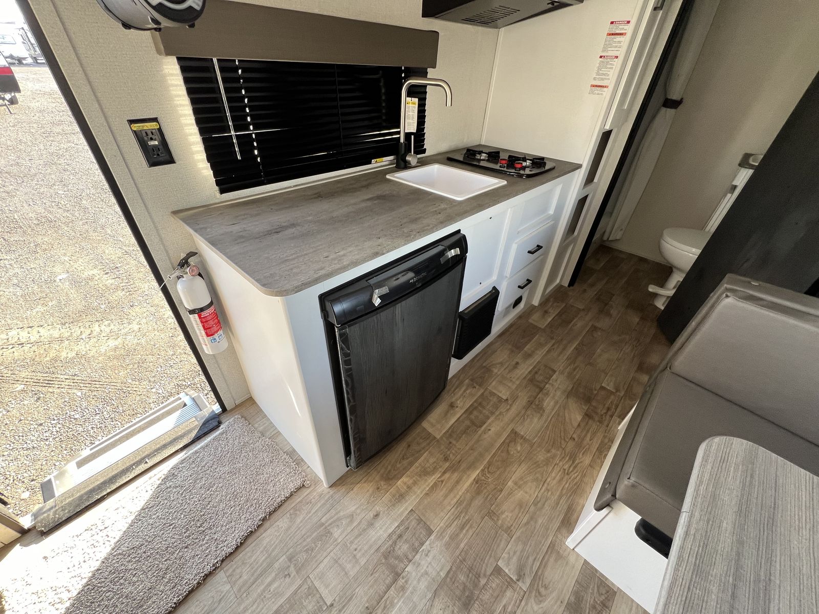 This bunkhouse sleeps up to 6. KEEPS IT SUPER SIMPLE WITH NO SLIDEOUT. It does come with solar! 1 YEAR WARRANTY.