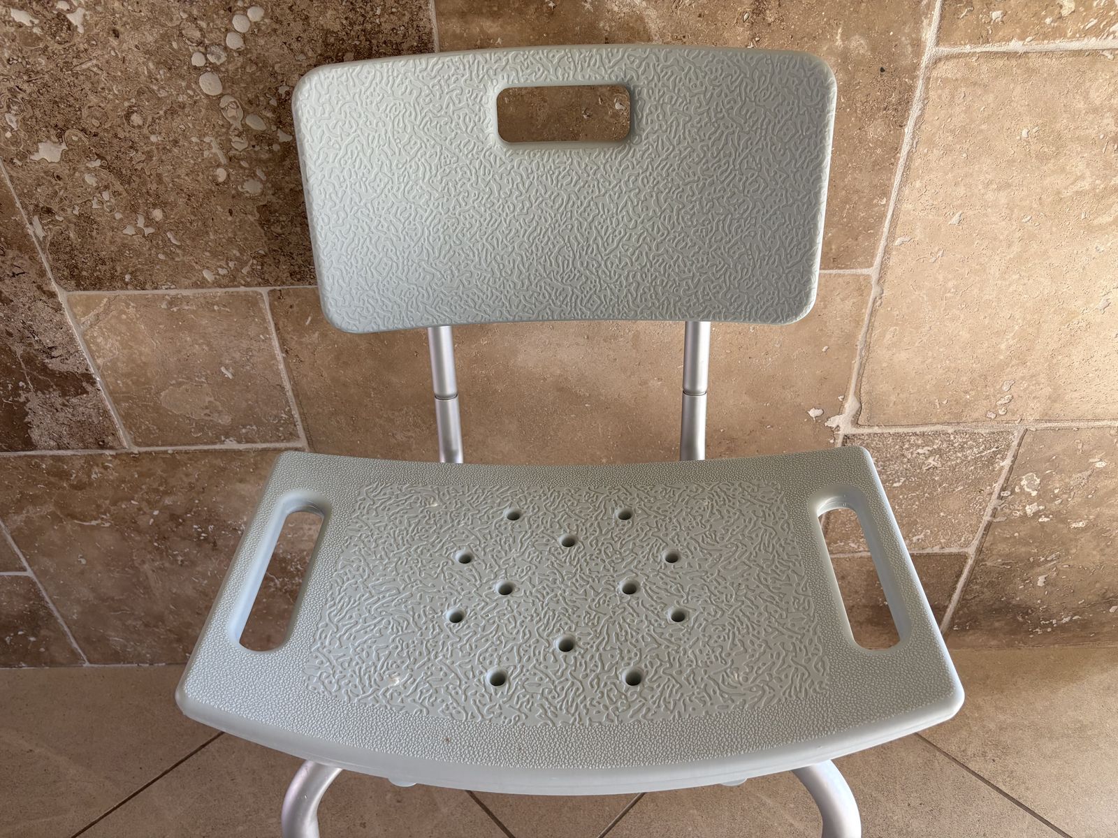 I have a gray Medline shower chair. The legs adjust for several different heights. It has a back but it could be removed. The seat is 20 inches wide. See my other ads for jewelry, artwork, home decor and more.