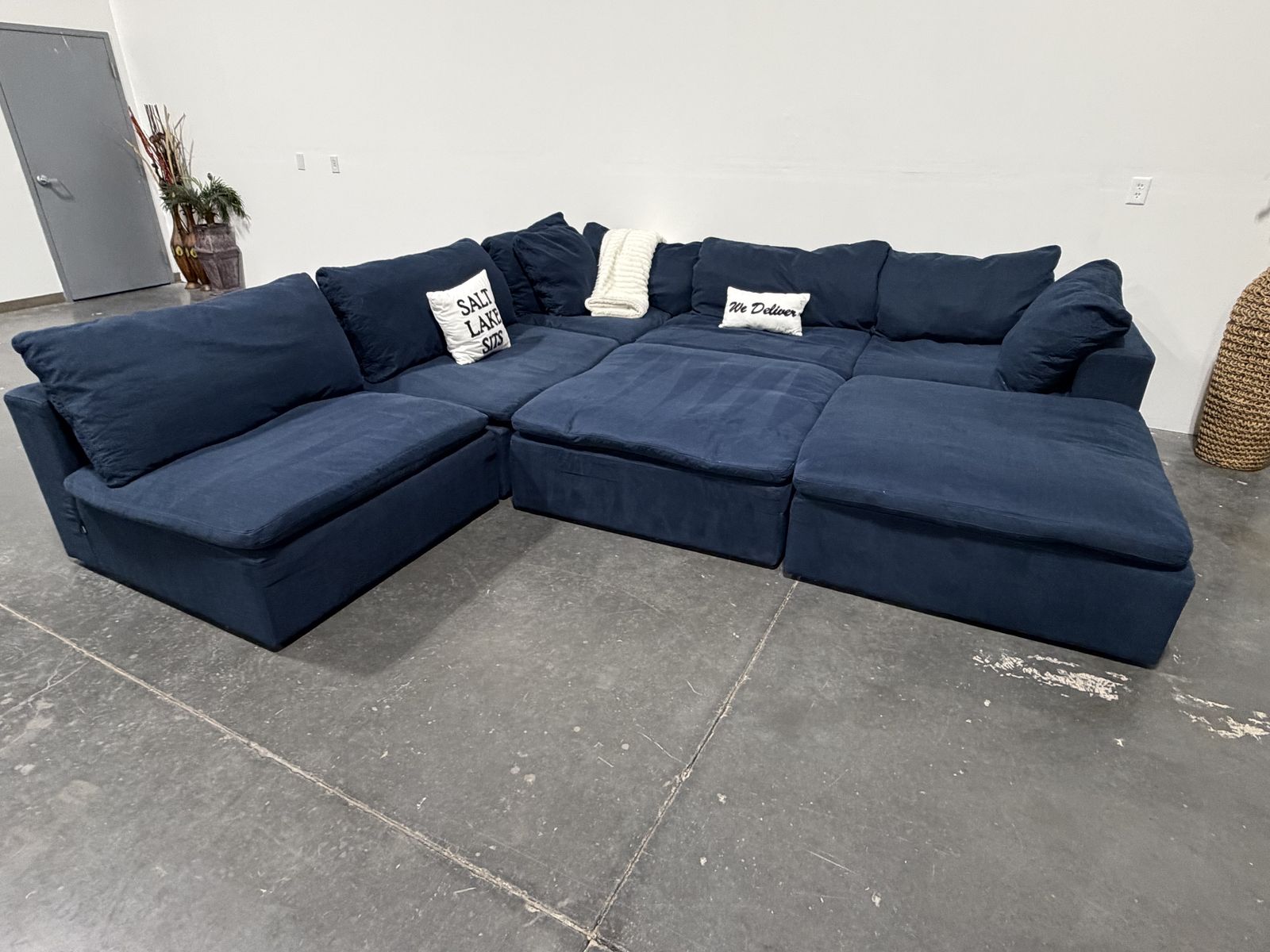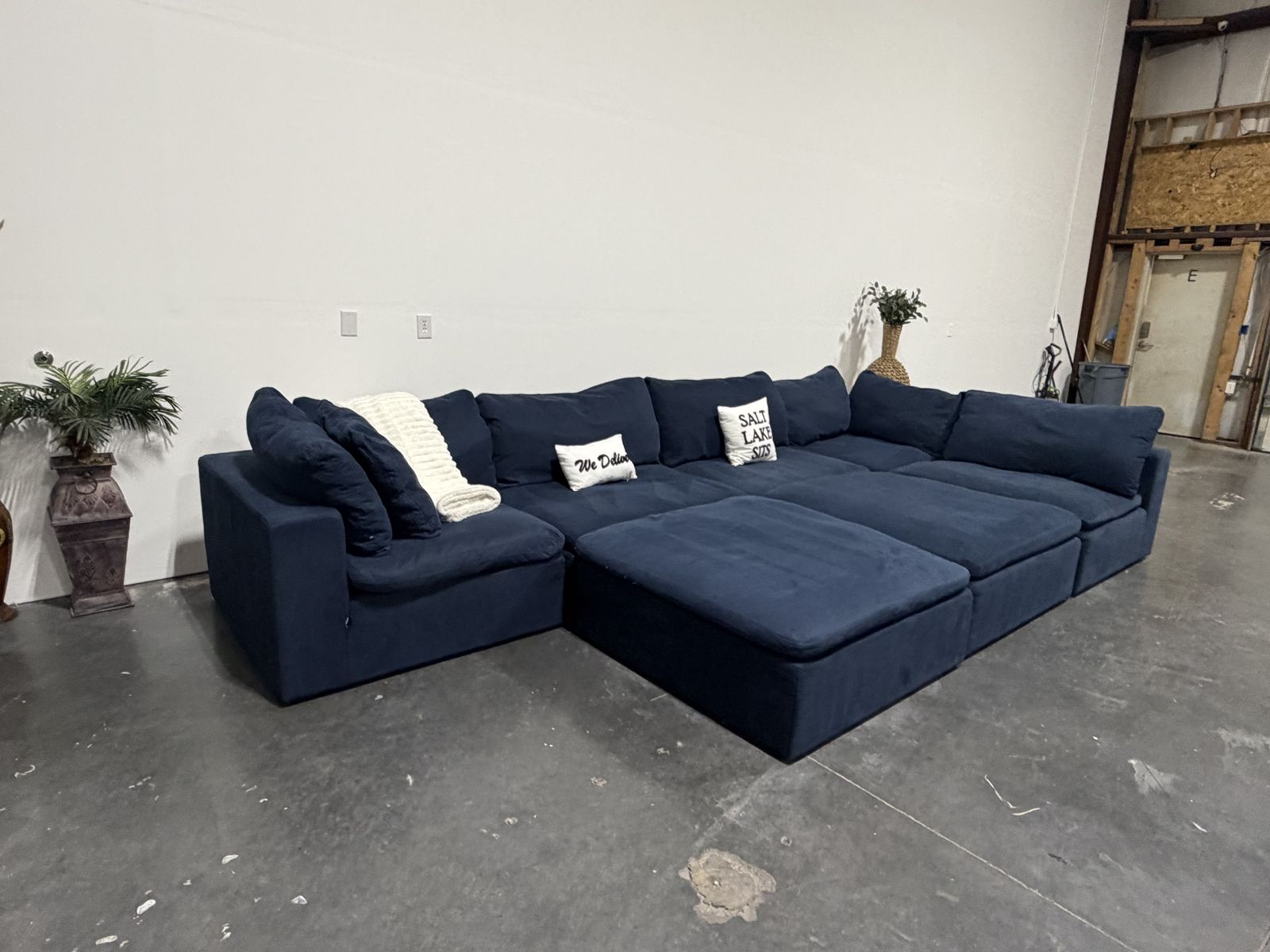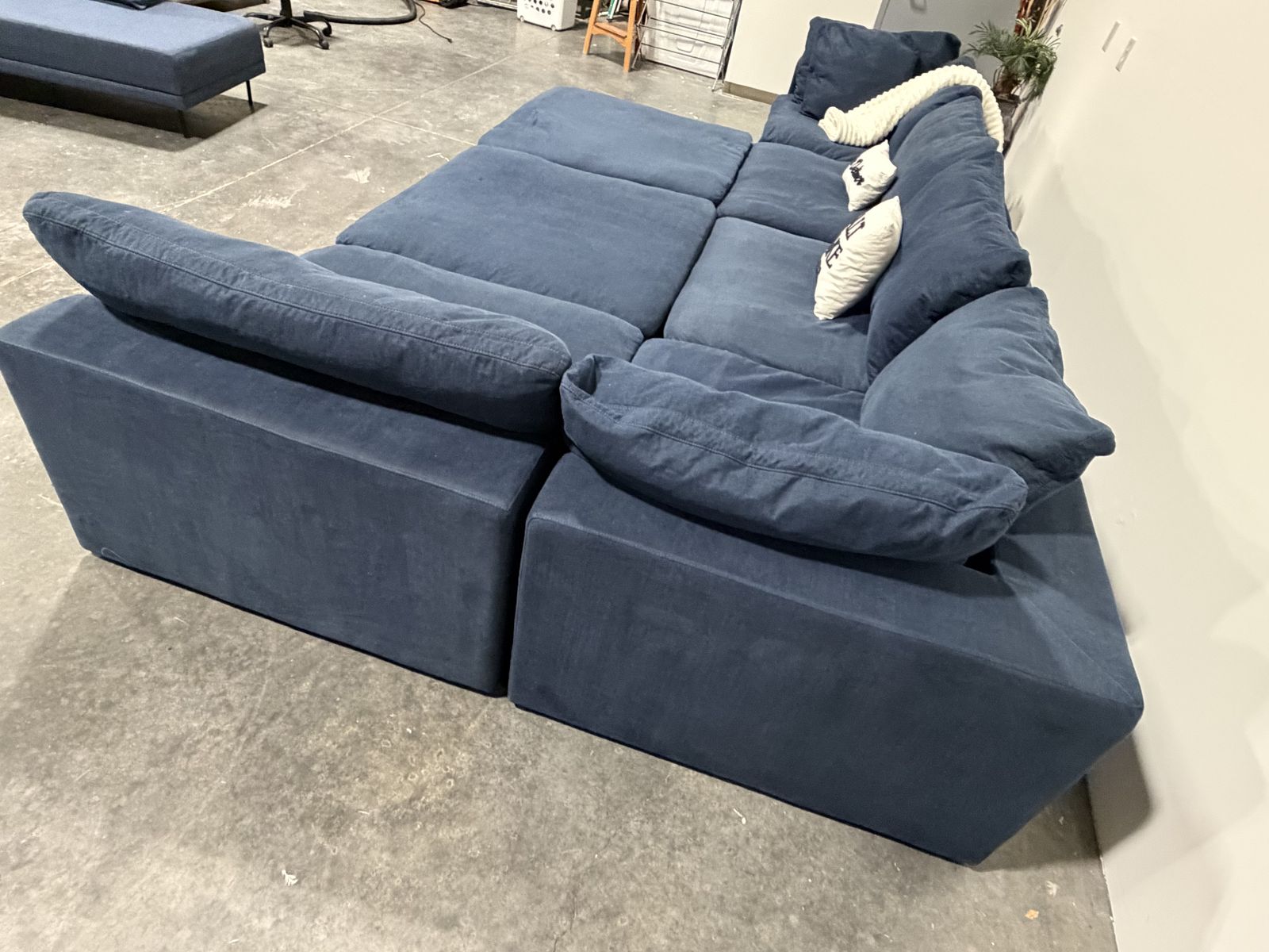 Retail Price: $4000 Your Price: $1300 43.5”x43.5” per piece Cleaned , Delivery Available. Deep navy down east luxe feather modular cloud-style sectional with a super soft, lounge feel and oversized seating. Very comfortable and great for stretching out or fitting multiple people. Modular design allows you to move pieces around to fit your space. Clean look with a rich color that works well in most interiors. Good overall condition.