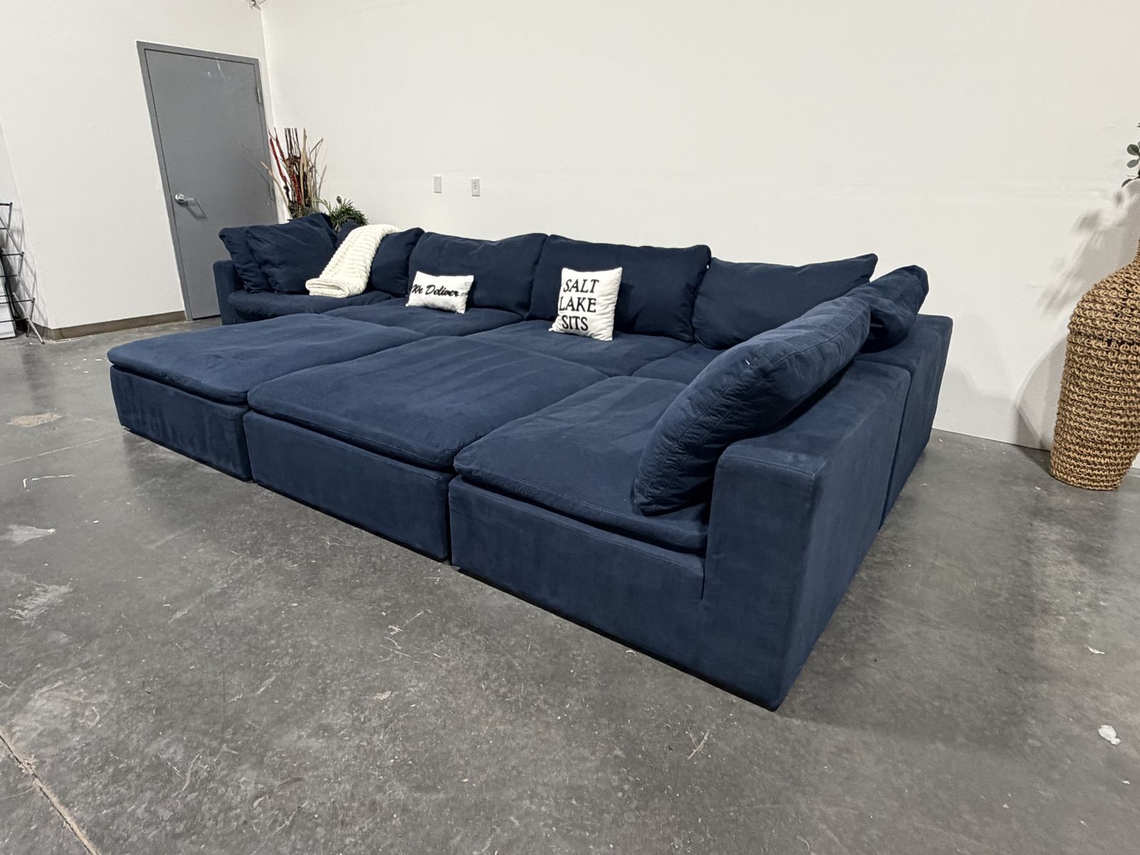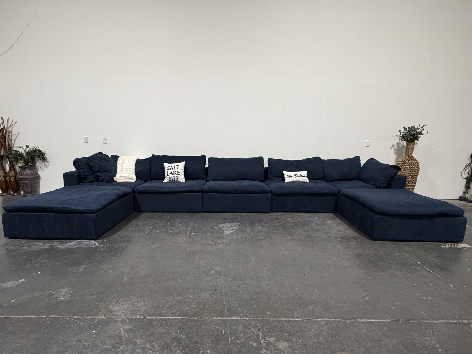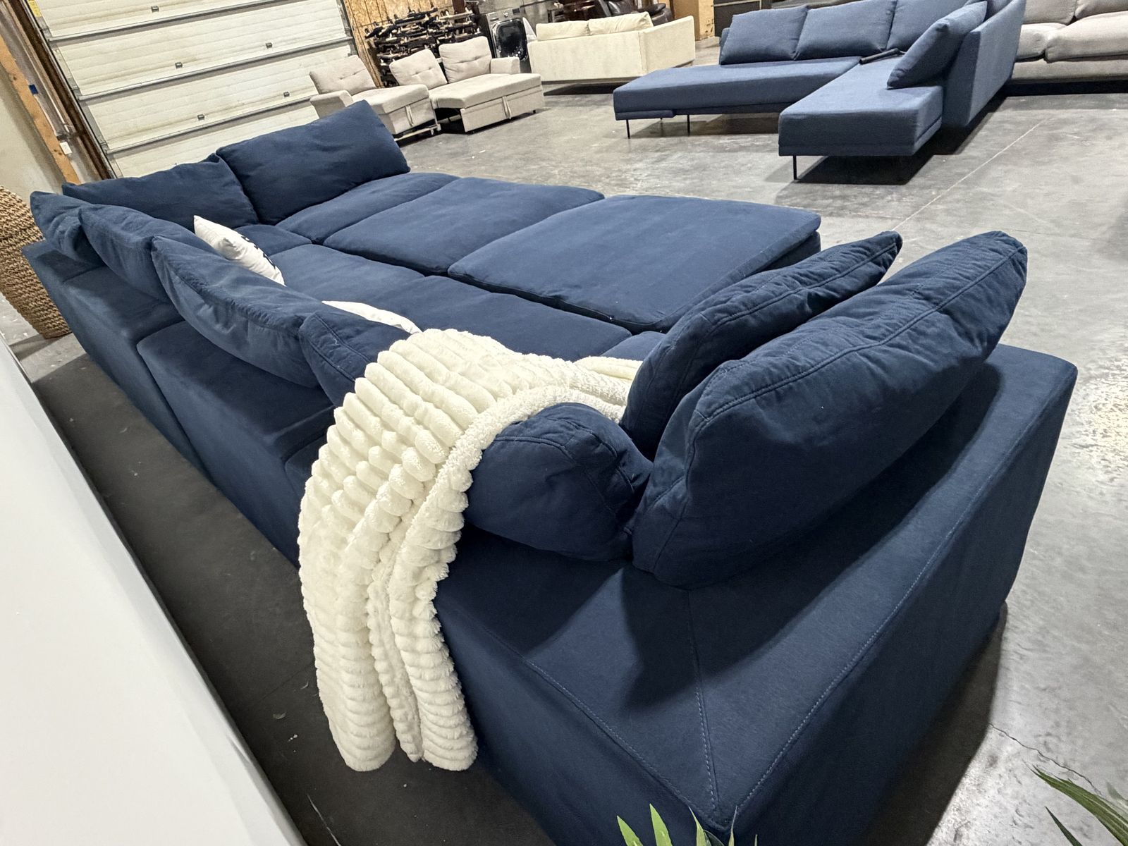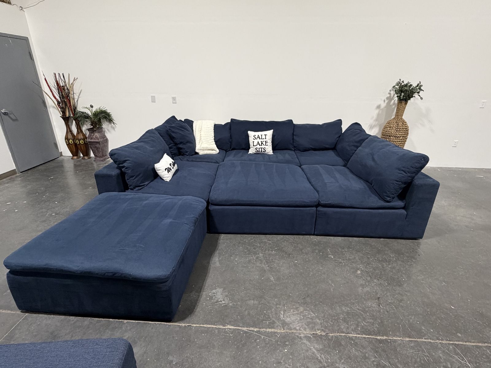 Retail Price: $4000 Your Price: $1300 43.5”x43.5” per piece Cleaned , Delivery Available. Deep navy down east luxe feather modular cloud-style sectional with a super soft, lounge feel and oversized seating. Very comfortable and great for stretching out or fitting multiple people. Modular design allows you to move pieces around to fit your space. Clean look with a rich color that works well in most interiors. Good overall condition.