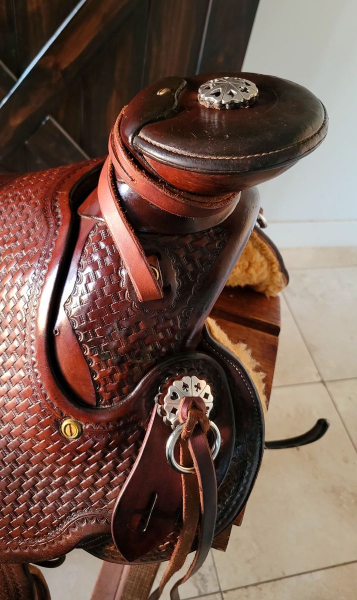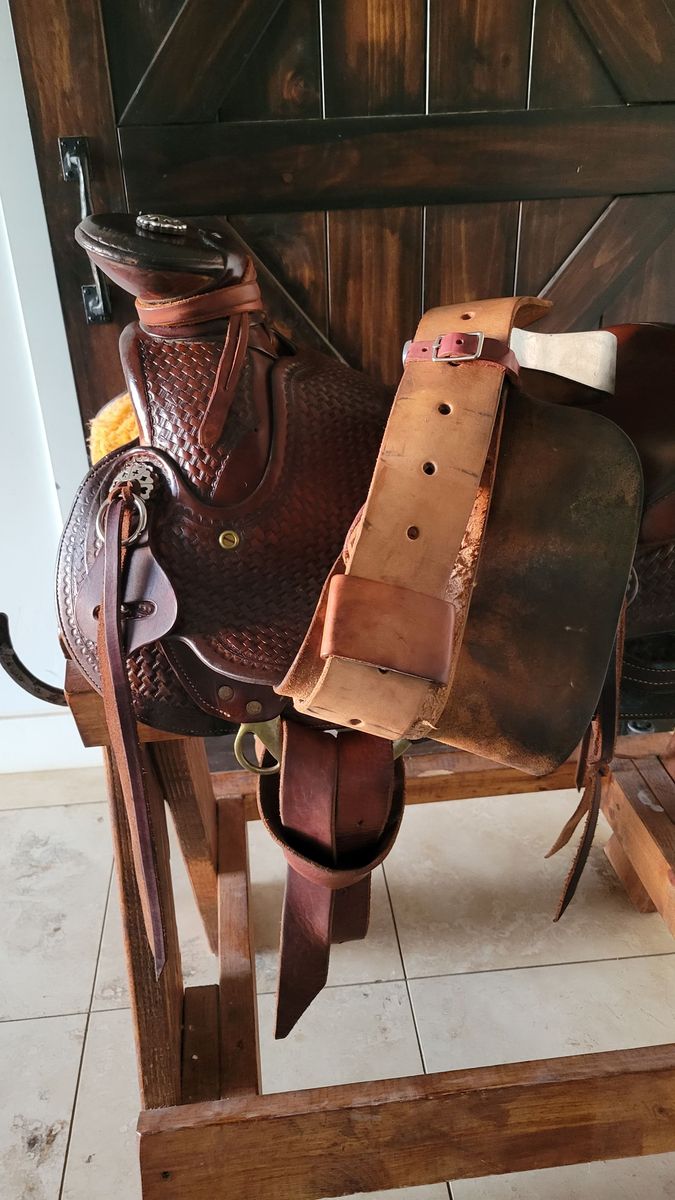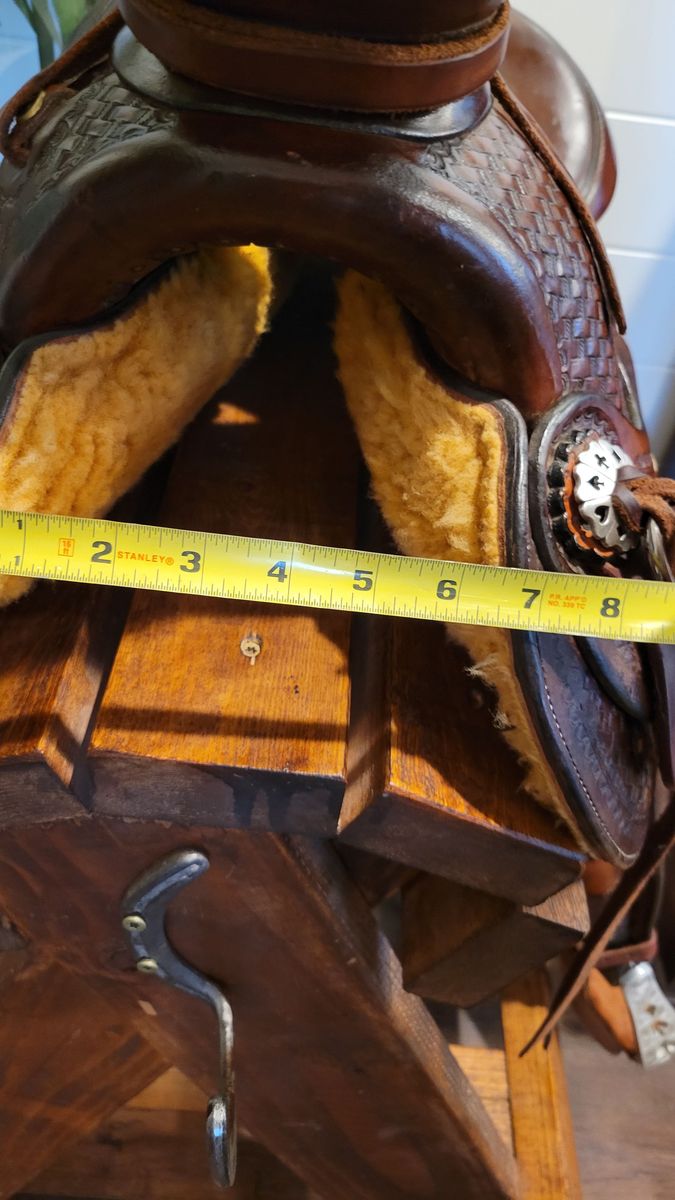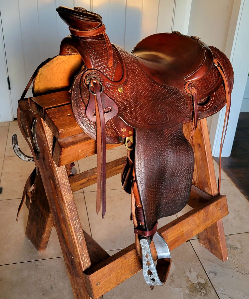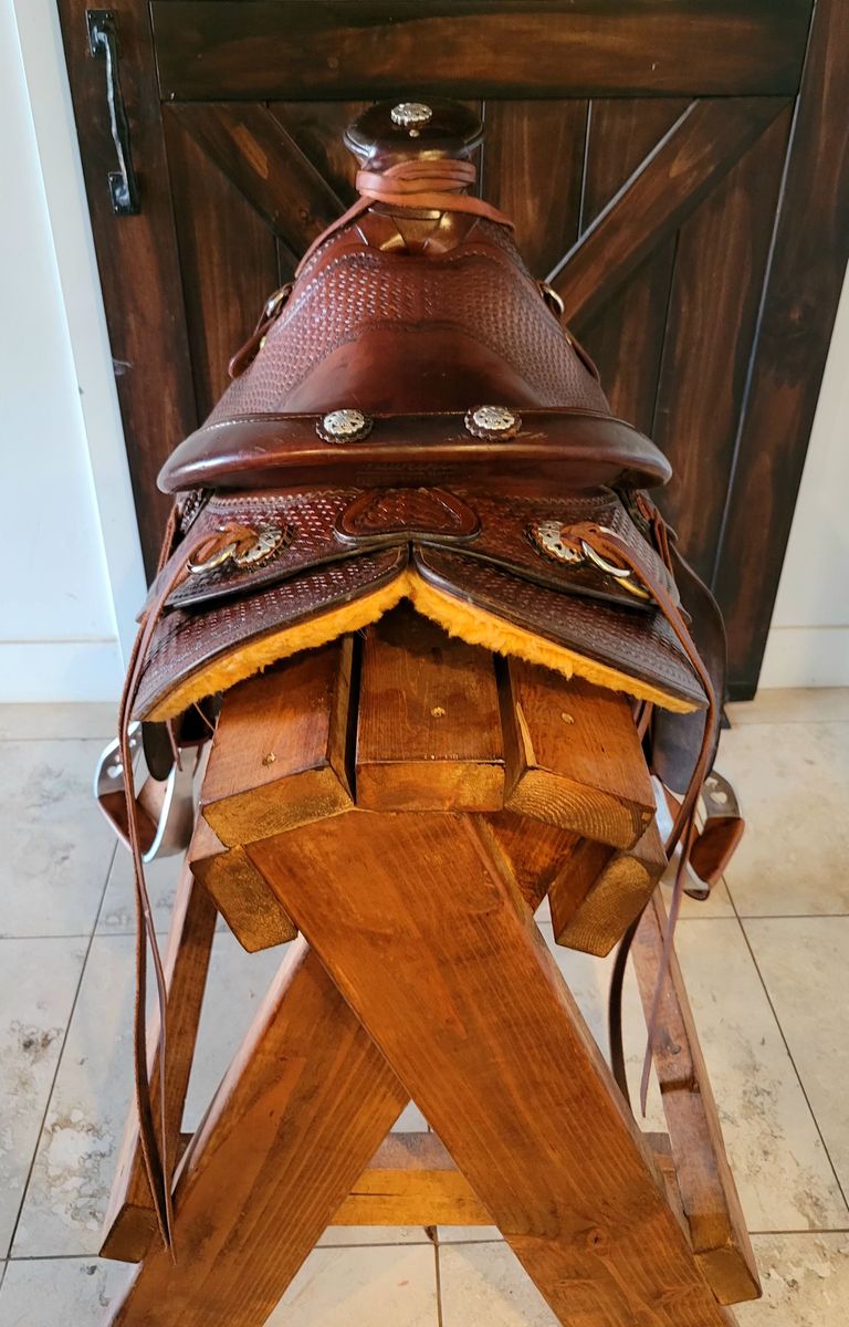 Vintage George Lawrence Wade Ranch Saddle in good condition. Nice vintage Saddle. Upgraded poker stirrups and conchos. Gorgeous saddle. Genuine sheepskin underside. Rawhide covered hardwood tree. Pre-turned stirrups. Lots of life left for use--or set it up as a decoration. 6.5" gullet. 14.5" seat. 5.5" diameter horn. Cash firm