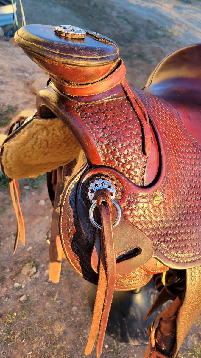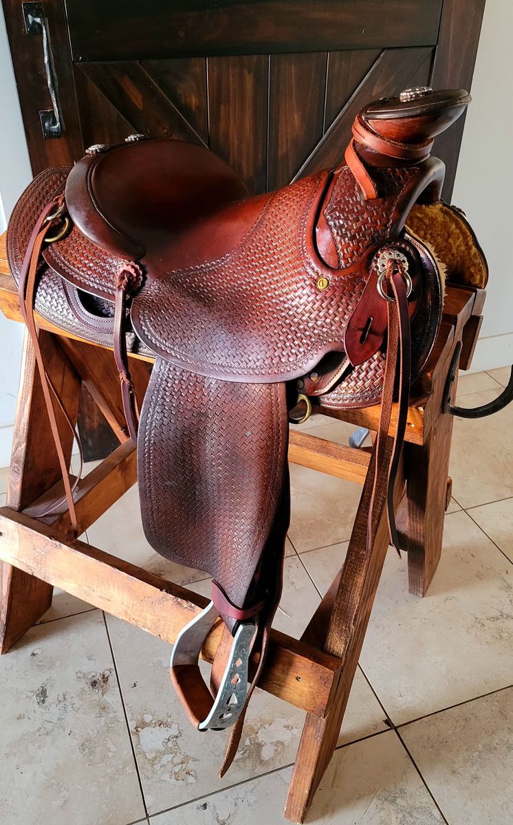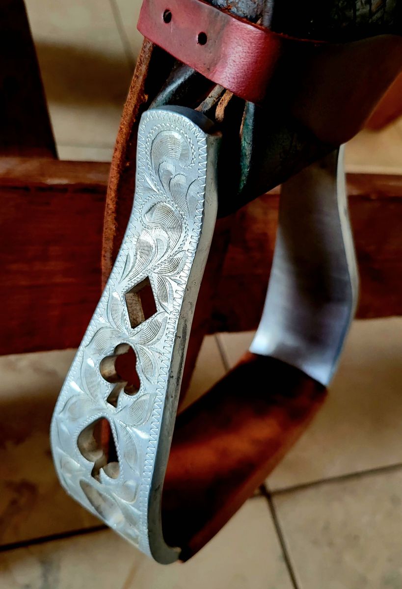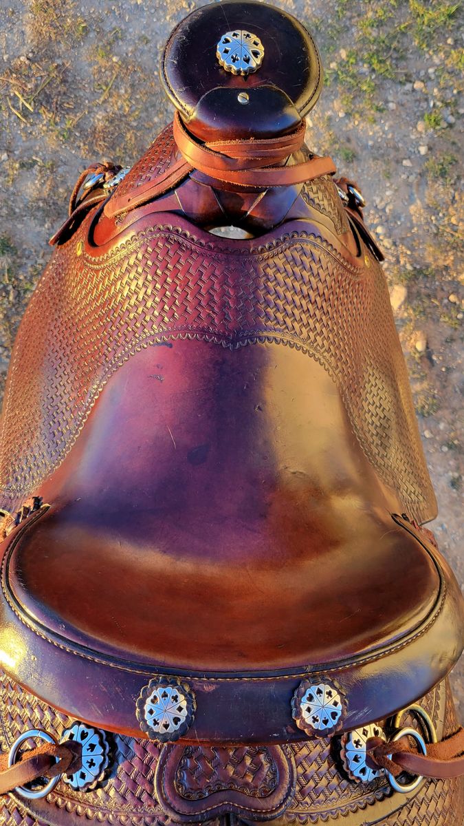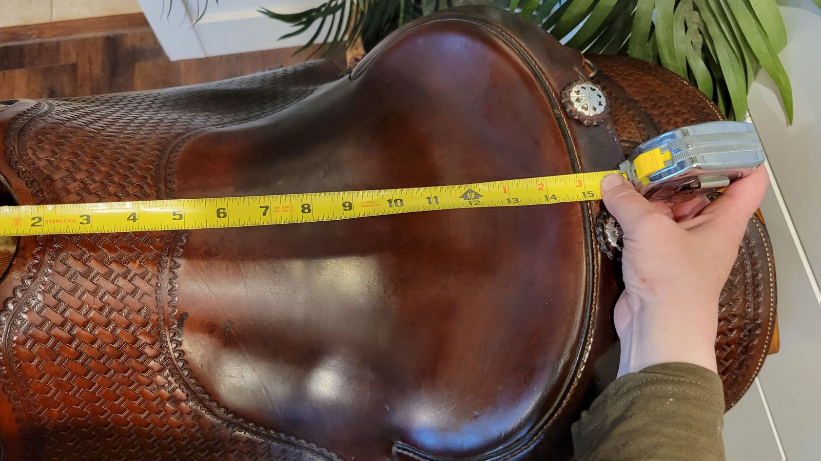 Vintage George Lawrence Wade Ranch Saddle in good condition. Nice vintage Saddle. Upgraded poker stirrups and conchos. Gorgeous saddle. Genuine sheepskin underside. Rawhide covered hardwood tree. Pre-turned stirrups. Lots of life left for use--or set it up as a decoration. 6.5" gullet. 14.5" seat. 5.5" diameter horn. Cash firm
