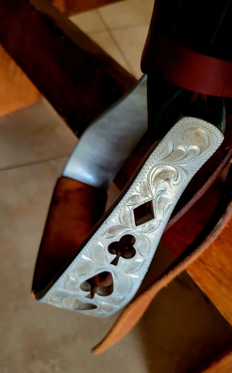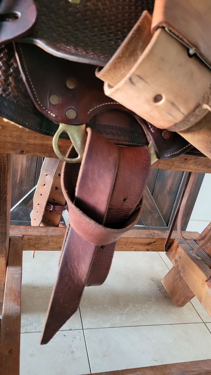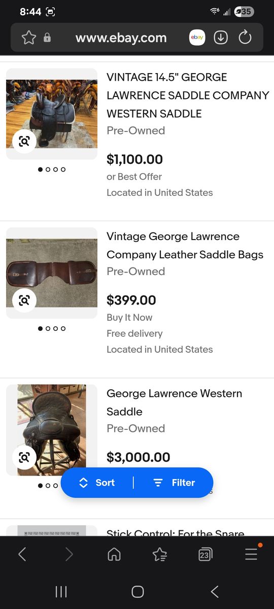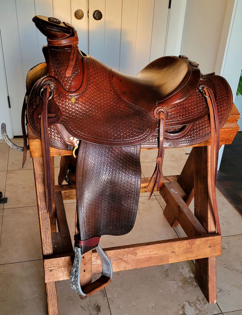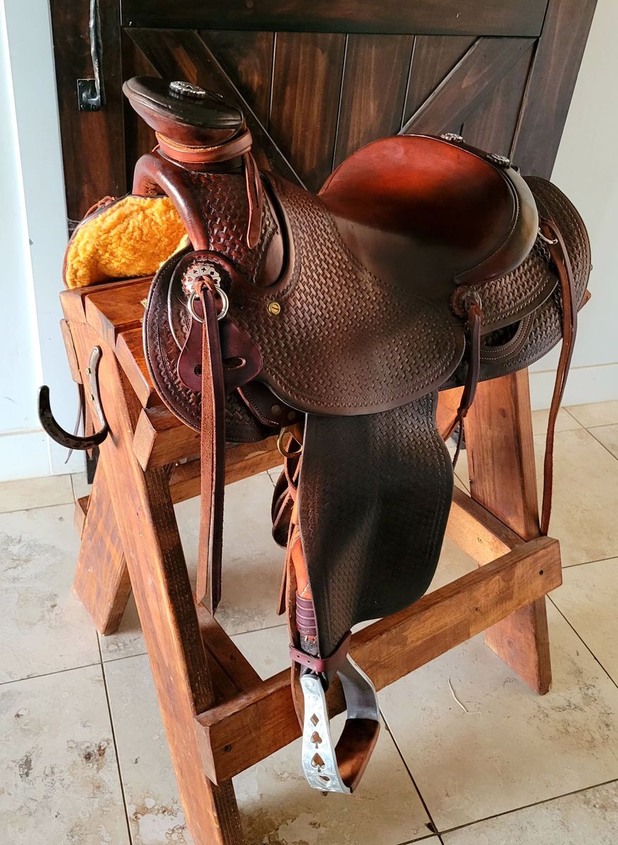 Vintage George Lawrence Wade Ranch Saddle in good condition. Nice vintage Saddle. Upgraded poker stirrups and conchos. Gorgeous saddle. Genuine sheepskin underside. Rawhide covered hardwood tree. Pre-turned stirrups. Lots of life left for use--or set it up as a decoration. 6.5" gullet. 14.5" seat. 5.5" diameter horn. Cash firm