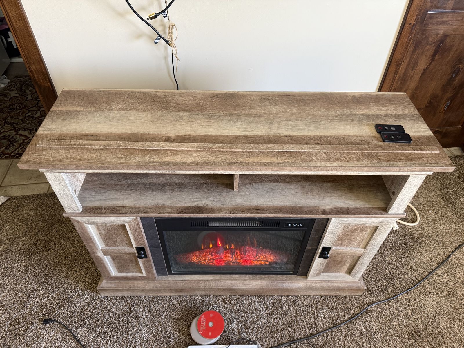 VenmoTv stand with electric fireplace and 2 remotes.