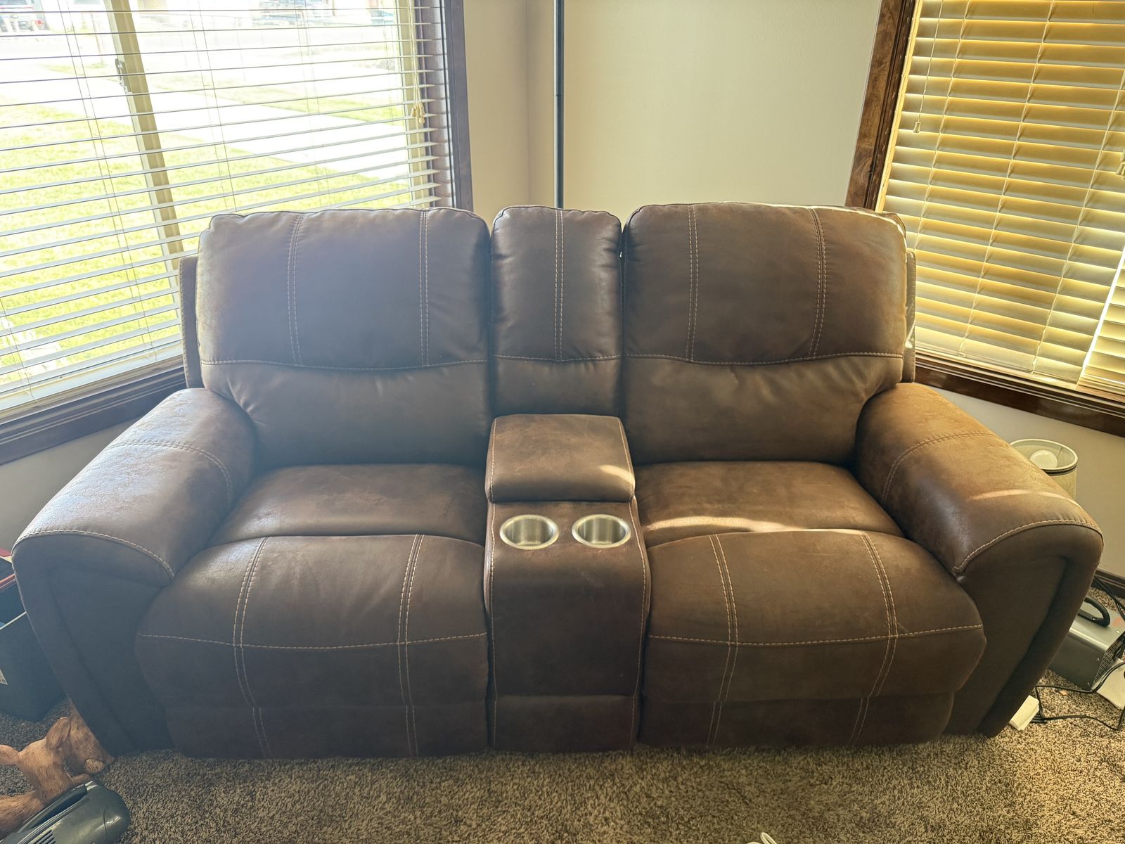Venmo2 Reclining Electric leather couches with 2 USB ports each. The smaller couch has a small storage compartment as well. The smaller couch’s dimensions are 75” long, 39” tall, & 32” wide, fully reclined it is 64” wide. The larger couch’s dimensions are 84” long, 39” tall, & 32” wide, fully reclined it is 64” wide. Sold only as a pair.